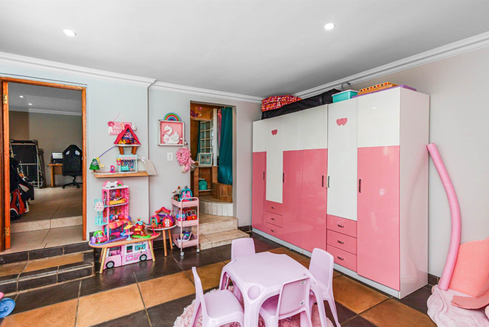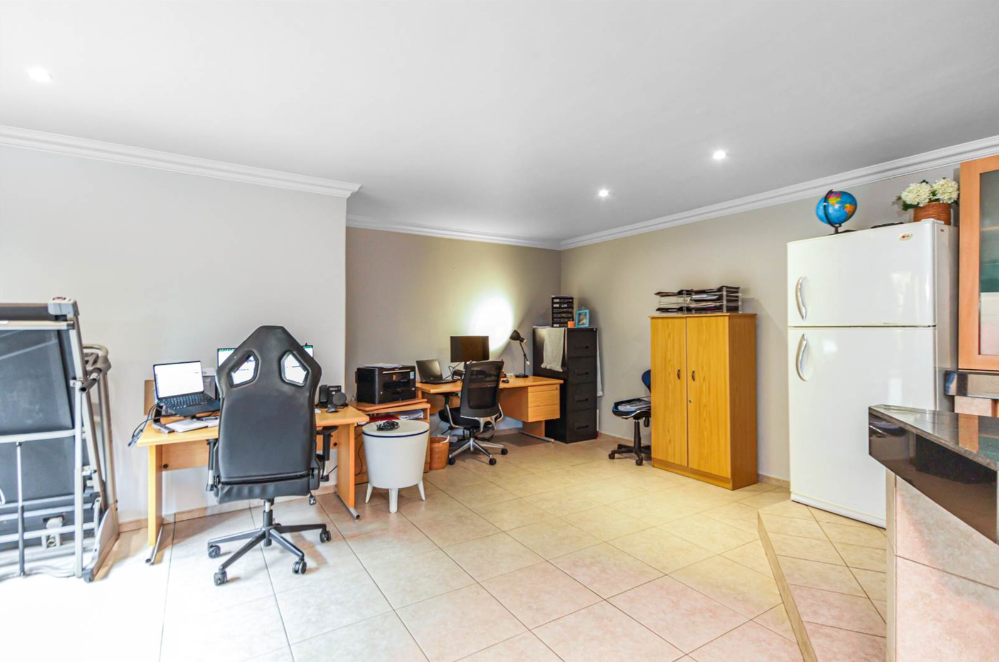 Flowing from the kitchen is a versatile, light-filled room currently used as an office, featuring large aluminium windows and stackable doors that invite the outdoors in. This space also includes a built-in braai, making it ideal for both work and entertaining.
