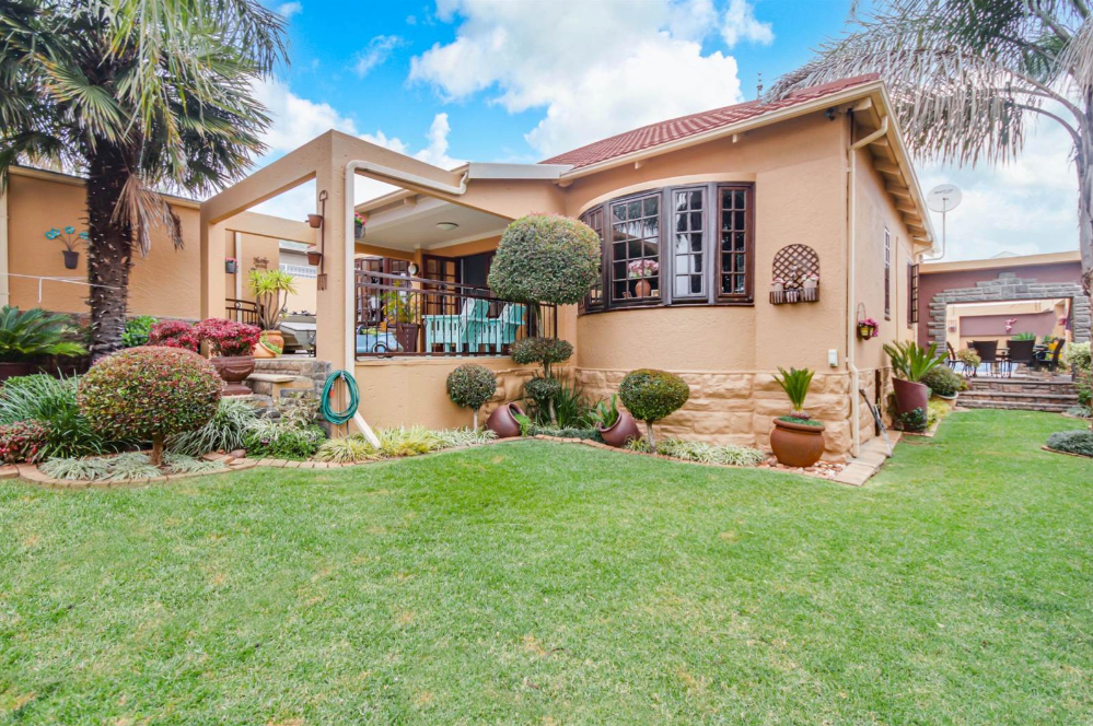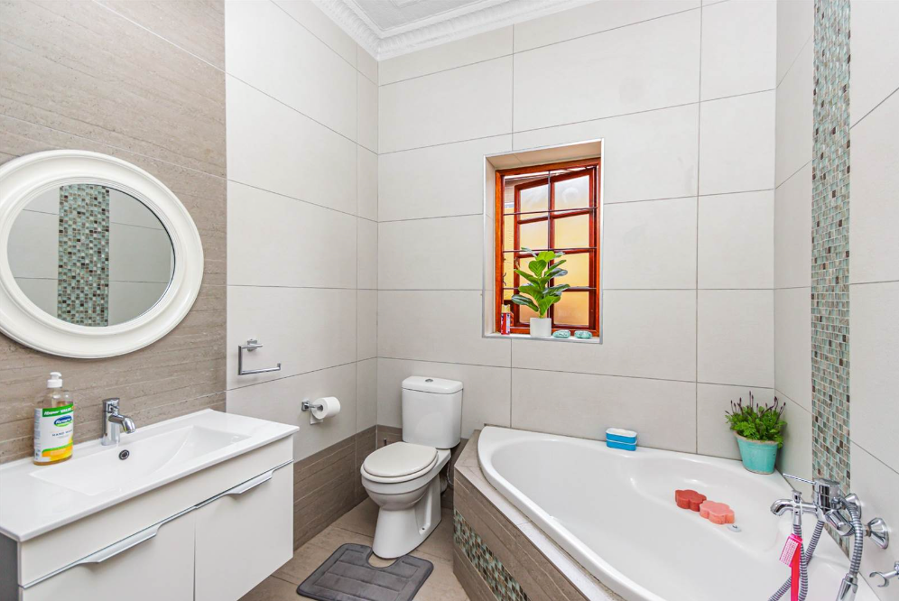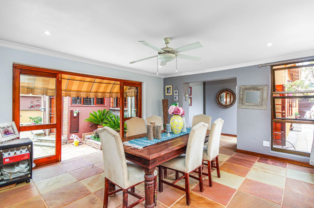 The backyard is designed for lifestyle living, offering a covered seating and braai area with a skylight, all overlooking a sparkling swimming pool perfect for relaxed weekends and hosting guests.