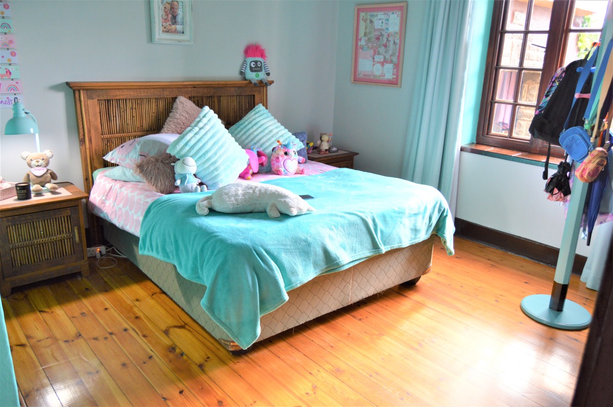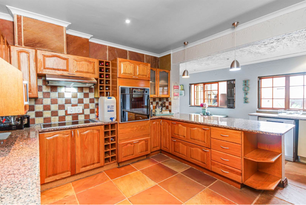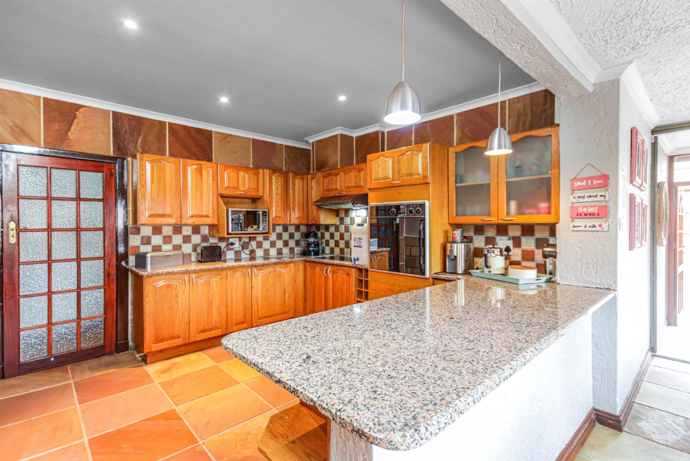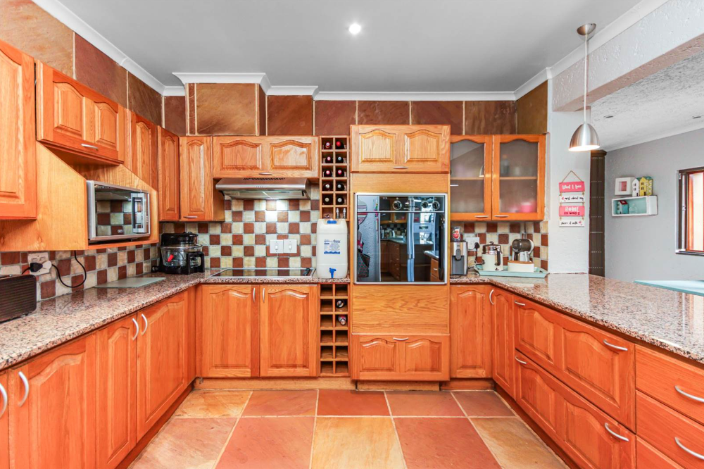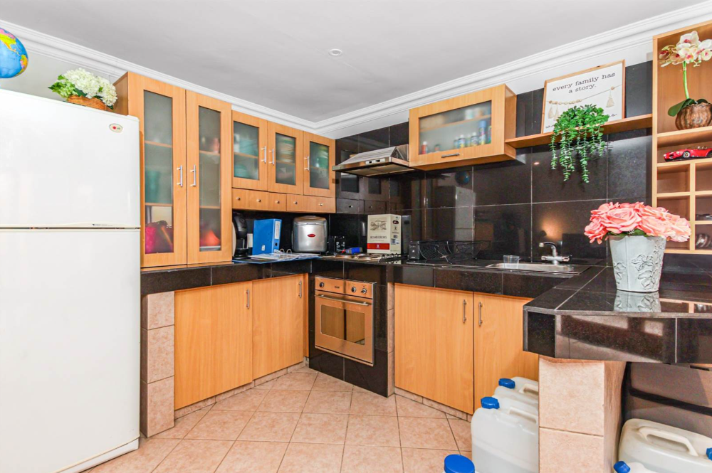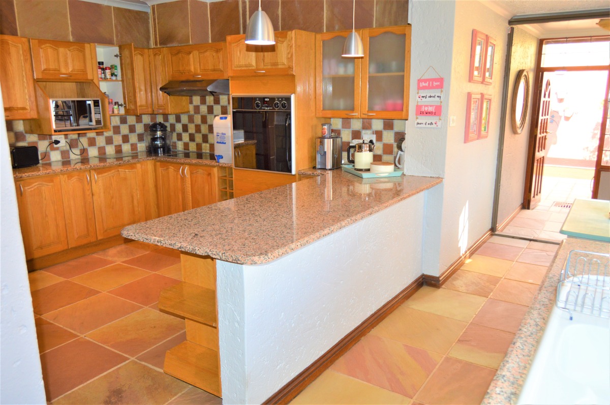 At the heart of the home lies a spacious kitchen, fitted with solid oak cupboards, granite countertops, an eye-level oven, and a breakfast bar perfect for casual dining. There is space for a double-door fridge, along with a separate scullery and an additional laundry room, ensuring functionality meets convenience.