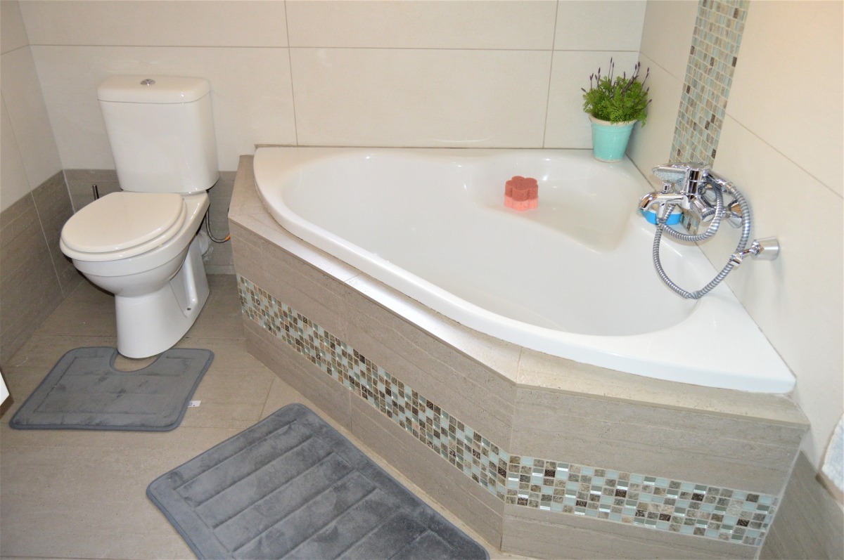 A modern, renovated family bathroom boasts a stylish corner bath, while a second bathroom with a shower adds further practicality.