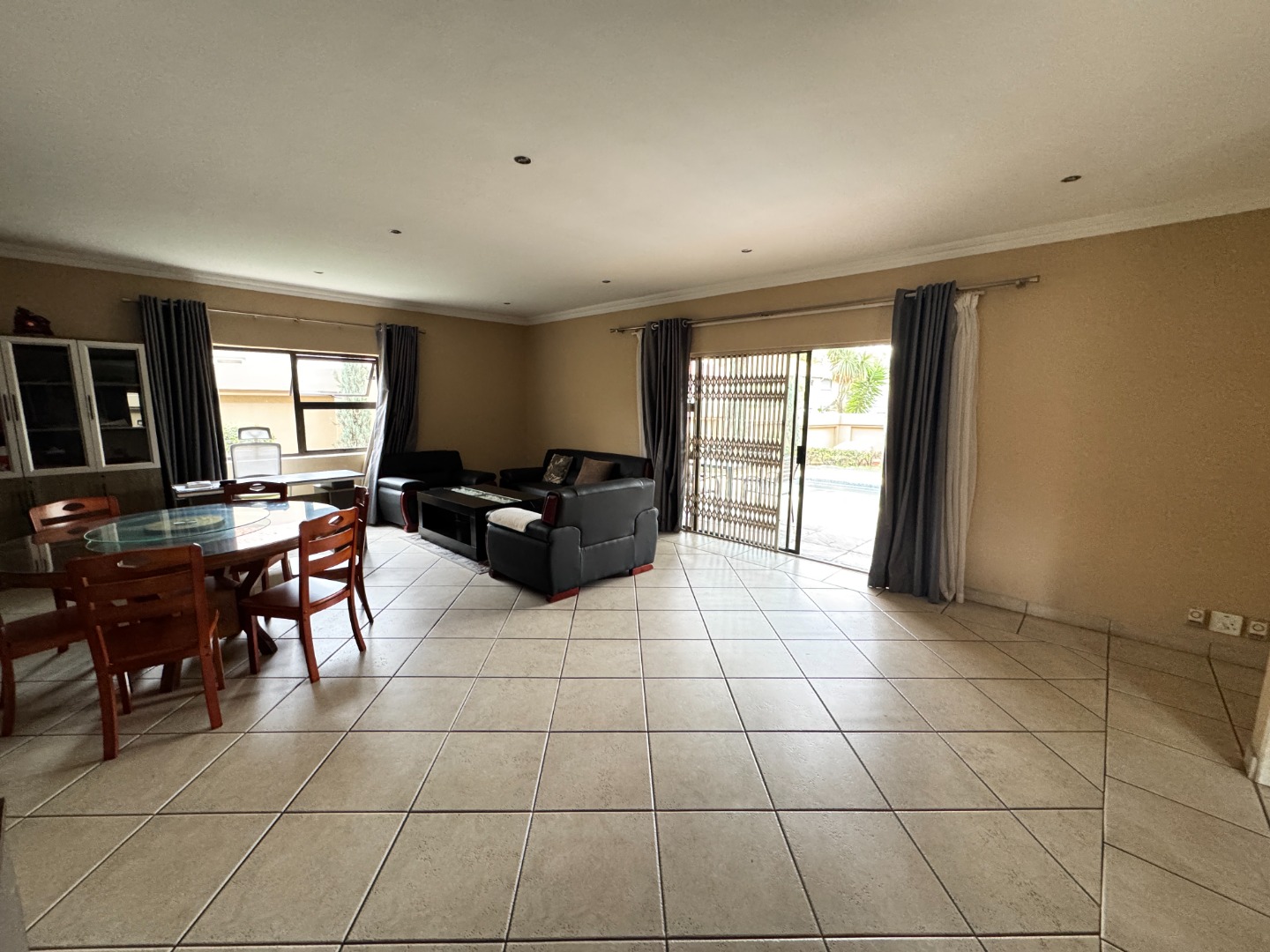 Sliding doors from the lounge lead out to a covered patio overlooking the swimming pool and a neat garden, offering a relaxed outdoor setting ideal for entertaining or unwinding with family and friends.