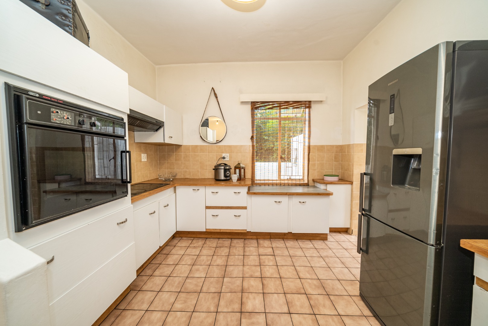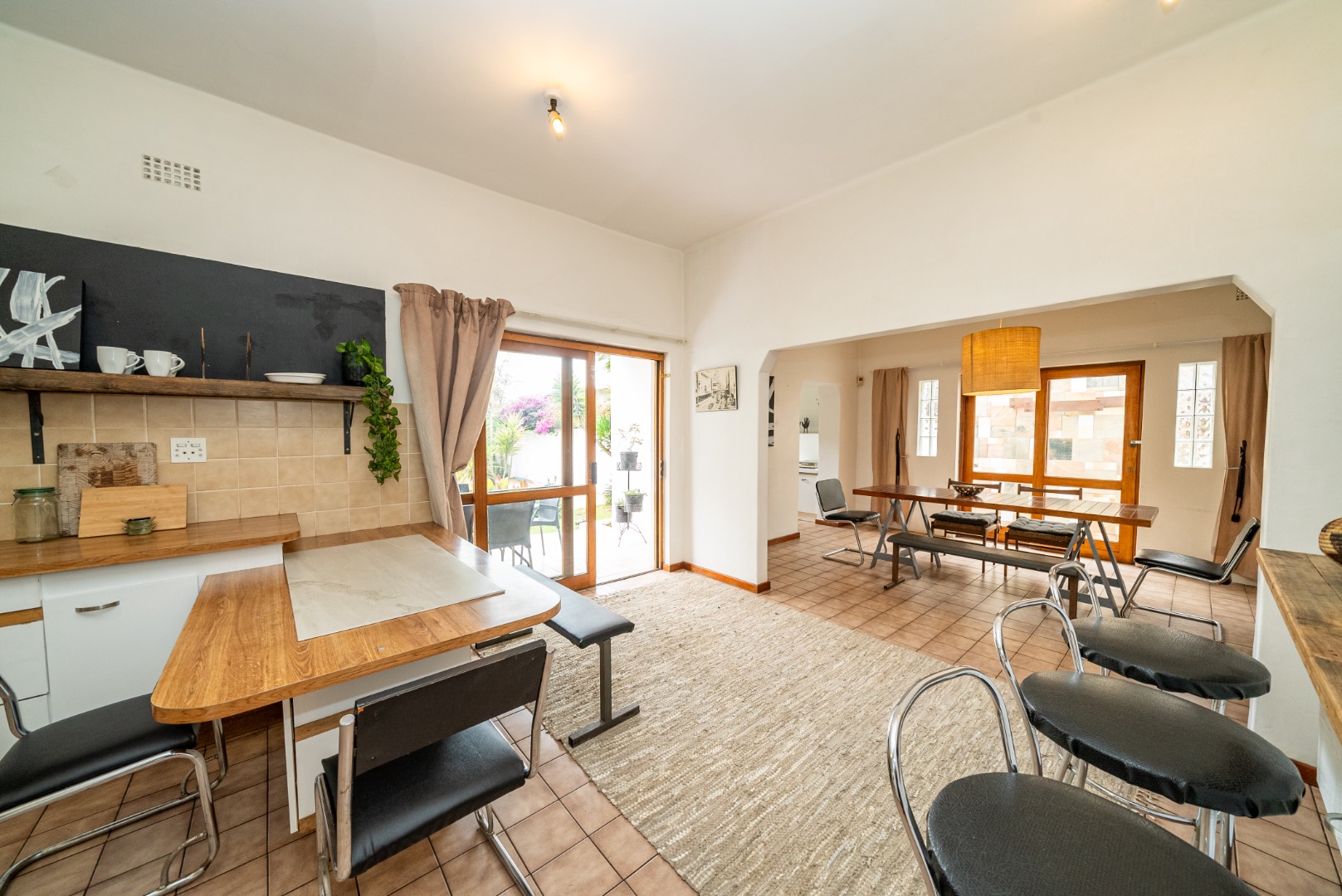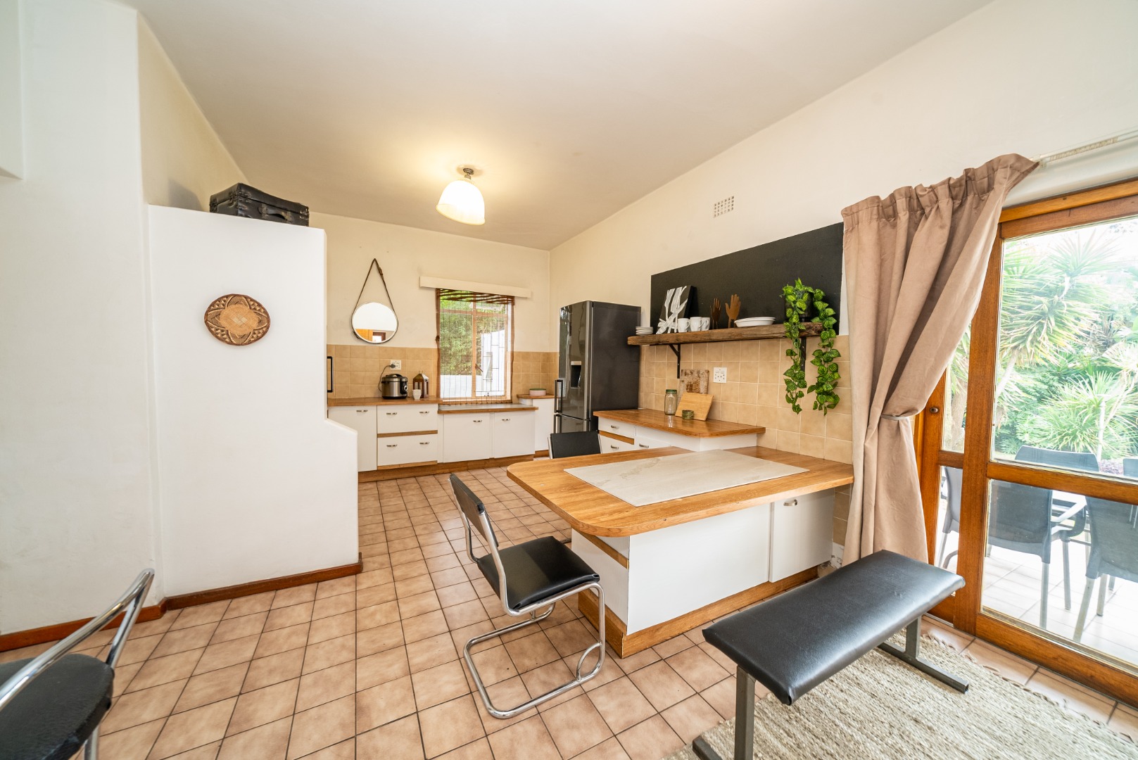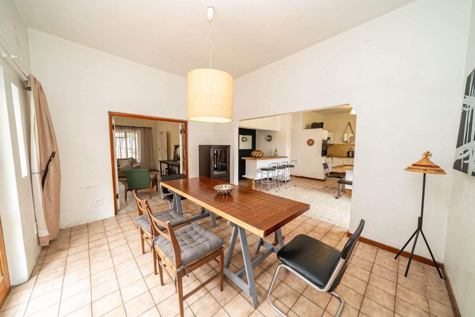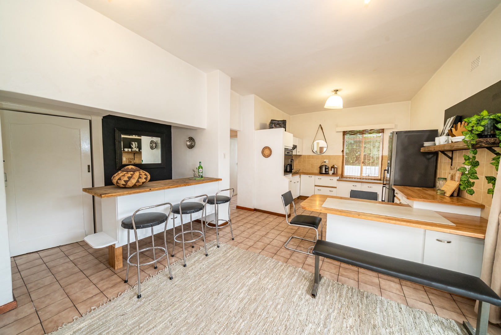 The open-plan kitchen offers ample cupboard space, a breakfast nook, and a scullery with space for two appliances. A bar counter between the kitchen and dining room creates a sociable space perfect for entertaining. From the kitchen, doors lead out to outdoor seating areas overlooking the sparkling swimming pool and well-established garden.