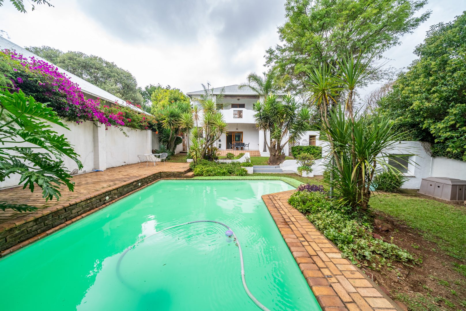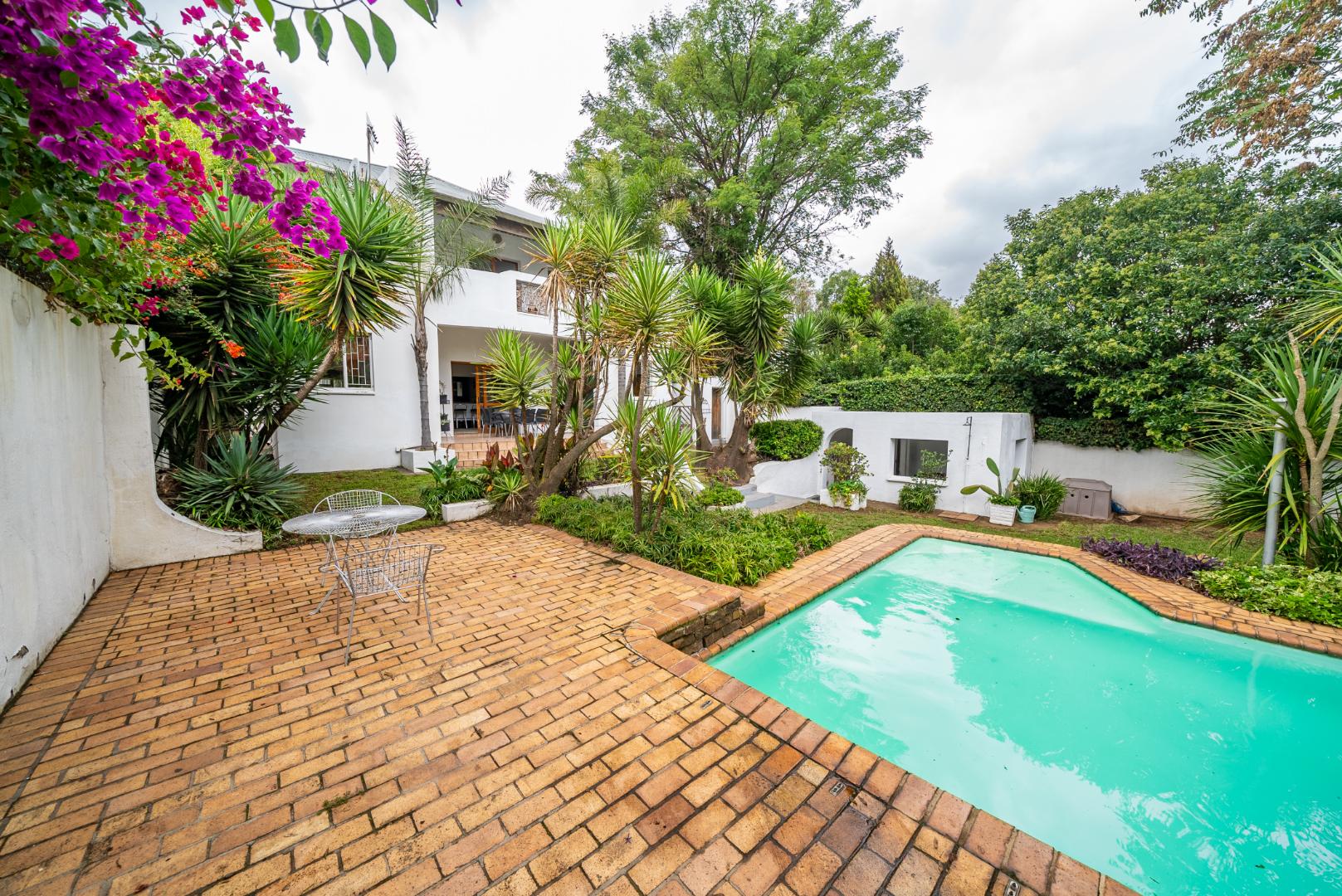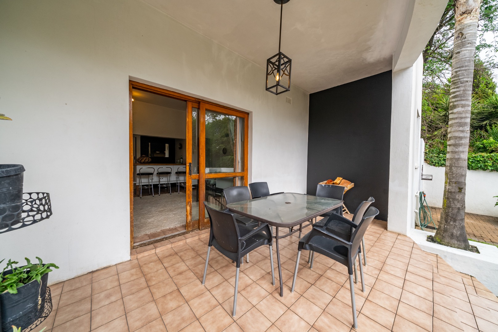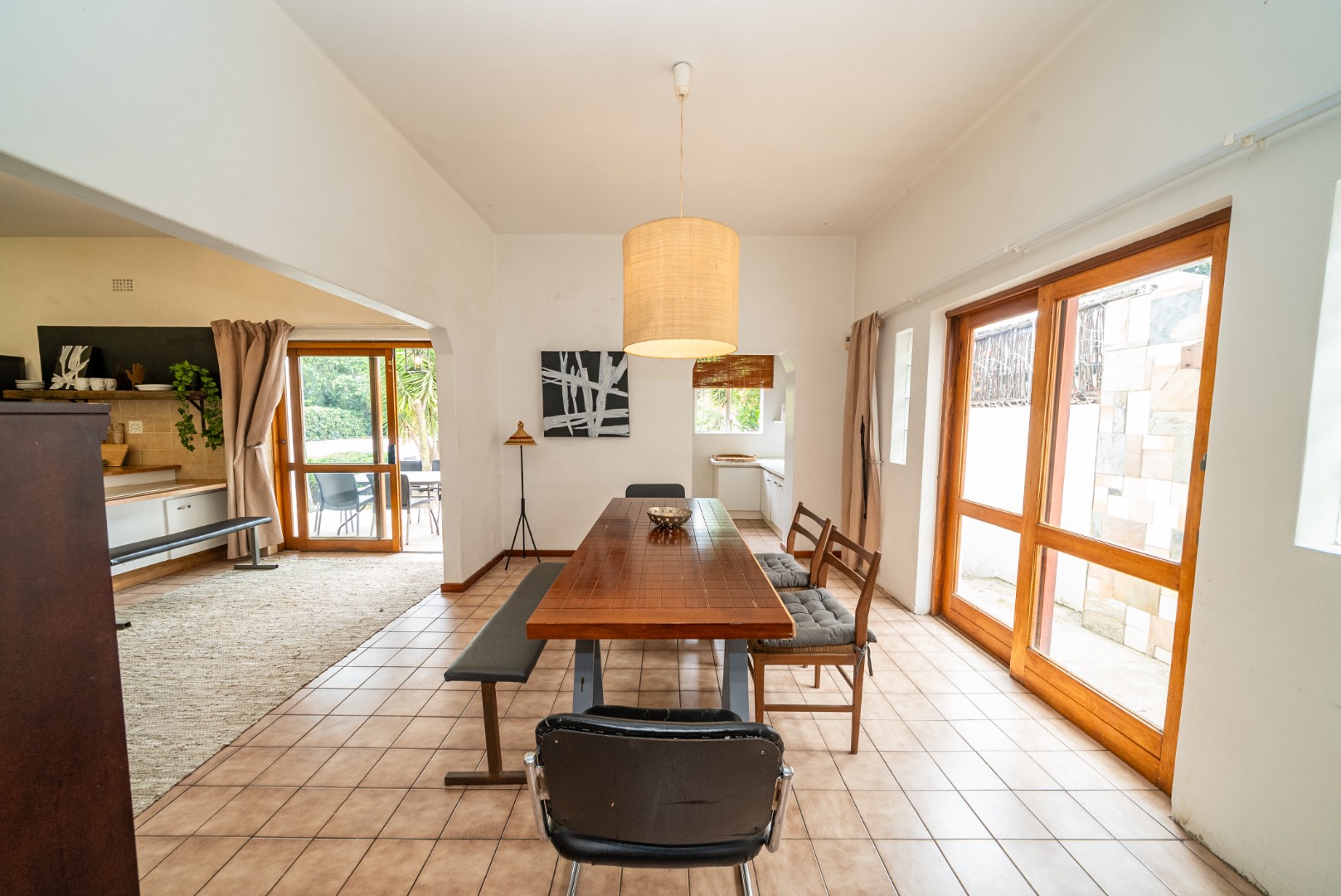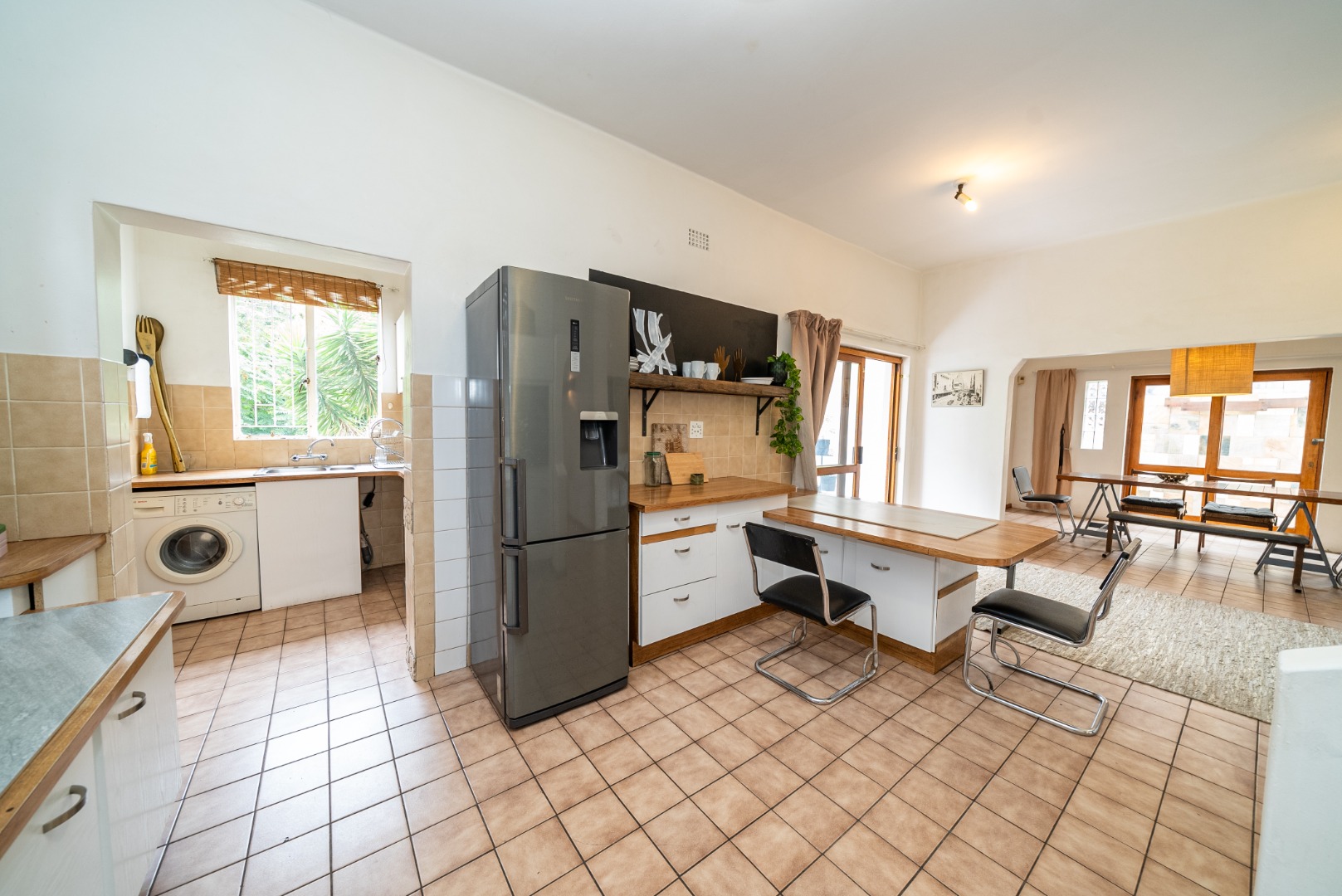 The open-plan kitchen offers ample cupboard space, a breakfast nook, and a scullery with space for two appliances. A bar counter between the kitchen and dining room creates a sociable space perfect for entertaining. From the kitchen, doors lead out to outdoor seating areas overlooking the sparkling swimming pool and well-established garden.