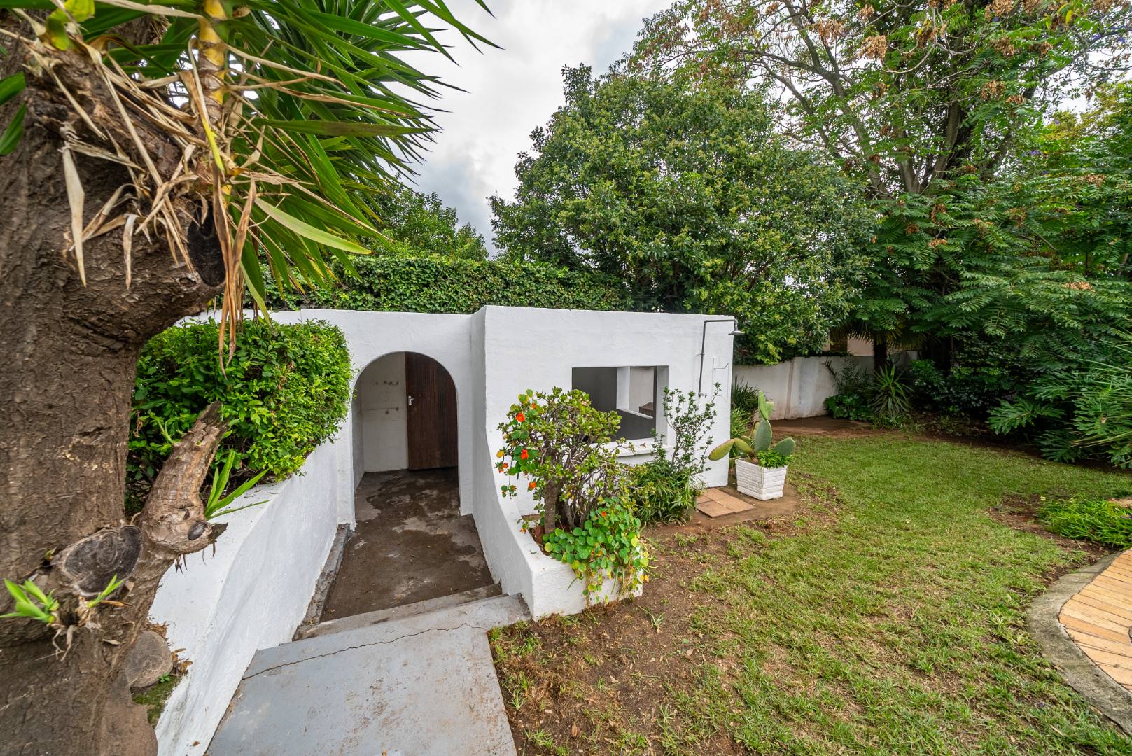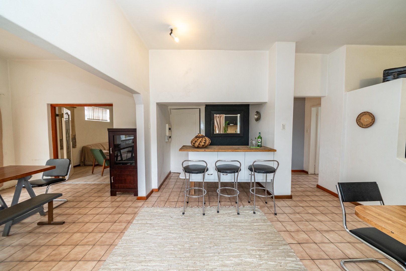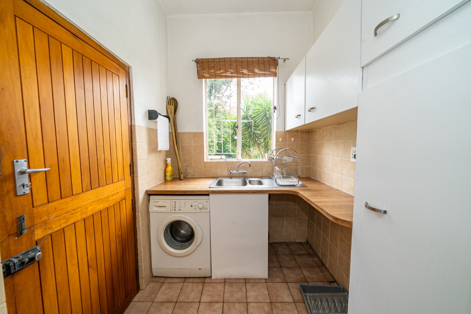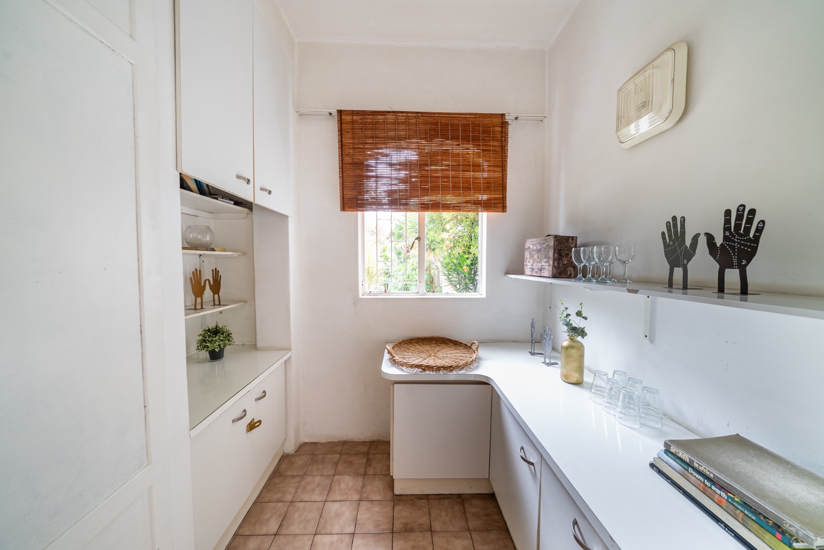 The open-plan kitchen offers ample cupboard space, a breakfast nook, and a scullery with space for two appliances. A bar counter between the kitchen and dining room creates a sociable space perfect for entertaining. From the kitchen, doors lead out to outdoor seating areas overlooking the sparkling swimming pool and well-established garden.