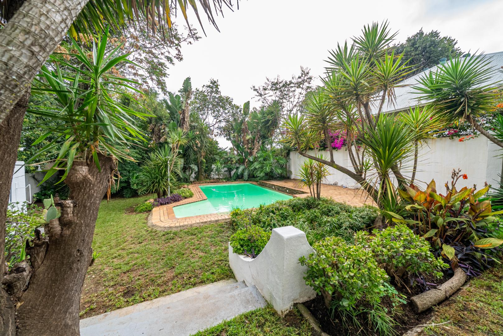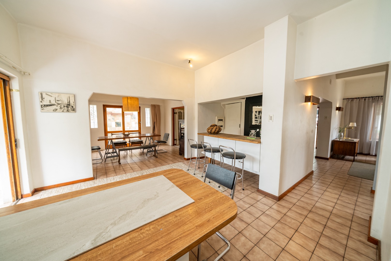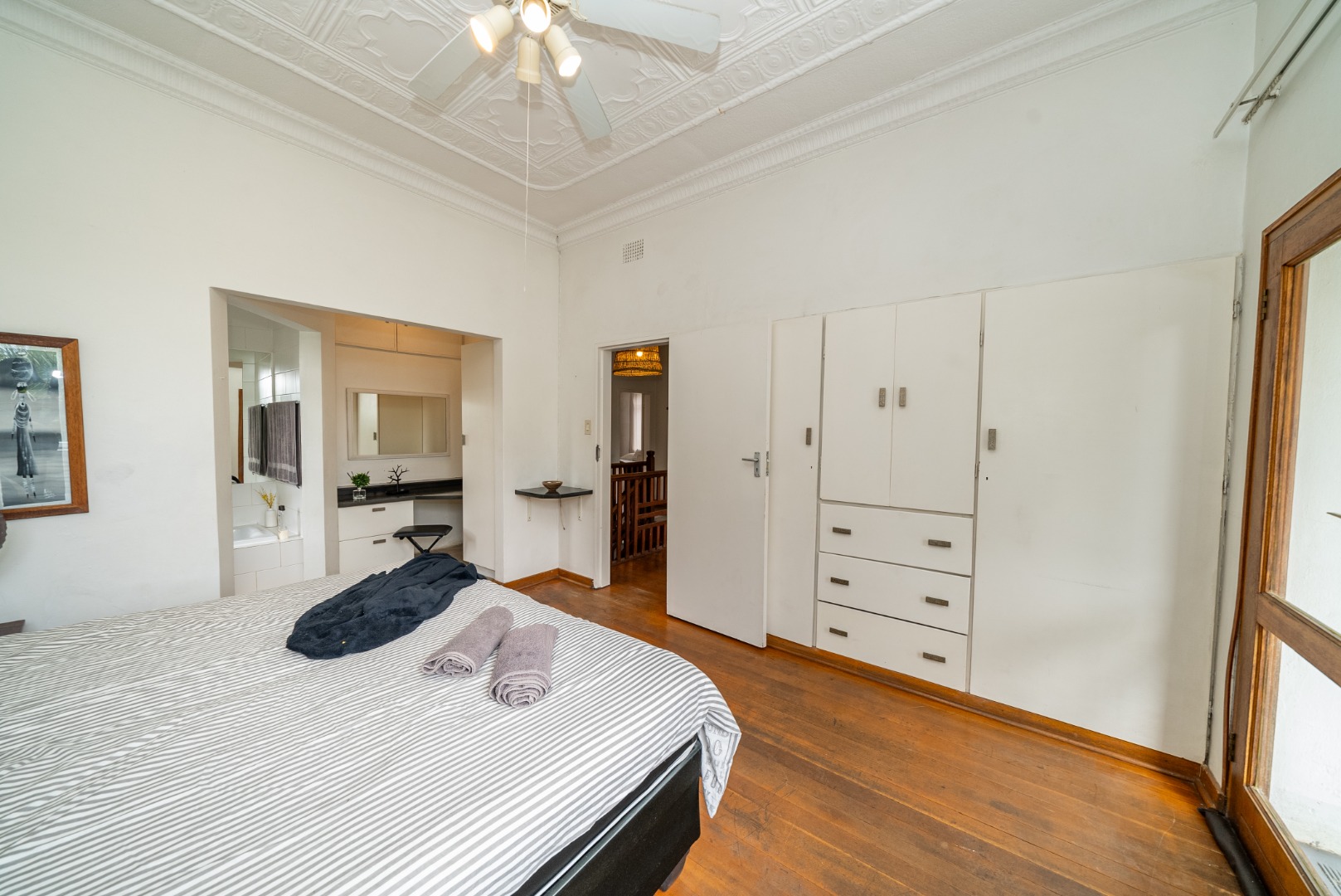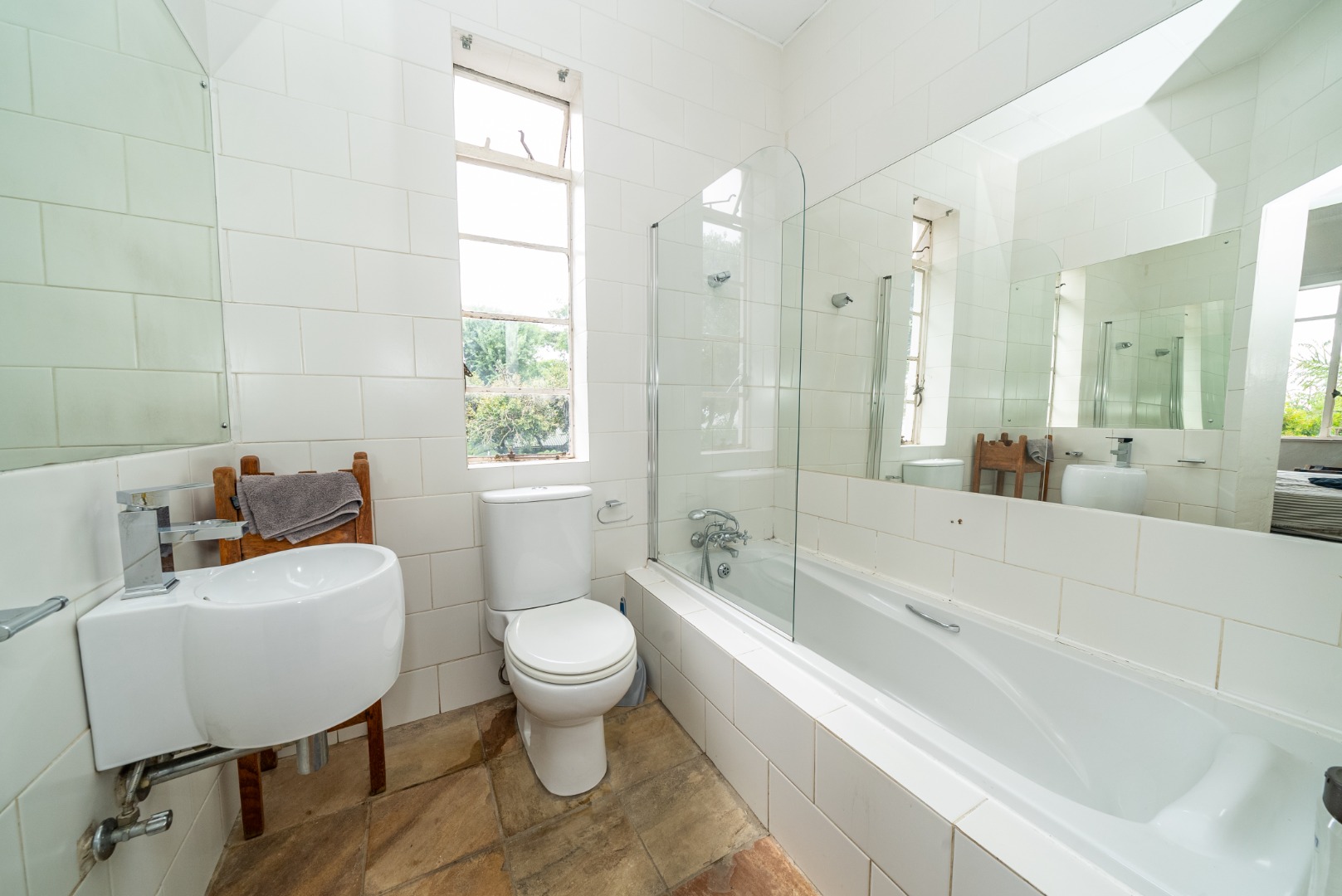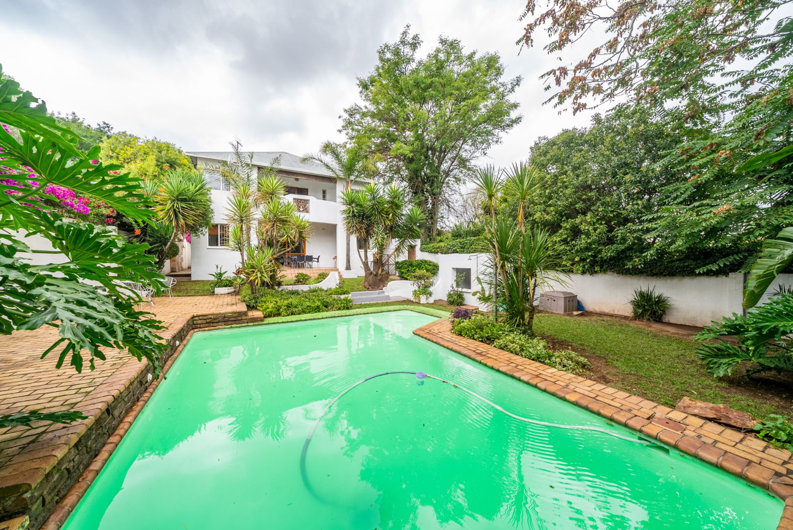 The open-plan kitchen offers ample cupboard space, a breakfast nook, and a scullery with space for two appliances. A bar counter between the kitchen and dining room creates a sociable space perfect for entertaining. From the kitchen, doors lead out to outdoor seating areas overlooking the sparkling swimming pool and well-established garden.