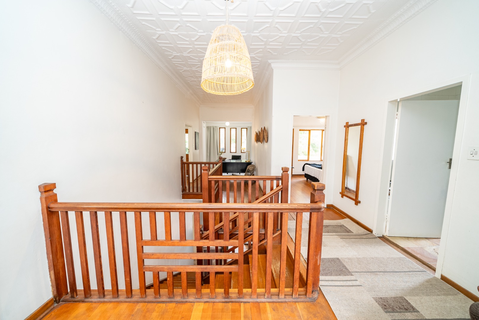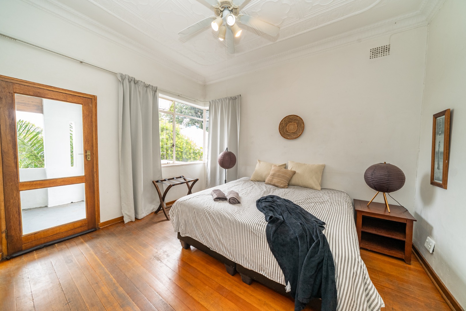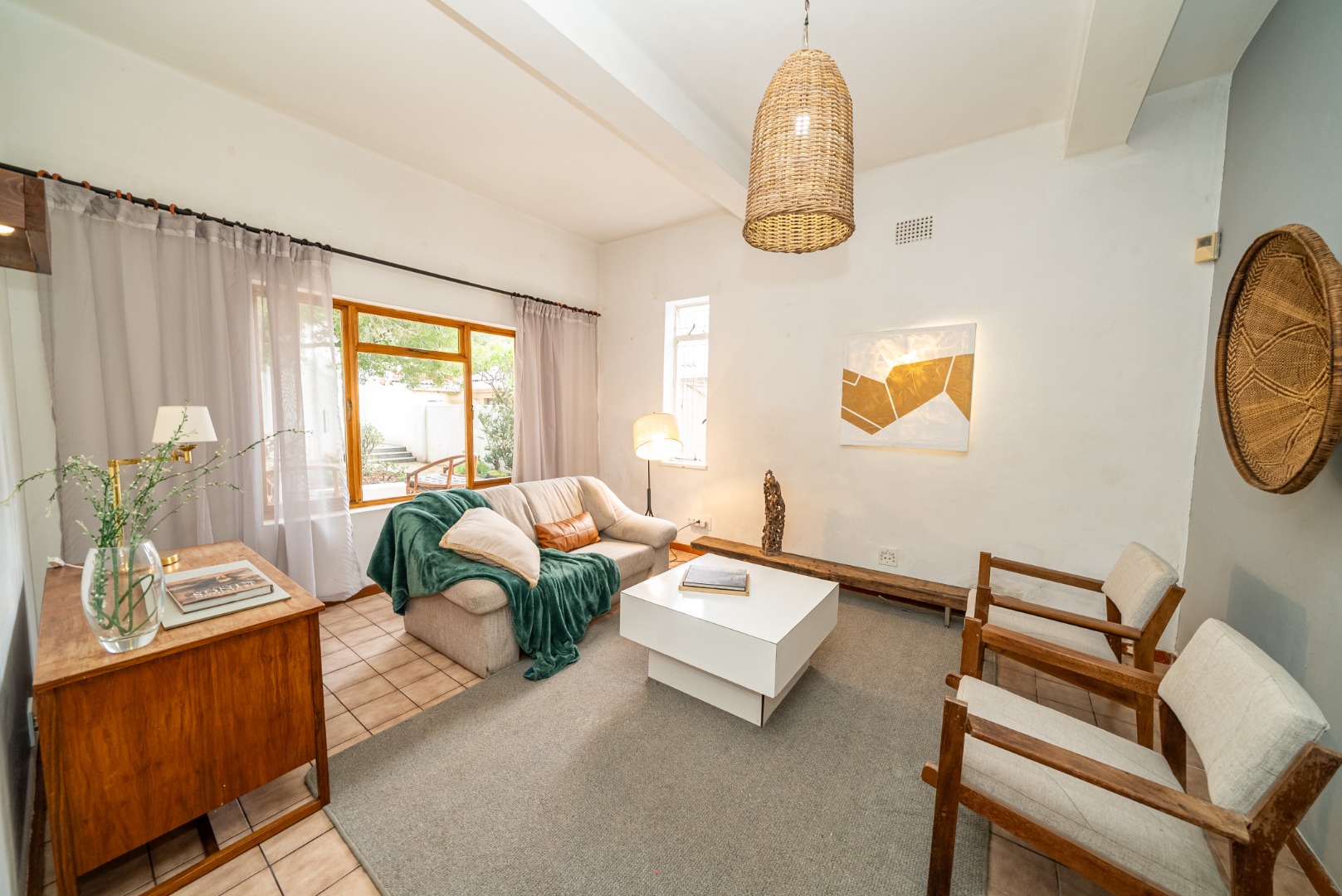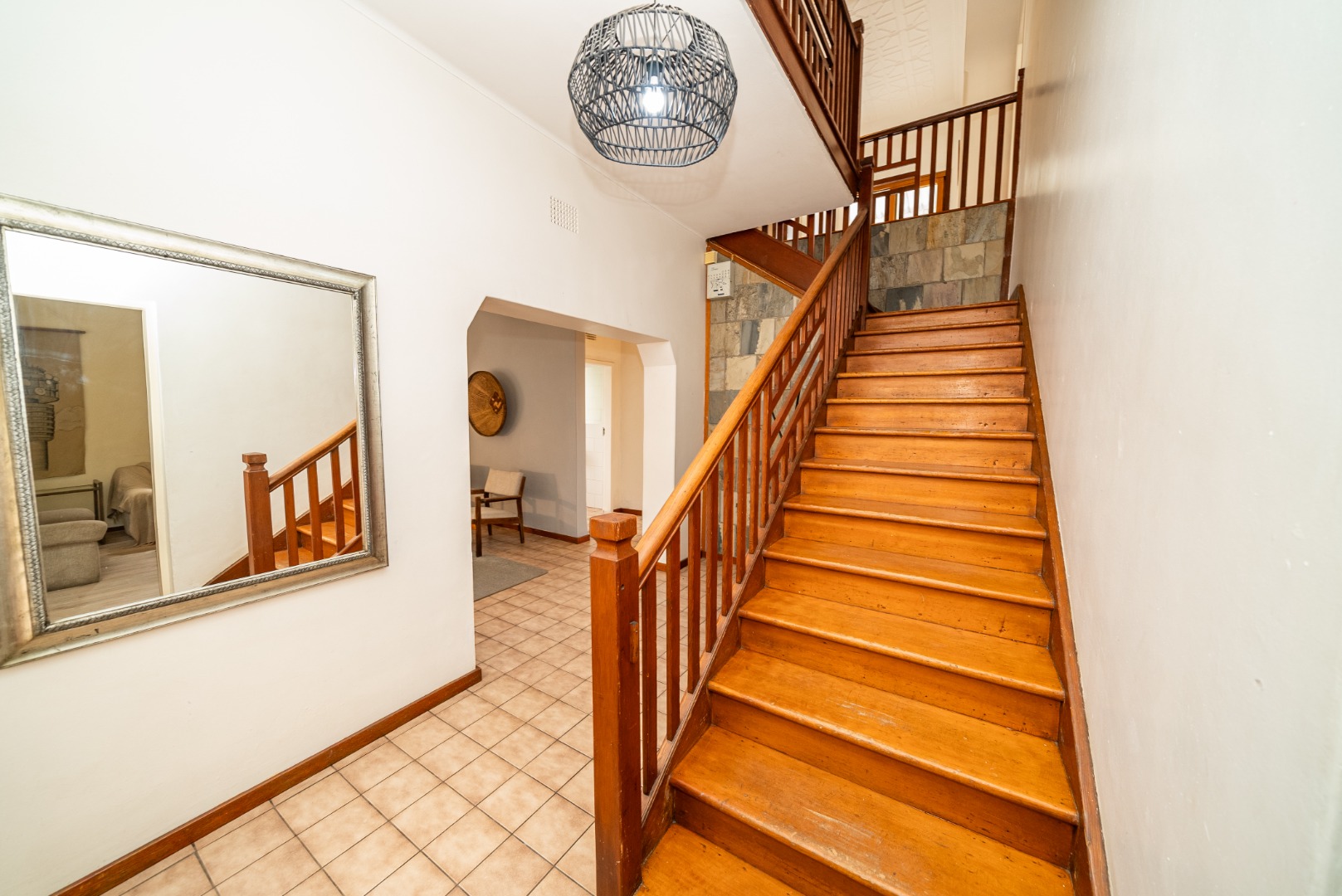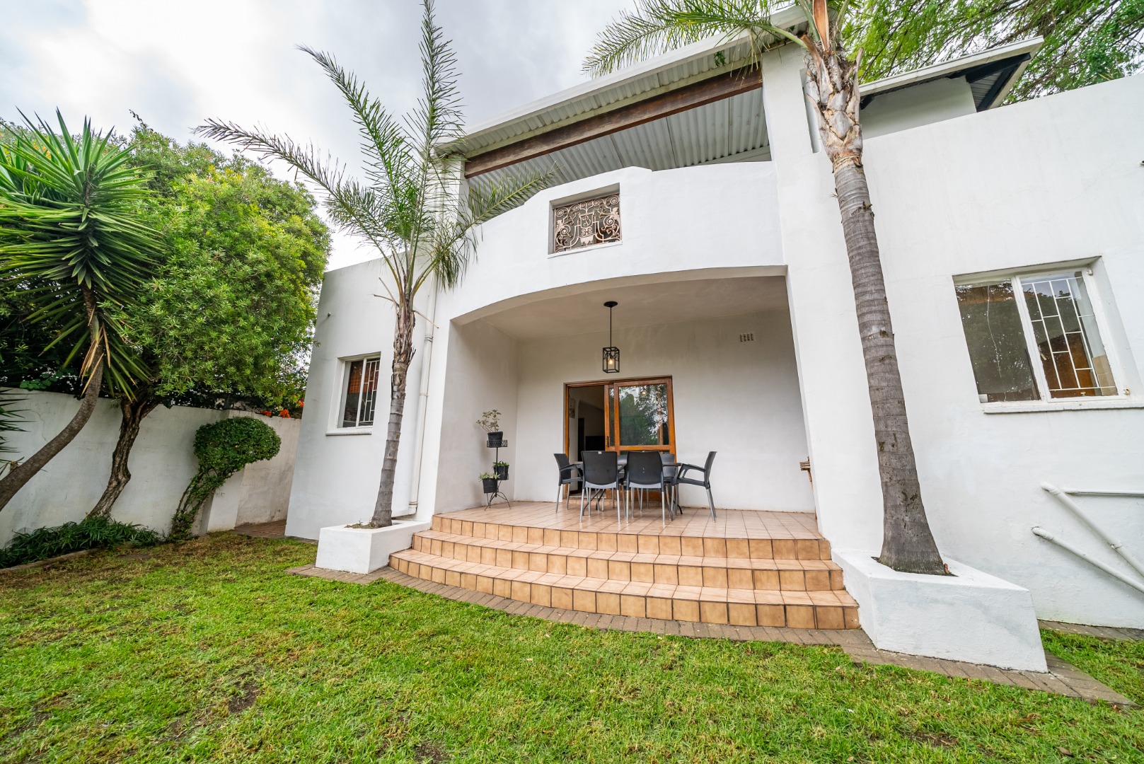 The open-plan kitchen offers ample cupboard space, a breakfast nook, and a scullery with space for two appliances. A bar counter between the kitchen and dining room creates a sociable space perfect for entertaining. From the kitchen, doors lead out to outdoor seating areas overlooking the sparkling swimming pool and well-established garden.
