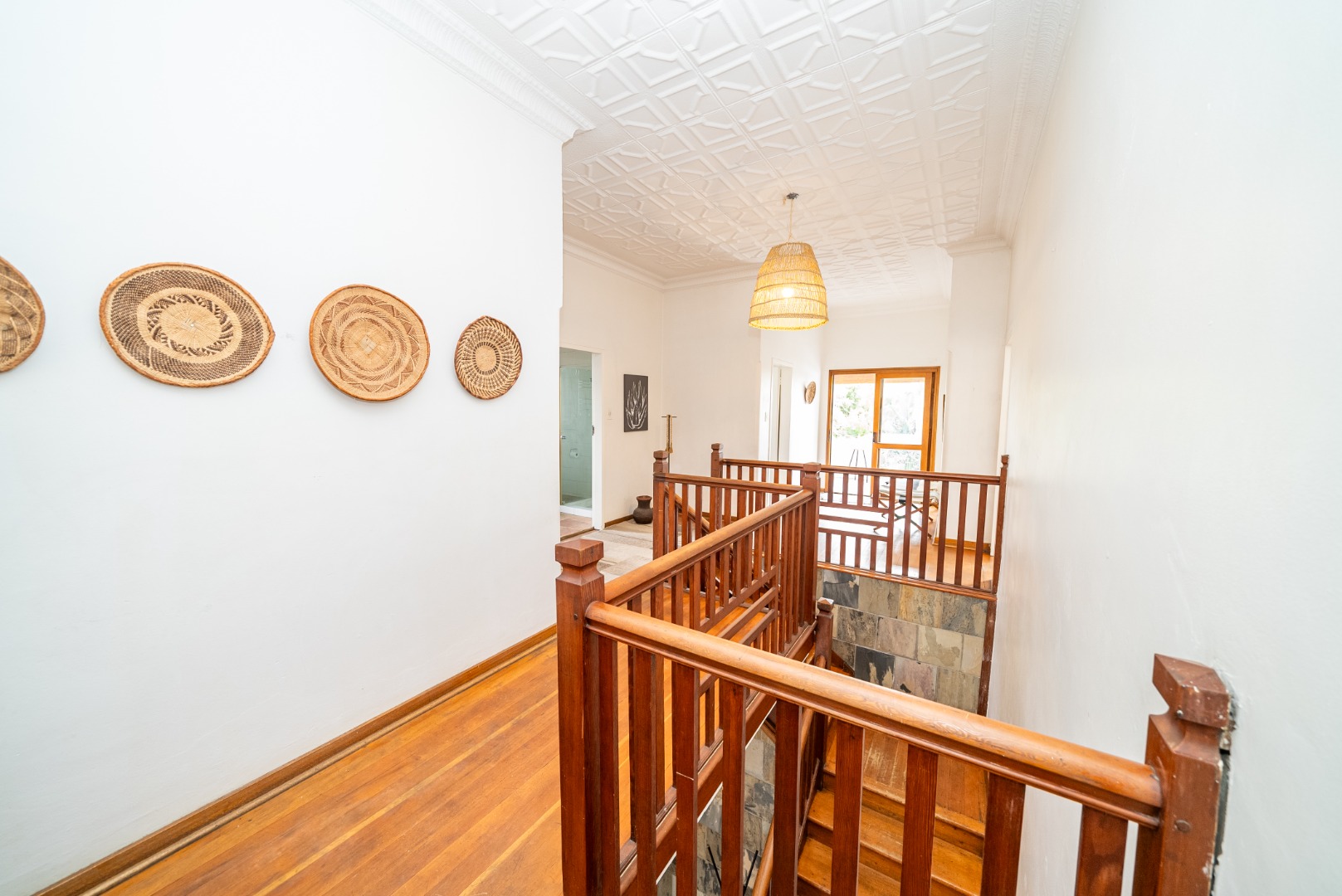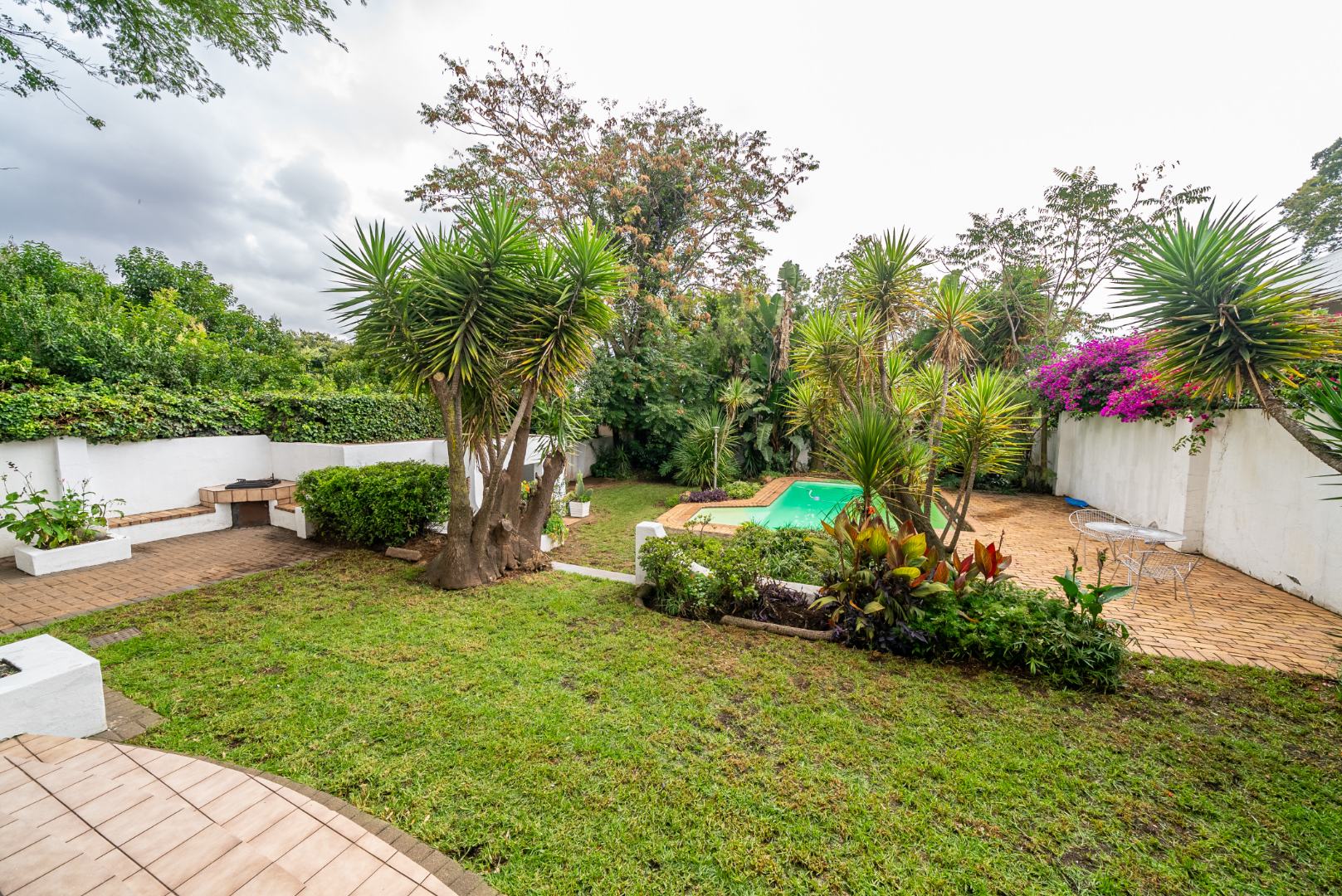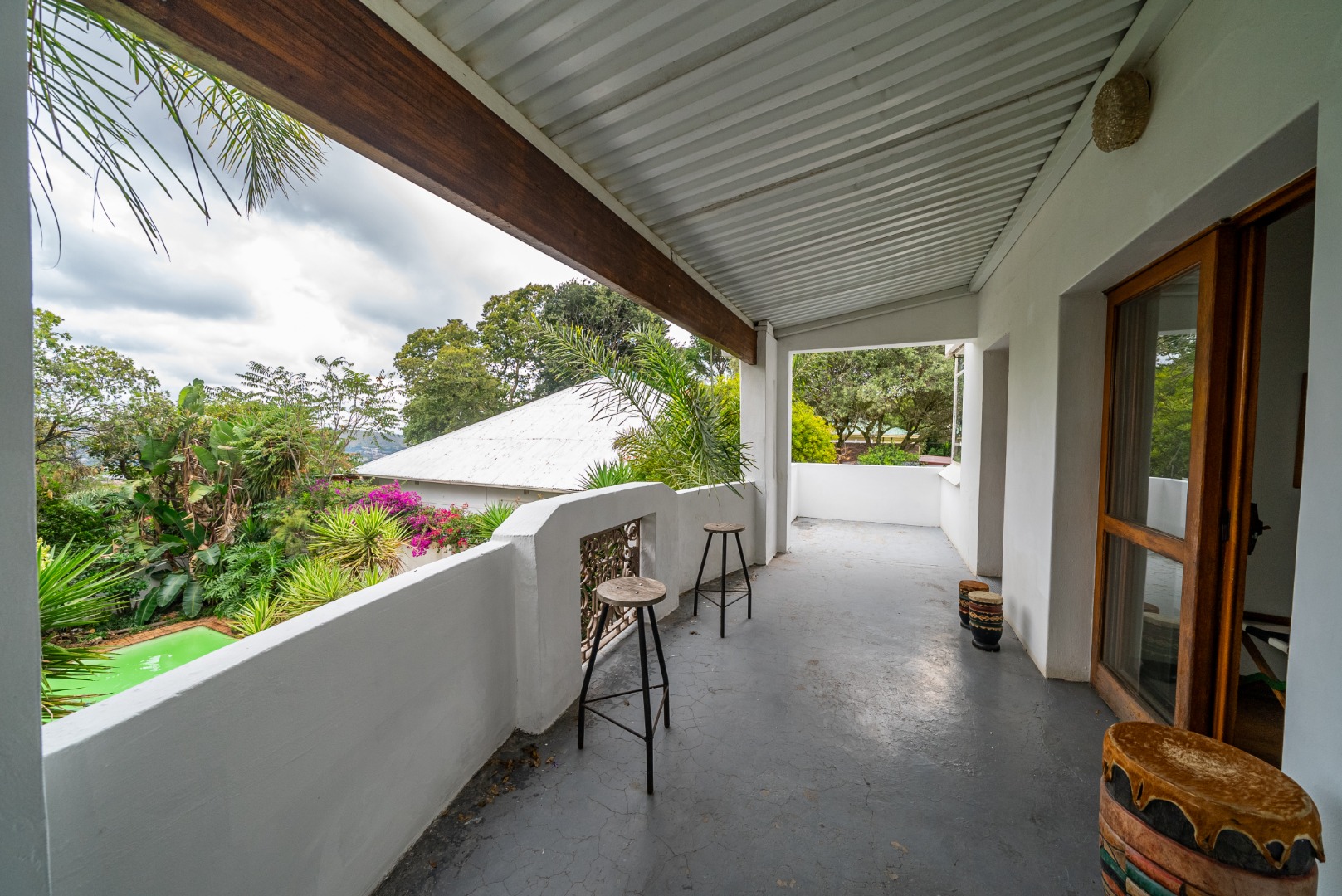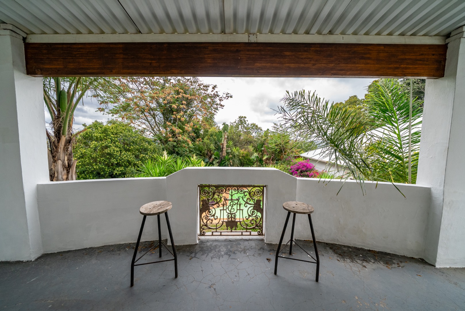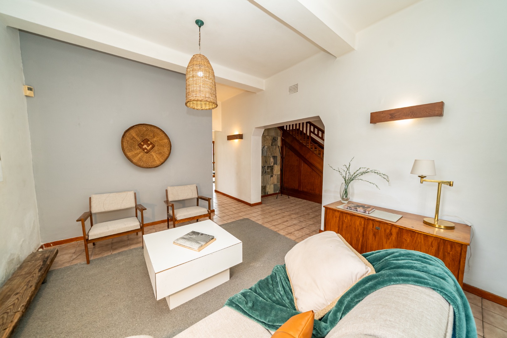 The open-plan kitchen offers ample cupboard space, a breakfast nook, and a scullery with space for two appliances. A bar counter between the kitchen and dining room creates a sociable space perfect for entertaining. From the kitchen, doors lead out to outdoor seating areas overlooking the sparkling swimming pool and well-established garden.