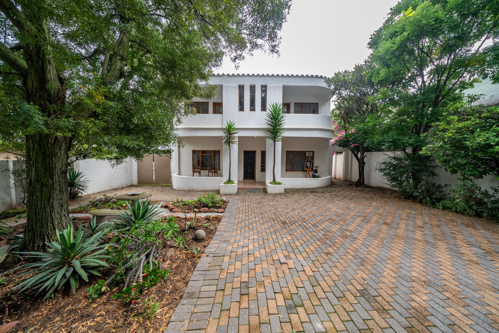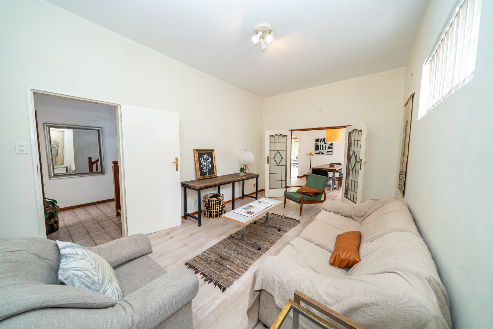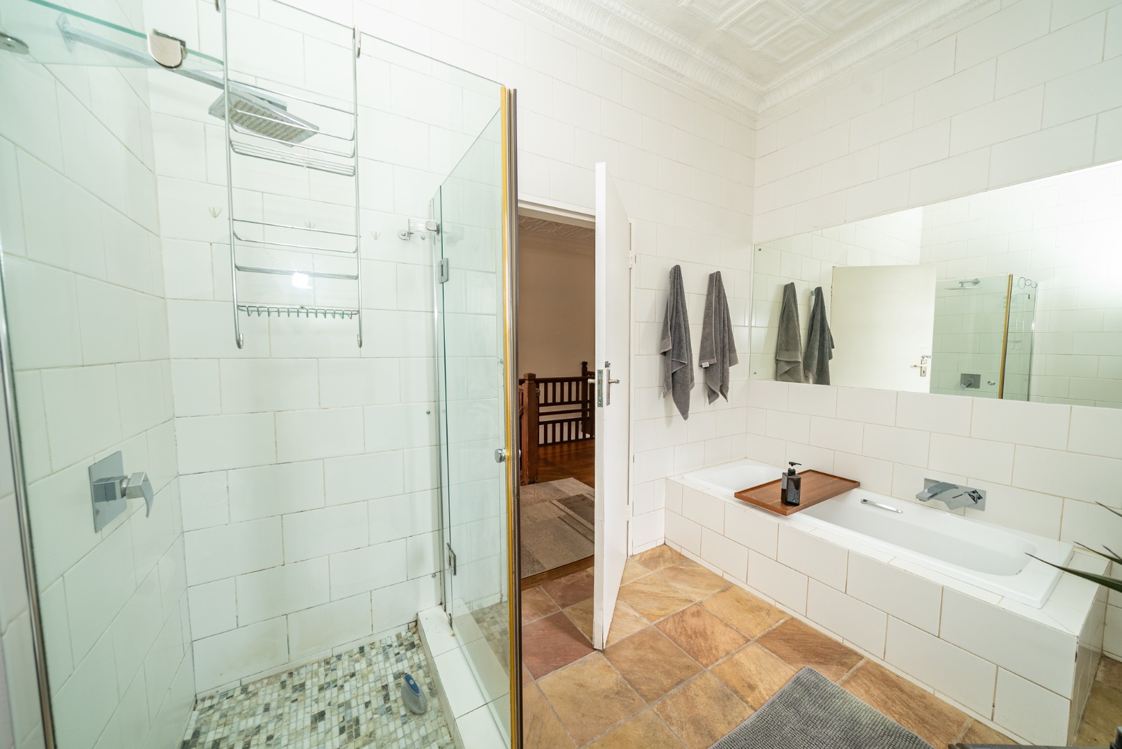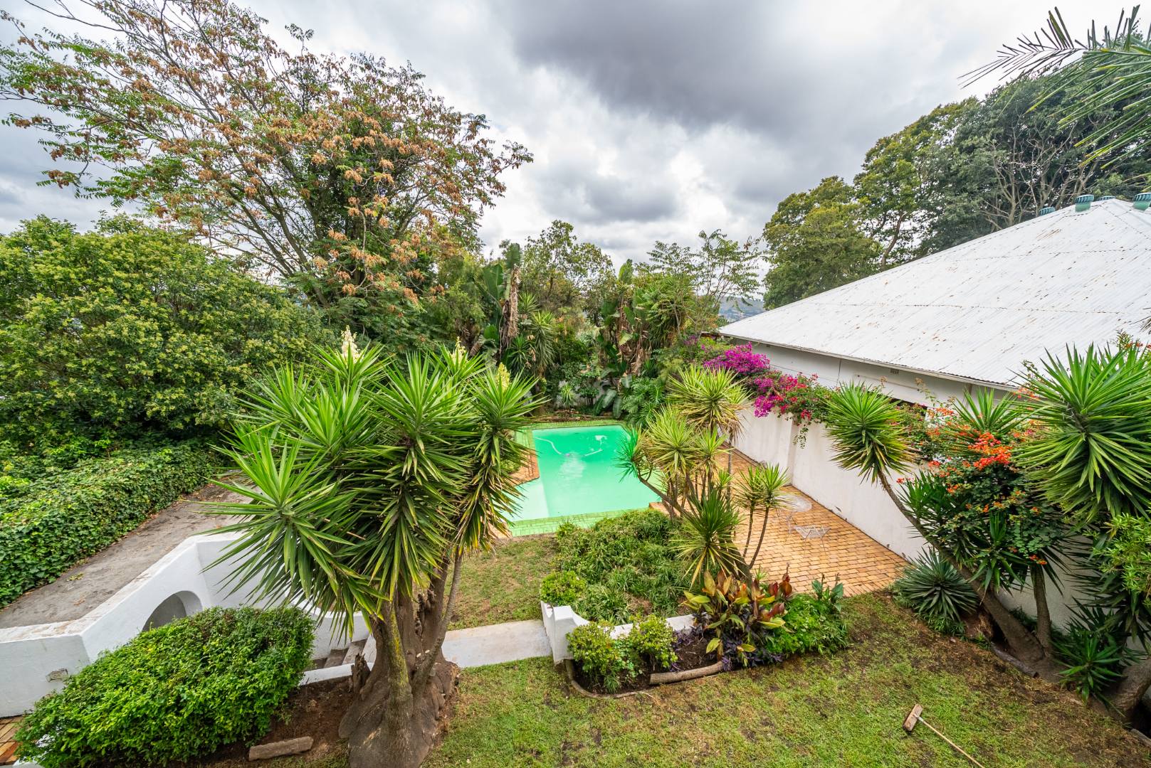The open-plan kitchen offers ample cupboard space, a breakfast nook, and a scullery with space for two appliances. A bar counter between the kitchen and dining room creates a sociable space perfect for entertaining. From the kitchen, doors lead out to outdoor seating areas overlooking the sparkling swimming pool and well-established garden.