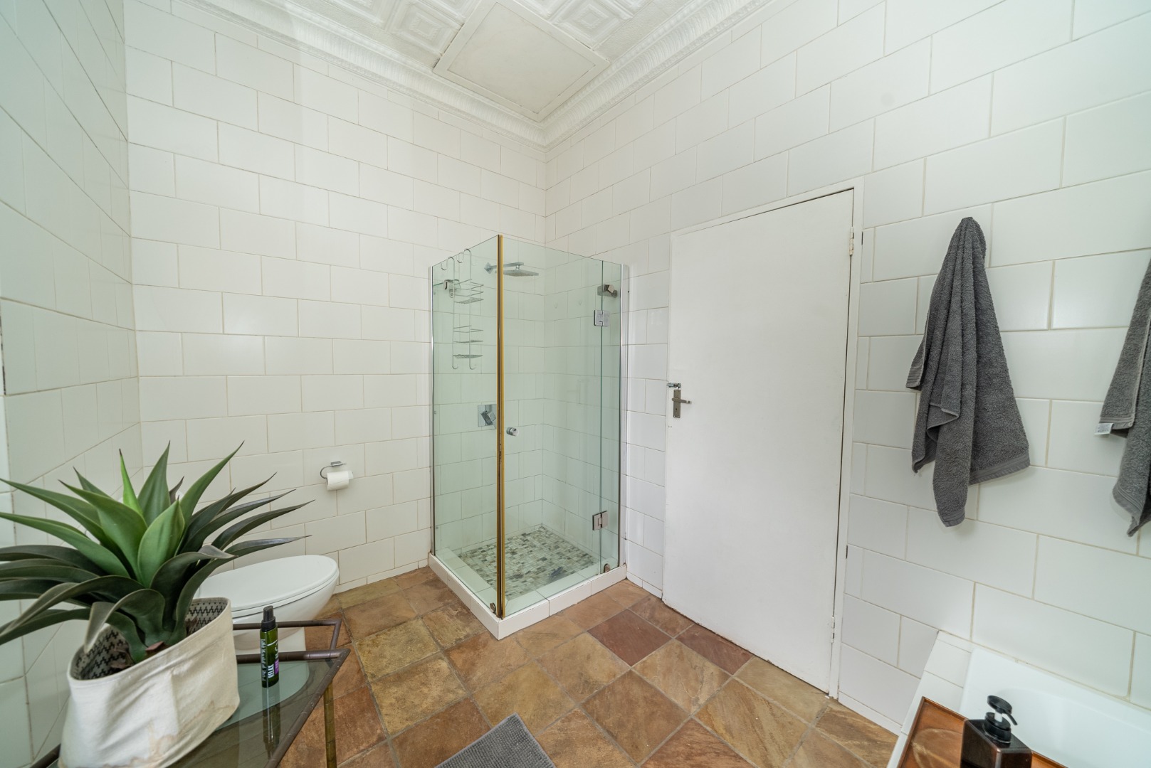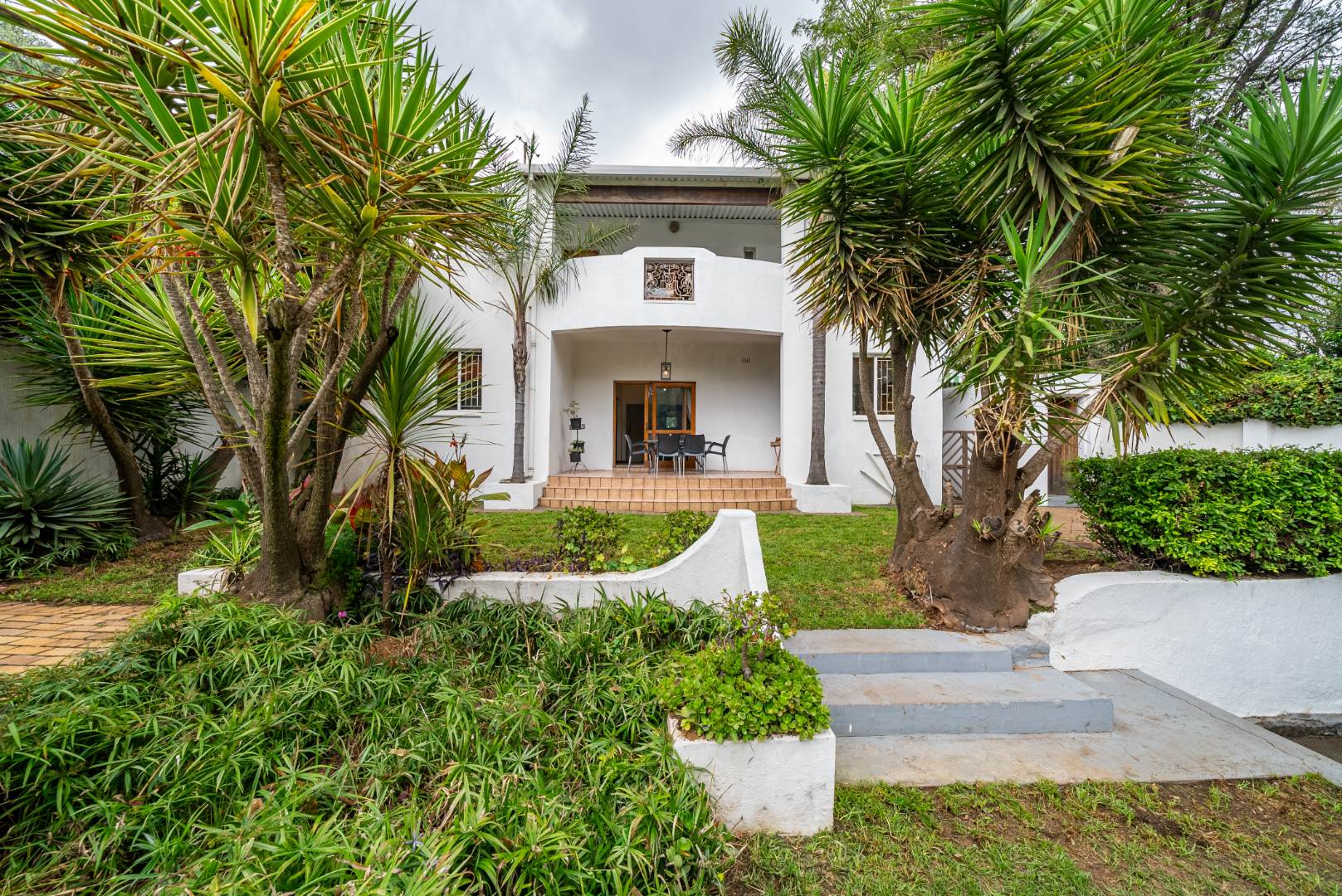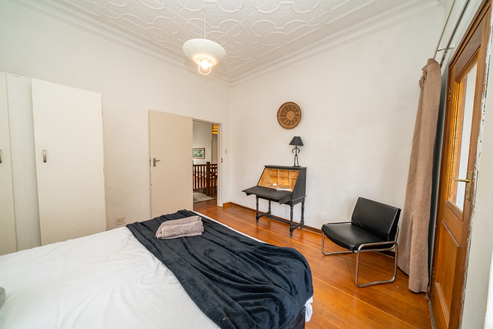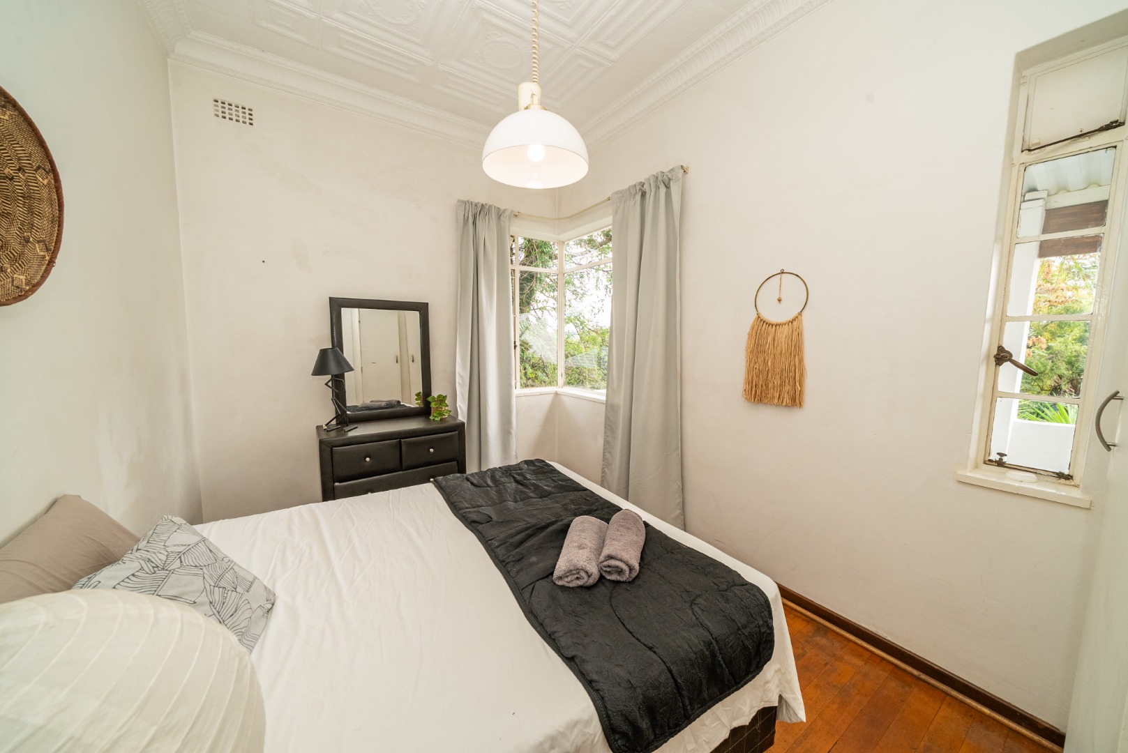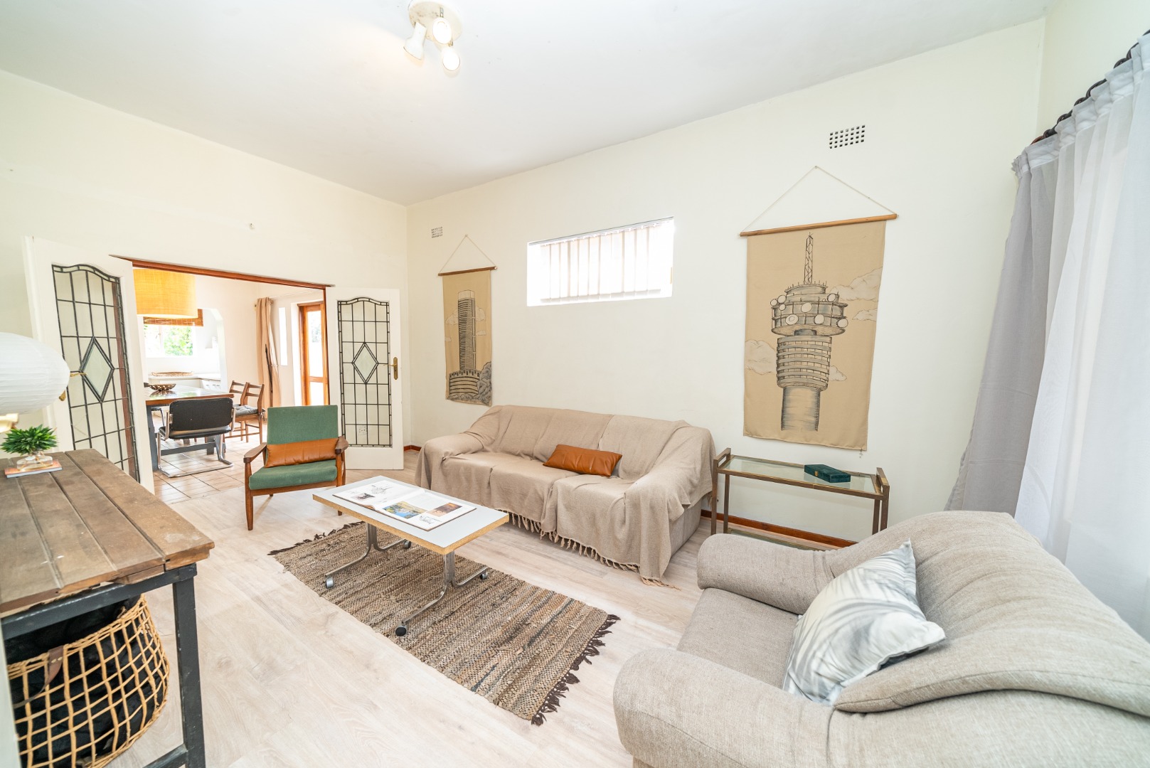 The open-plan kitchen offers ample cupboard space, a breakfast nook, and a scullery with space for two appliances. A bar counter between the kitchen and dining room creates a sociable space perfect for entertaining. From the kitchen, doors lead out to outdoor seating areas overlooking the sparkling swimming pool and well-established garden.