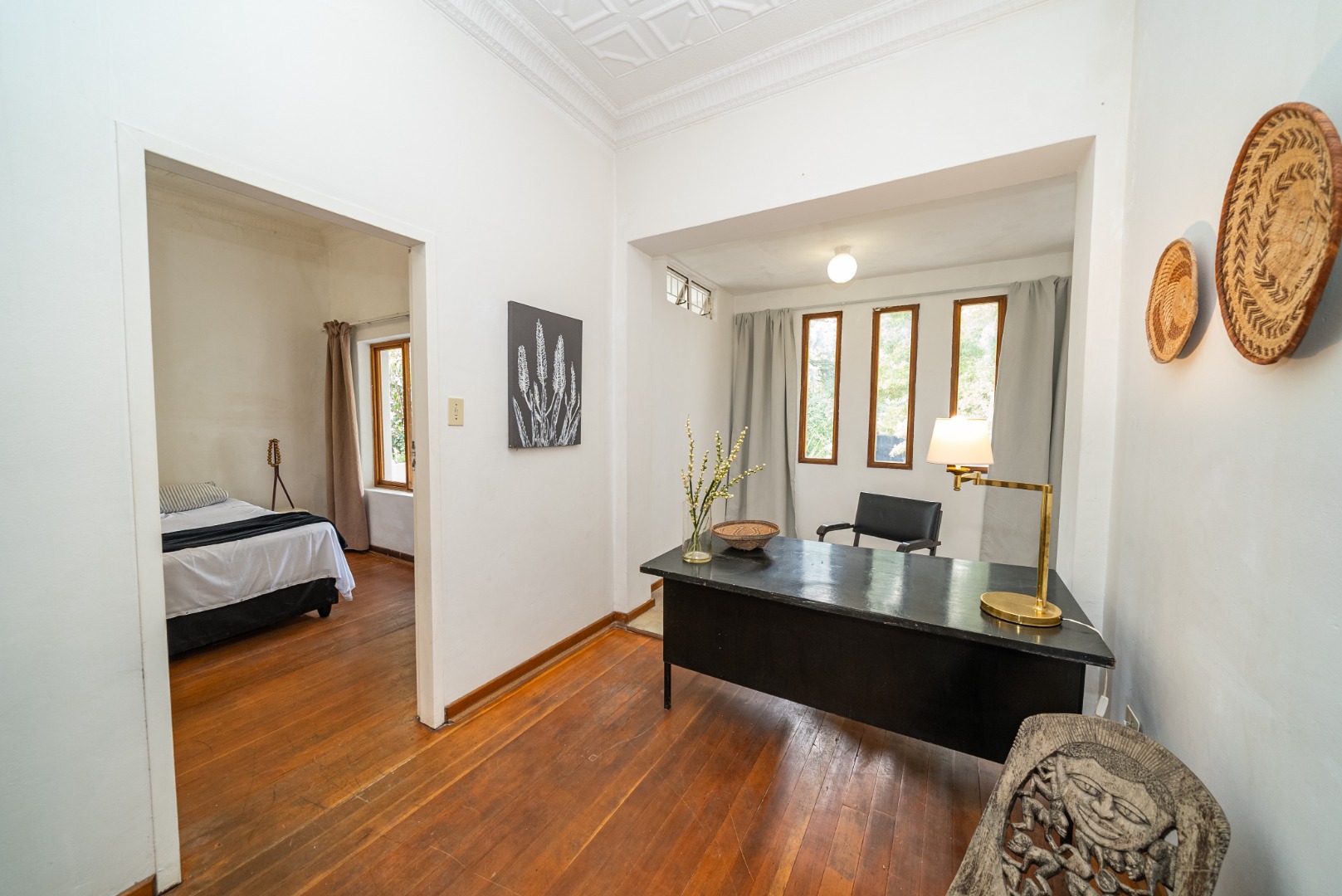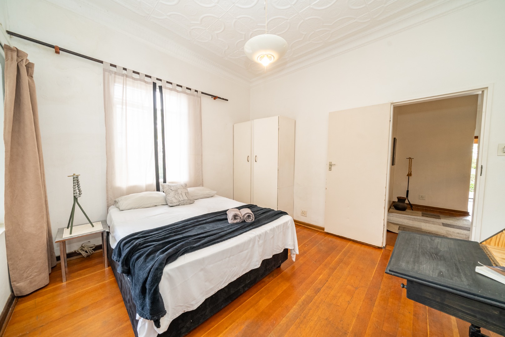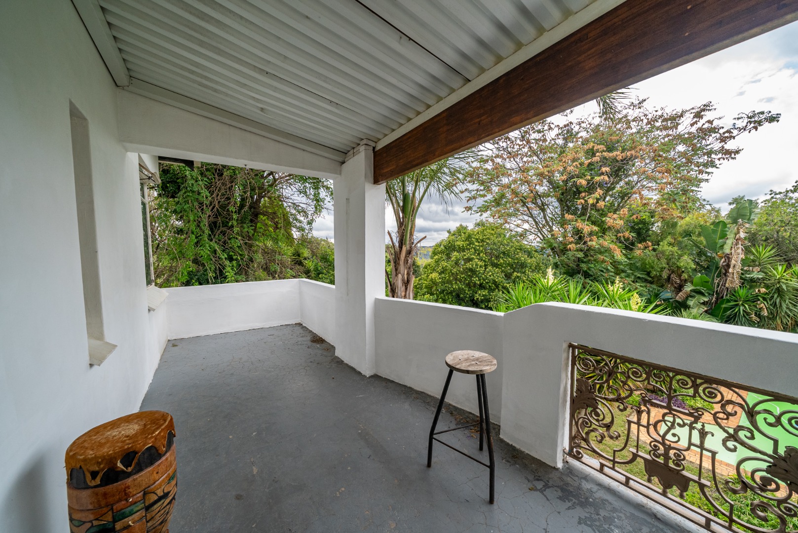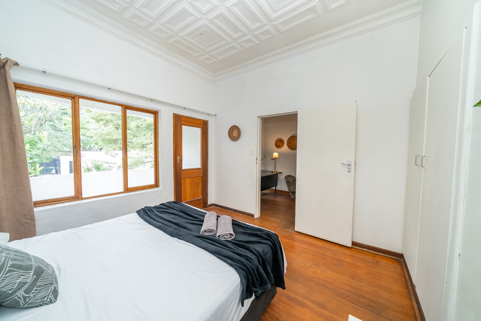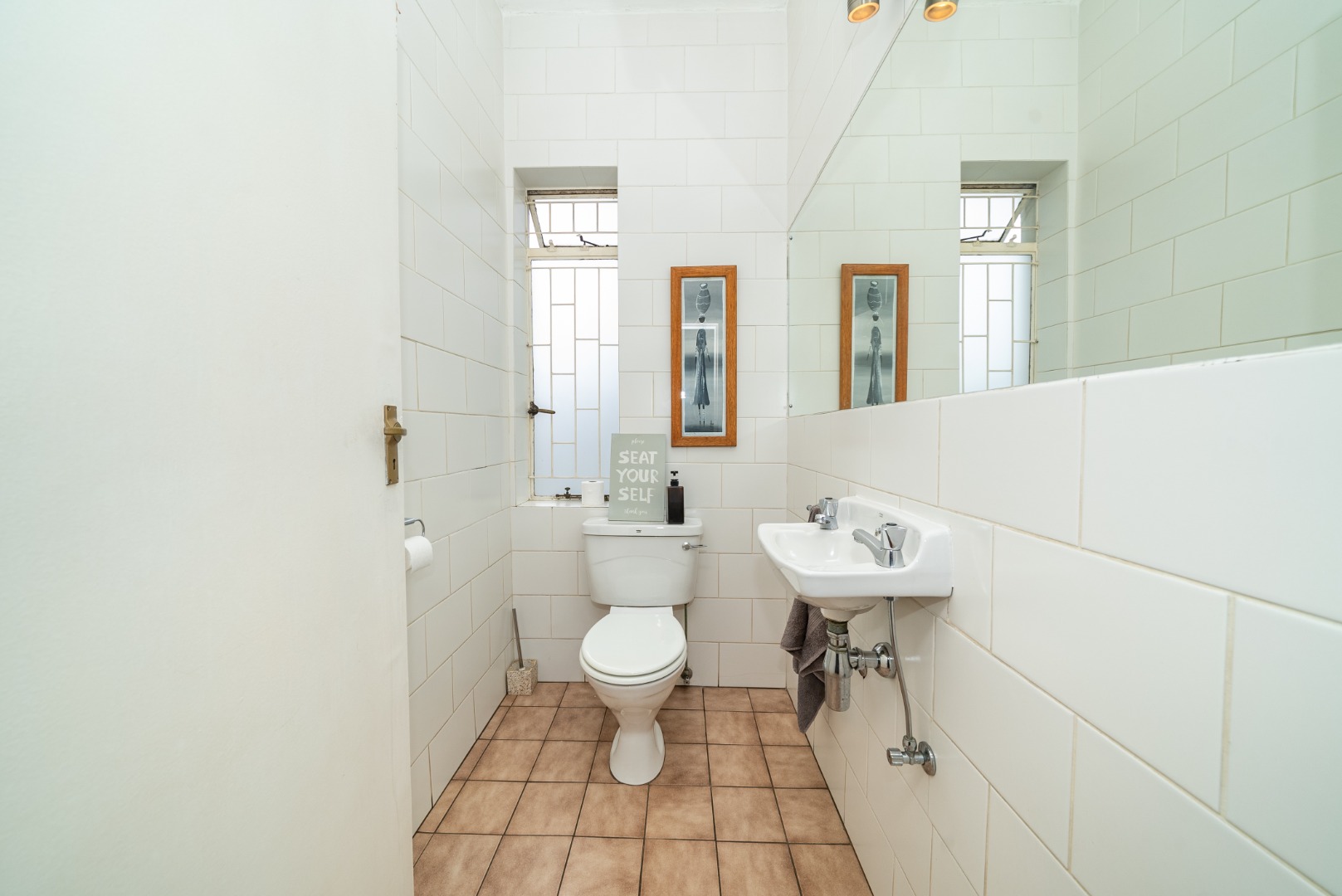 The open-plan kitchen offers ample cupboard space, a breakfast nook, and a scullery with space for two appliances. A bar counter between the kitchen and dining room creates a sociable space perfect for entertaining. From the kitchen, doors lead out to outdoor seating areas overlooking the sparkling swimming pool and well-established garden.