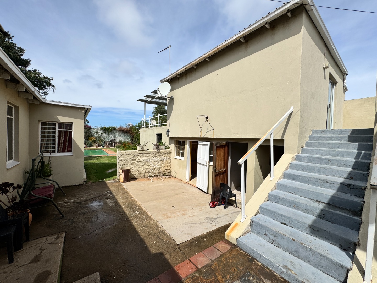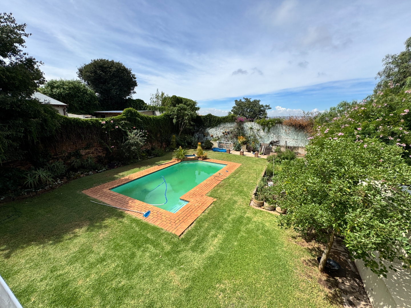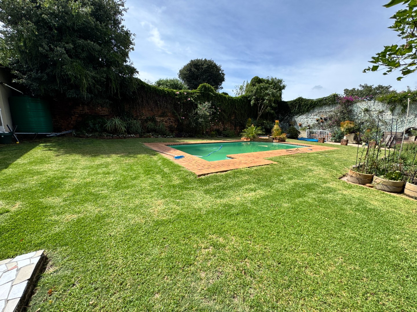 The outdoor area offers a large garden with a sparkling swimming pool, creating the perfect environment for summer gatherings and family enjoyment.