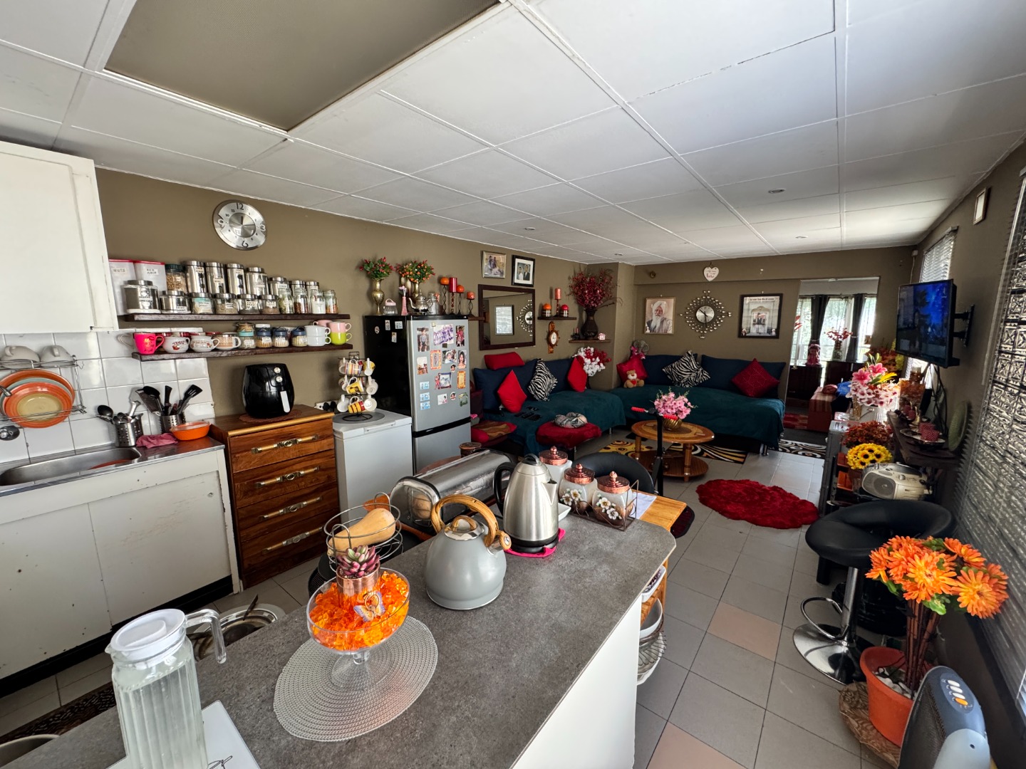 The main residence welcomes you with generous living spaces designed for both comfort and entertaining. A large lounge area, complete with a cozy fireplace, creates a warm and inviting atmosphere, while an additional section of the room is currently used as a convenient work-from-home space.