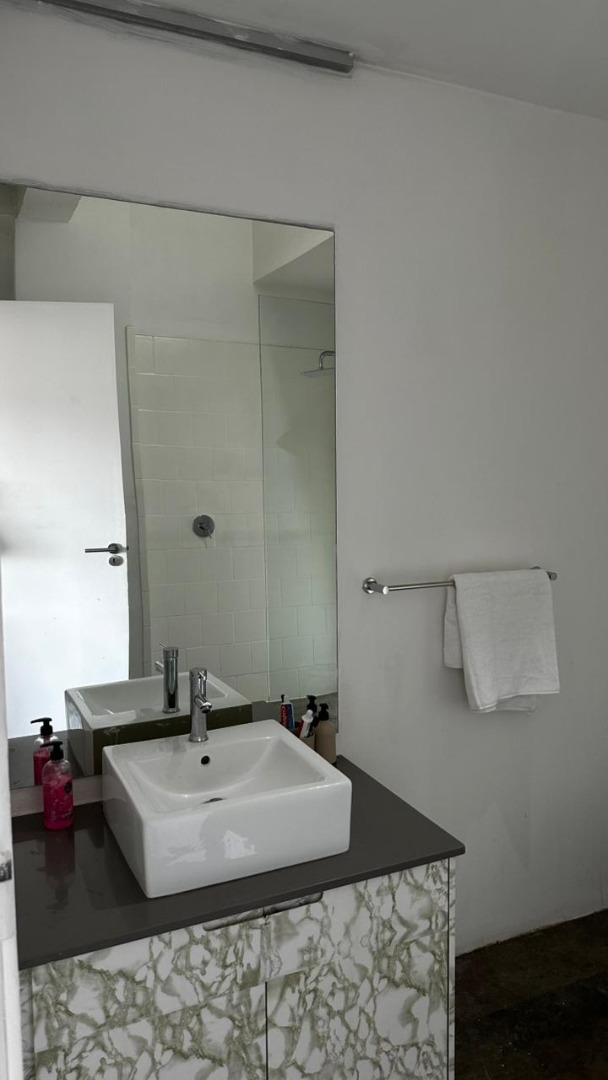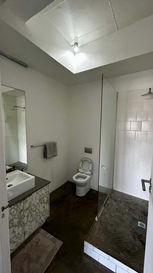 The modern bathroom is a sanctuary, featuring a contemporary vanity with a vessel sink, a glass-enclosed shower with subway tiles, and a skylight that introduces additional natural light. A private balcony extends the living space outdoors, offering a personal spot to enjoy the city's energy. The building provides the convenience of lifts and is fibre-ready, ensuring seamless connectivity.