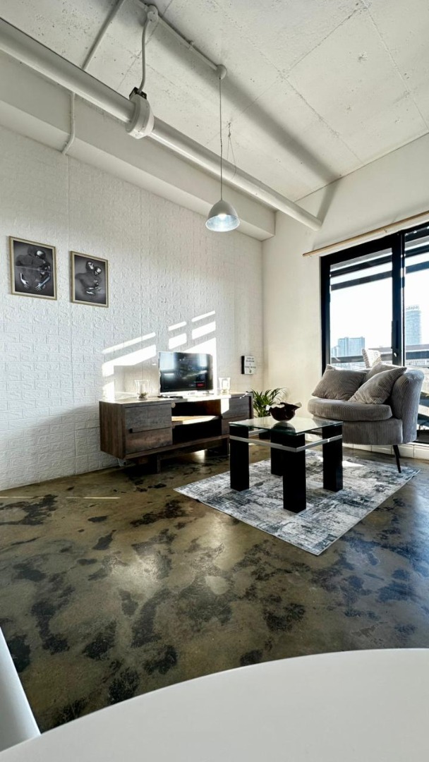 The interior is bathed in natural light, thanks to large windows that also offer captivating city views, enhancing the sense of space and connection to the urban environment. White walls provide a clean canvas, complemented by a textured accent wall that adds visual interest. The well-appointed kitchen boasts modern finishes, including a sleek marble-look countertop and classic subway tiles, perfect for everyday convenience. The lounge area provides a comfortable retreat within this thoughtfully designed space.