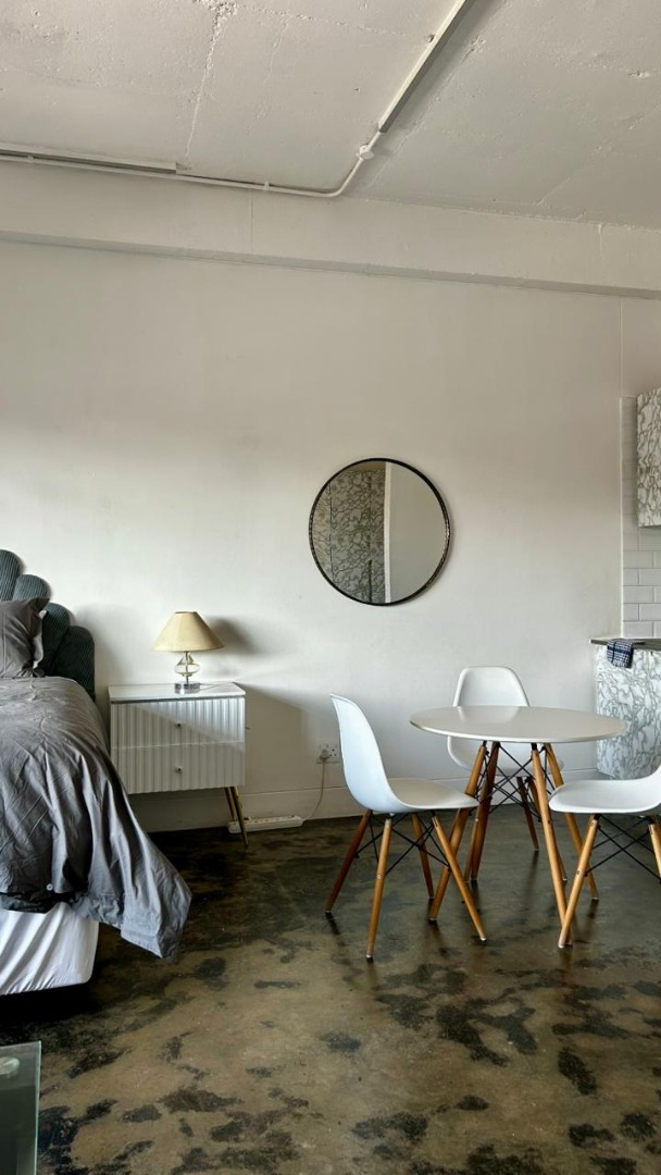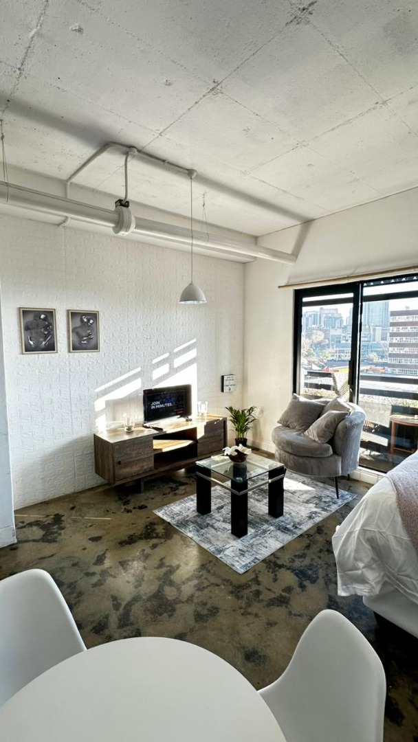 Discover contemporary urban living in this stylish studio apartment at Hallmark House, perfectly situated in the vibrant Maboneng precinct of Johannesburg. Spanning a comfortable 45 square metres, this residence embodies a modern industrial-chic aesthetic, featuring distinctive polished concrete flooring and exposed concrete ceilings that add character and a raw, sophisticated edge. The open-plan layout seamlessly integrates the living, sleeping, and kitchen areas, creating a fluid and functional space ideal for a dynamic metropolitan lifestyle.