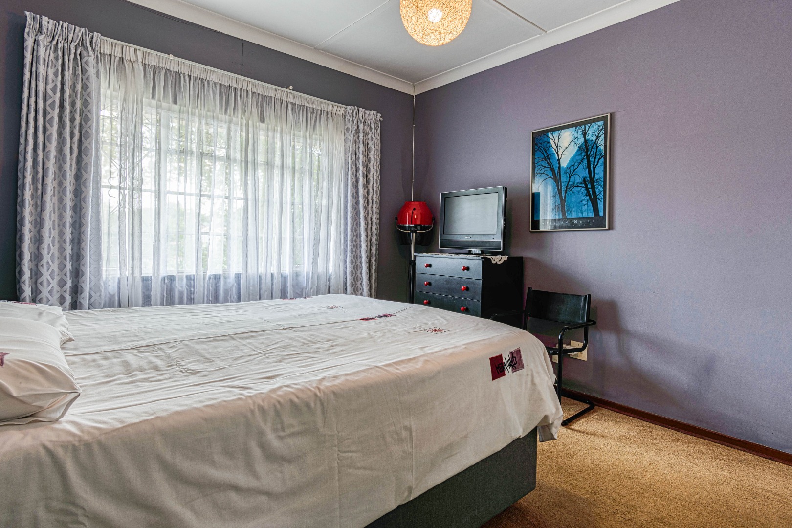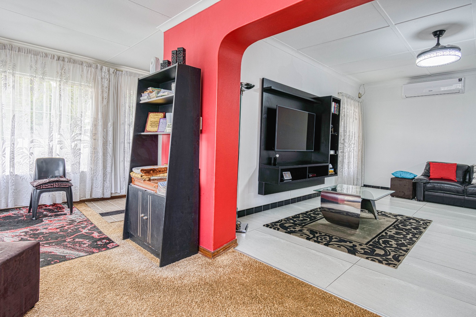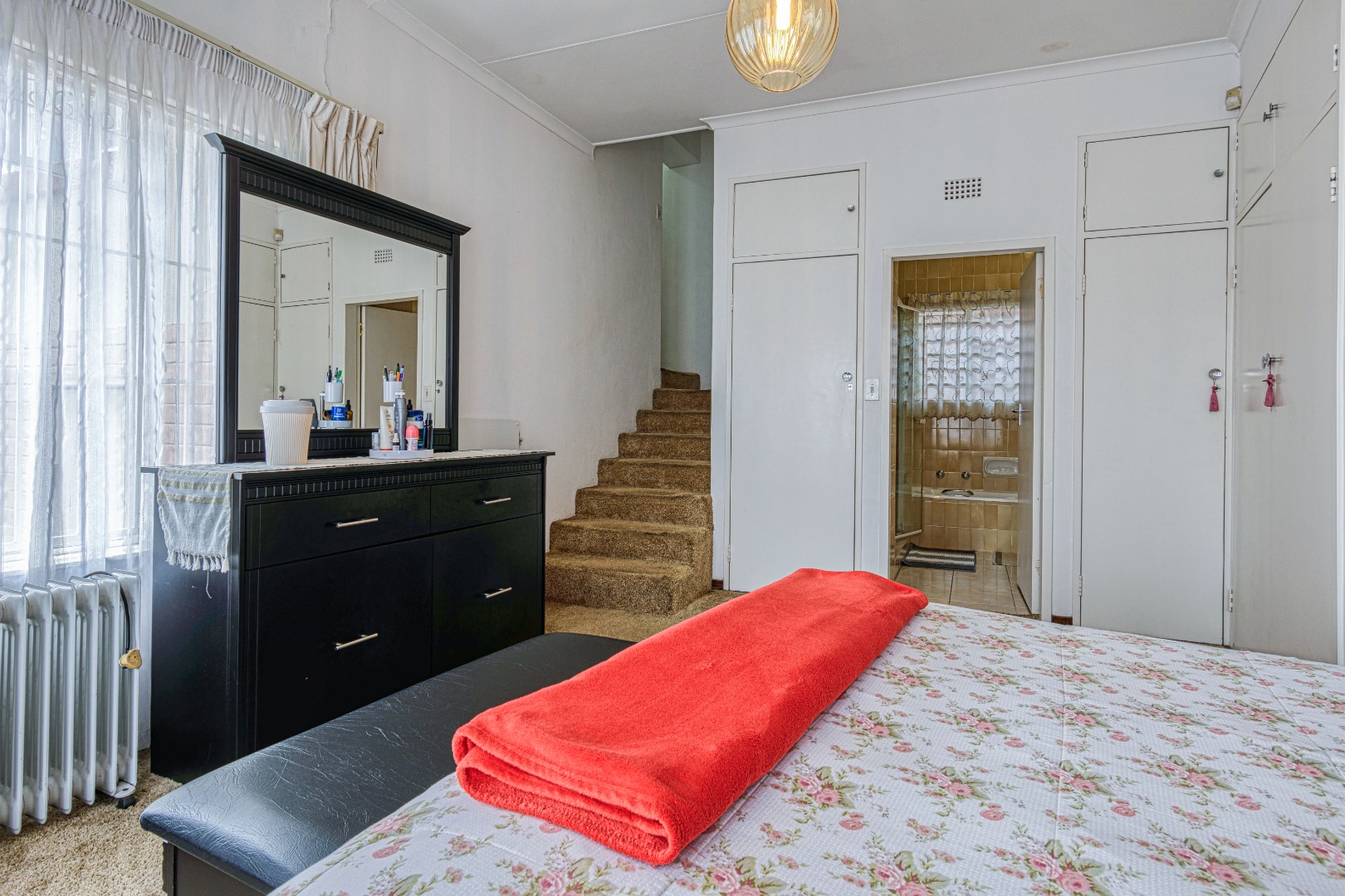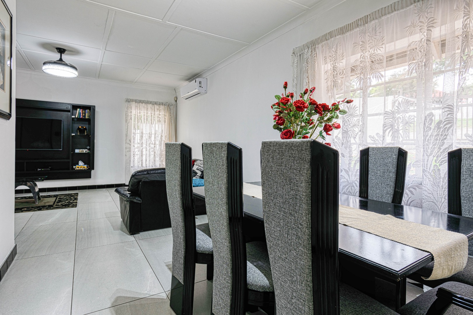 This traditional single-story residence in the suburban heart of Mondeor, Johannesburg, presents a welcoming kerb appeal with its classic red tiled roof, brick accents, and a generously sized, gently sloping grassy lawn adorned with mature trees. The property is secured by a solid perimeter wall and features a separate outbuilding, offering versatile potential for storage or additional space. Inside, the home boasts a functional and comfortable layout. The spacious living areas feature modern light-colored tiled flooring, complemented by a wall-mounted entertainment unit, air conditioning, and a ceiling fan for year-round comfort. An open archway seamlessly connects to an additional living space, enhancing the flow. The kitchen is equipped with light wood-look cabinetry, dark speckled countertops, a built-in oven, hob, microwave, and an integrated fridge space, alongside a practical double basin stainless steel sink. Adjacent to the kitchen, the dining room offers ample space for entertaining, featuring a large dining table and abundant natural light. The residence comprises three well-proportioned bedrooms and two bathrooms. Bedrooms are spacious, benefiting from ample natural light, and include built-in white wardrobes for storage. The main bedroom offers direct access to one of the bathrooms, providing convenience and privacy. While some areas feature comfortable carpeting, the overall aesthetic is designed for practical family living. Outdoor living is well-catered for with a large, well-maintained garden, perfect for pets and outdoor activities. The property further benefits from four garages, providing extensive secure parking and storage solutions. For peace of mind, the home is equipped with an alarm system and an access gate. Modern amenities include fibre connectivity and a battery inverter, ensuring reliable power and internet access. Key Features: * 3 Bedrooms, 2 Bathrooms * 4 Garages * Spacious Living and Dining Areas * Equipped Kitchen with Built-in Appliances * Large Garden with Mature Trees * Alarm System and Access Gate * Fibre Connectivity and Battery Inverter * Air Conditioning and Ceiling Fan * Pets Allowed