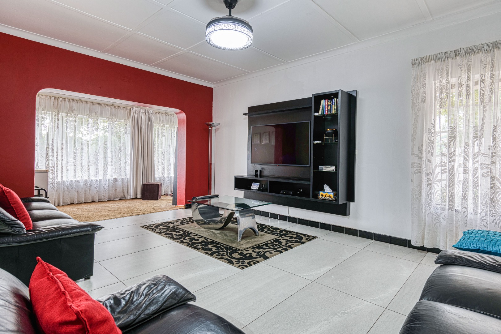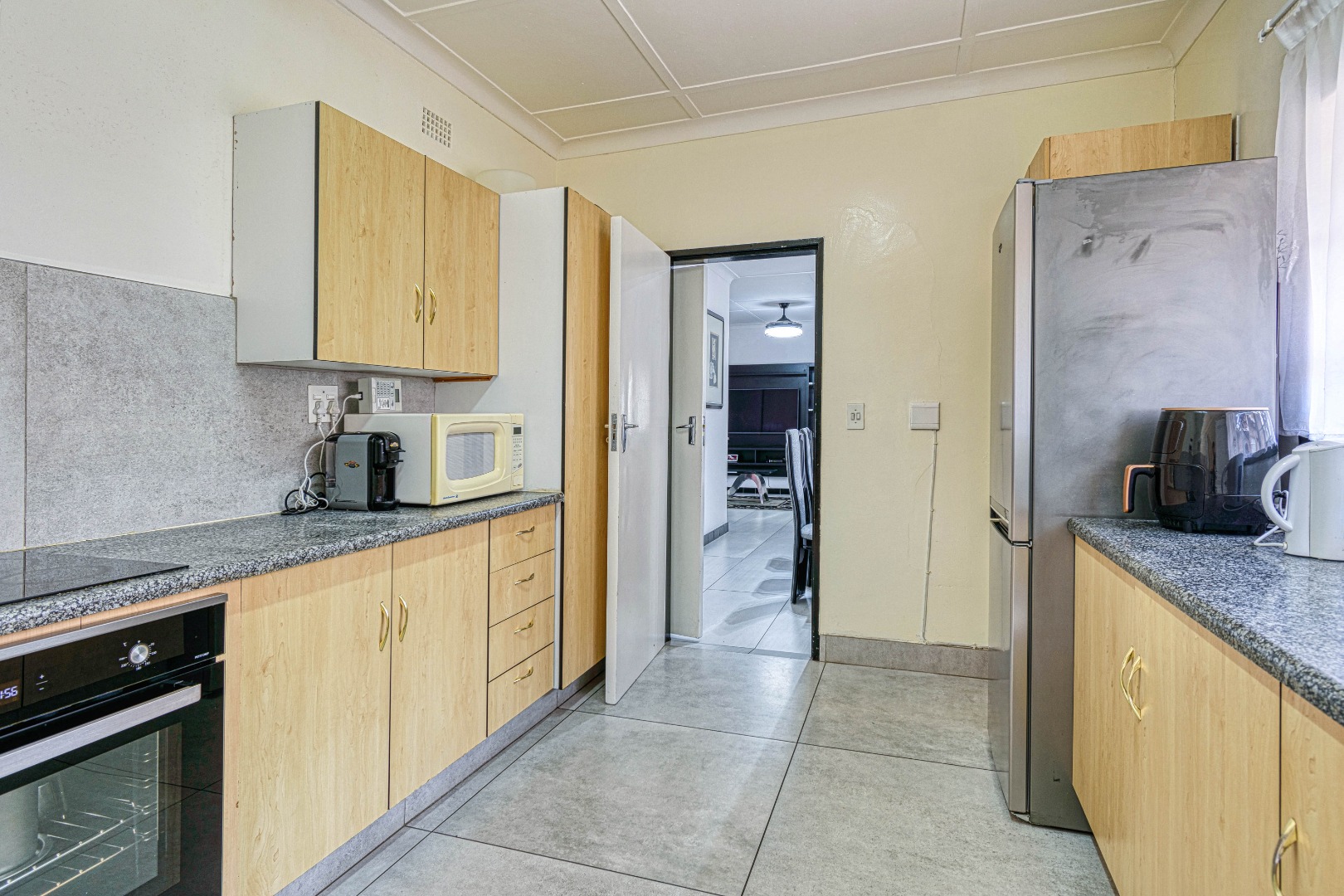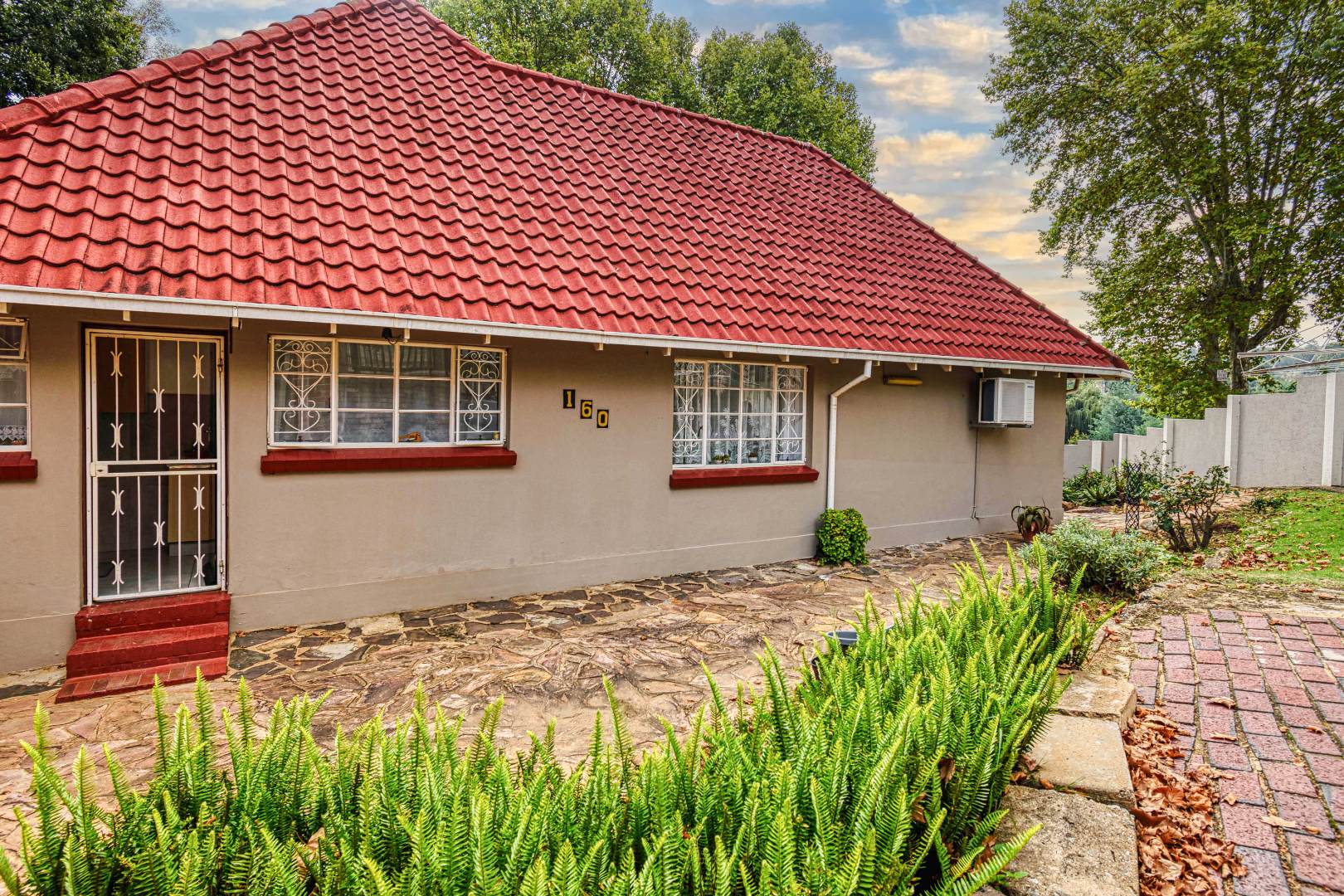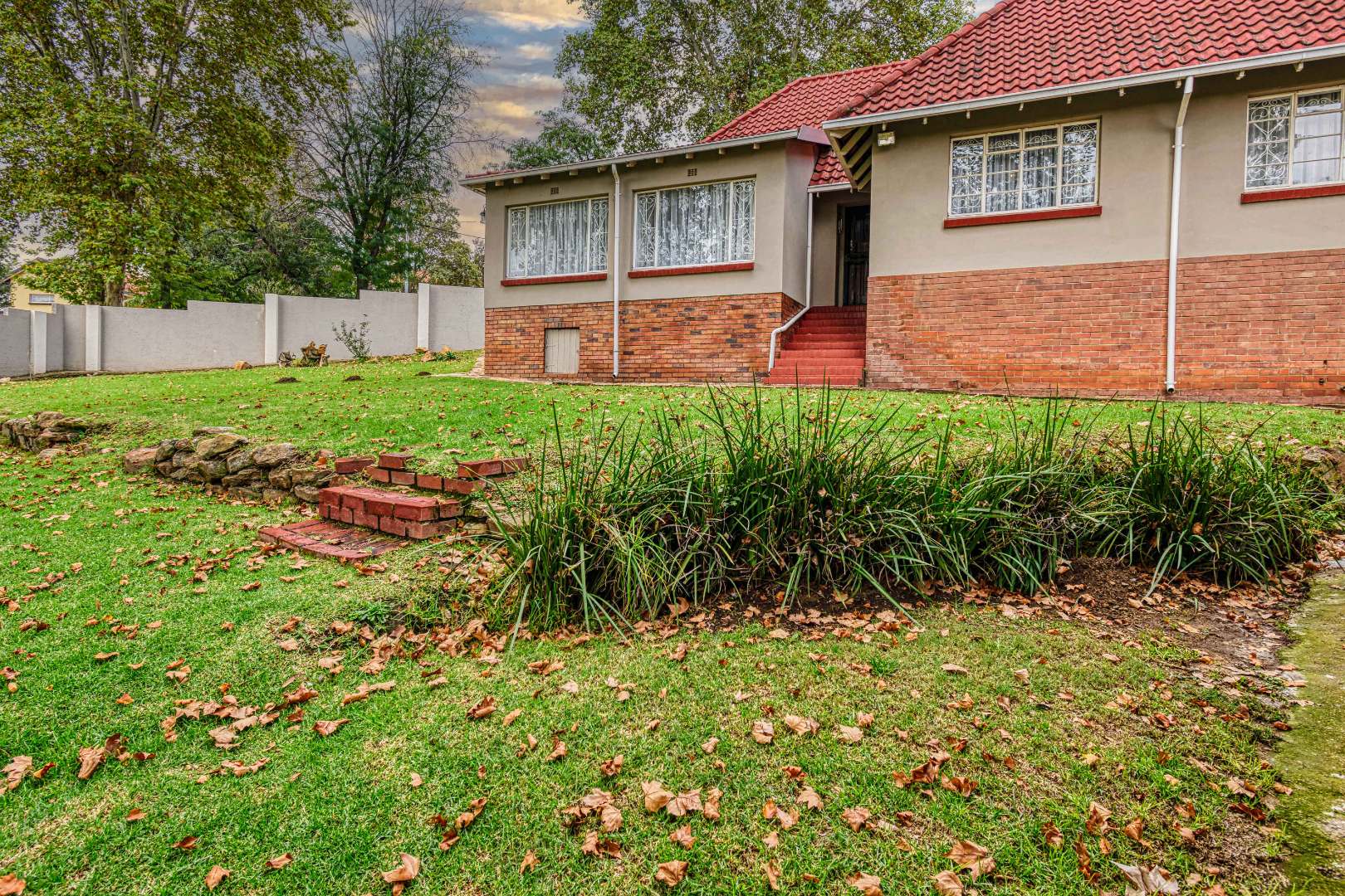 This traditional single-story residence in the suburban heart of Mondeor, Johannesburg, presents a welcoming kerb appeal with its classic red tiled roof, brick accents, and a generously sized, gently sloping grassy lawn adorned with mature trees. The property is secured by a solid perimeter wall and features a separate outbuilding, offering versatile potential for storage or additional space. Inside, the home boasts a functional and comfortable layout. The spacious living areas feature modern light-colored tiled flooring, complemented by a wall-mounted entertainment unit, air conditioning, and a ceiling fan for year-round comfort. An open archway seamlessly connects to an additional living space, enhancing the flow. The kitchen is equipped with light wood-look cabinetry, dark speckled countertops, a built-in oven, hob, microwave, and an integrated fridge space, alongside a practical double basin stainless steel sink. Adjacent to the kitchen, the dining room offers ample space for entertaining, featuring a large dining table and abundant natural light. The residence comprises three well-proportioned bedrooms and two bathrooms. Bedrooms are spacious, benefiting from ample natural light, and include built-in white wardrobes for storage. The main bedroom offers direct access to one of the bathrooms, providing convenience and privacy. While some areas feature comfortable carpeting, the overall aesthetic is designed for practical family living. Outdoor living is well-catered for with a large, well-maintained garden, perfect for pets and outdoor activities. The property further benefits from four garages, providing extensive secure parking and storage solutions. For peace of mind, the home is equipped with an alarm system and an access gate. Modern amenities include fibre connectivity and a battery inverter, ensuring reliable power and internet access. Key Features: * 3 Bedrooms, 2 Bathrooms * 4 Garages * Spacious Living and Dining Areas * Equipped Kitchen with Built-in Appliances * Large Garden with Mature Trees * Alarm System and Access Gate * Fibre Connectivity and Battery Inverter * Air Conditioning and Ceiling Fan * Pets Allowed