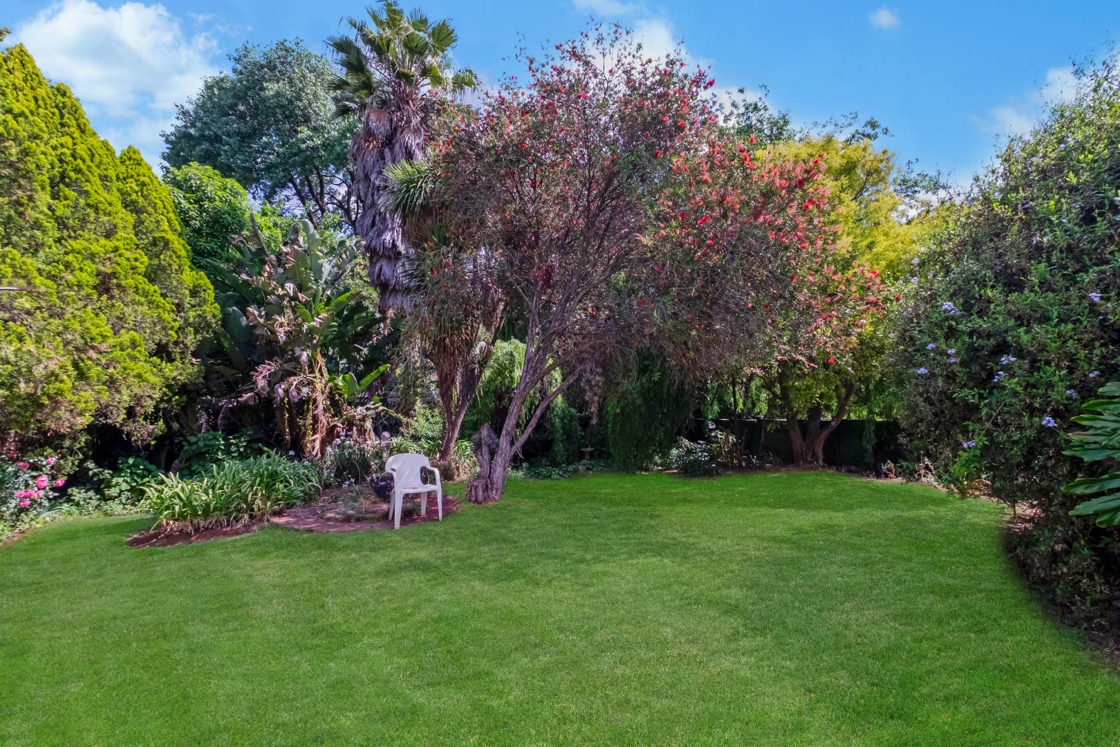 The full bathroom conveniently serves as both an en-suite and guest bathroom. Additional features include A separate laundry room for under-counter appliances and a beautifully established garden filled with mature plants and greenery.
