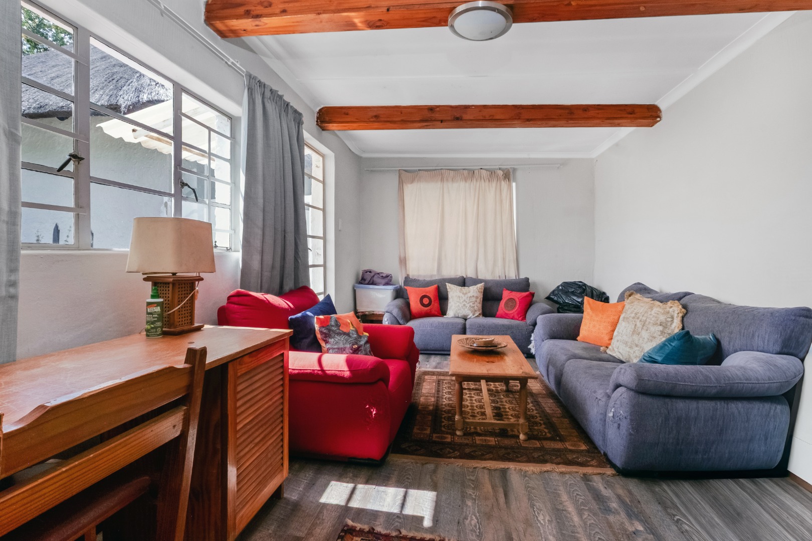 The 1-bedroom cottage features an inviting open-plan lounge and dining area, with double doors opening onto a covered patio— ideal for relaxed outdoor living.