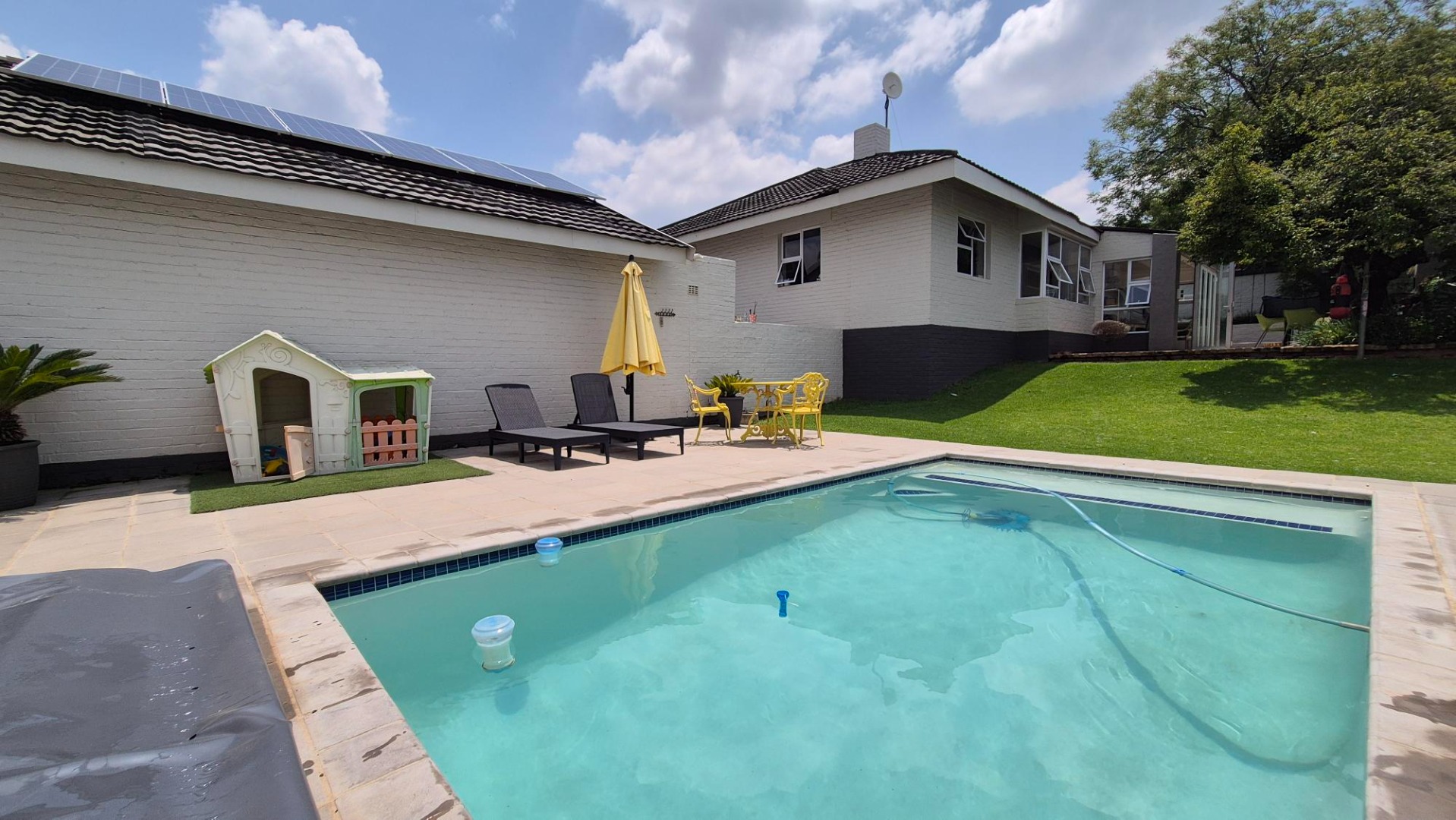 This home offers two comfortable bedrooms that share a bathroom, and a magnificent main suite, with spacious dressing room and ample sized dream en-suite bathroom. Outside, the property truly shines with its expansive paved driveway leading to a double garage and ample parking for up to six vehicles. The lush garden, complete with water tanks, provides a serene backdrop, and you'll love the inviting pool and a fantastic patio area featuring a built-in braai and fire pit– perfect for those sunny South African get-togethers.