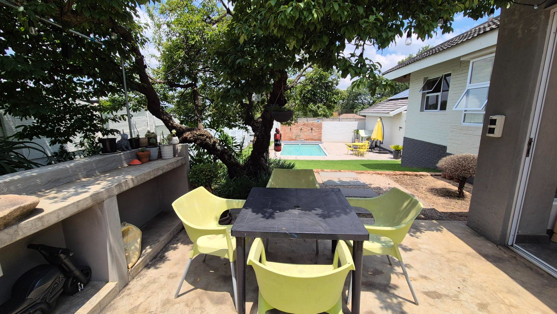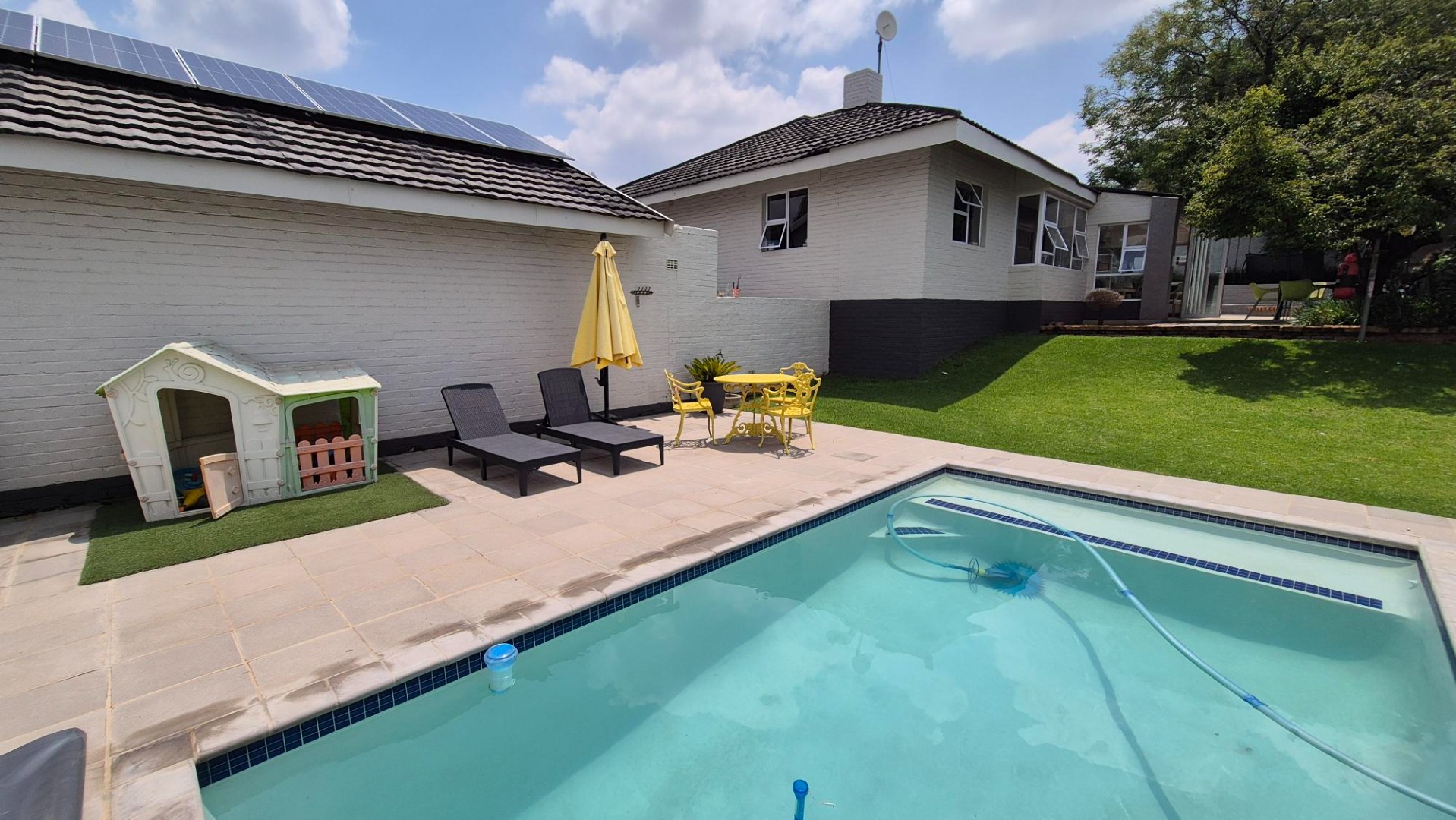 This home offers two comfortable bedrooms that share a bathroom, and a magnificent main suite, with spacious dressing room and ample sized dream en-suite bathroom. Outside, the property truly shines with its expansive paved driveway leading to a double garage and ample parking for up to six vehicles. The lush garden, complete with water tanks, provides a serene backdrop, and you'll love the inviting pool and a fantastic patio area featuring a built-in braai and fire pit– perfect for those sunny South African get-togethers.