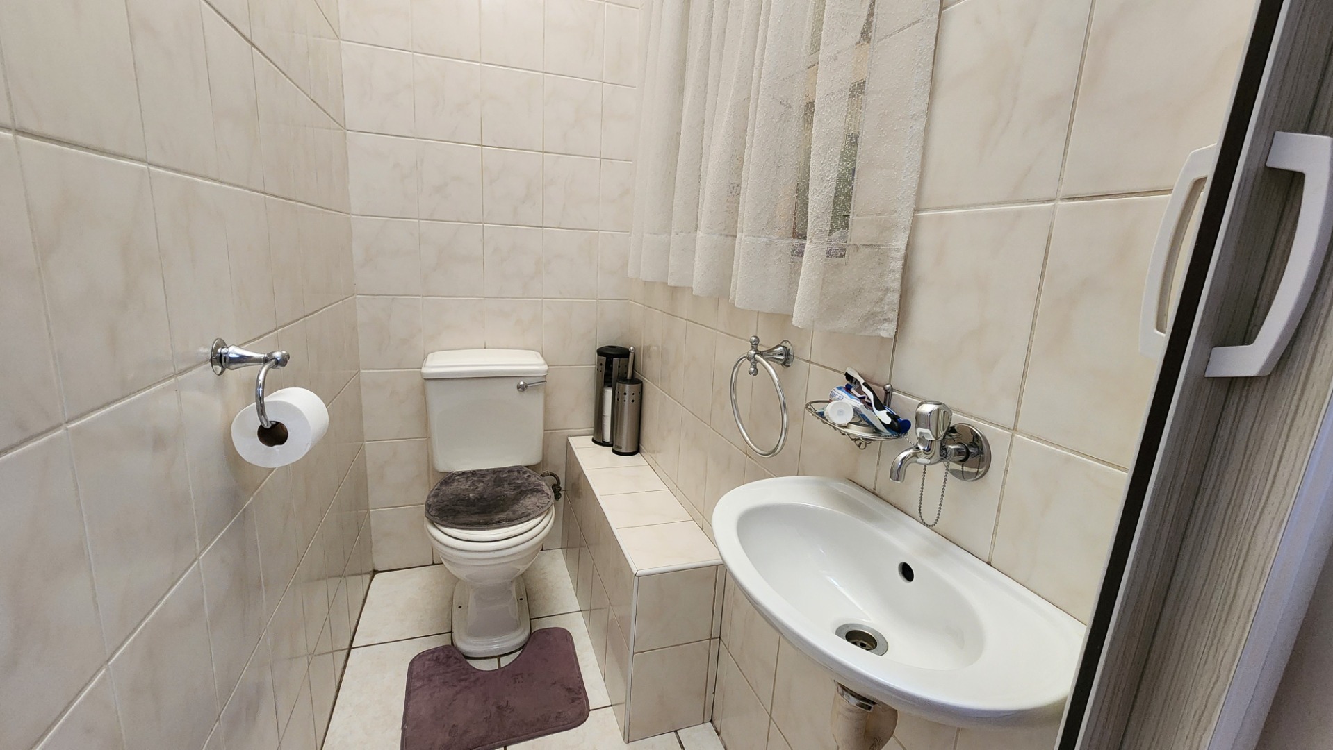 The light-filled lounge features modern wood-look laminate flooring, large windows, and an air-conditioning unit to keep you comfortable all year round. The functional U-shaped kitchen includes crisp white cabinetry, black granite countertops, a built-in oven, hob, extractor fan, and a double sink. It also offers direct access to a private, low-maintenance paved courtyard.