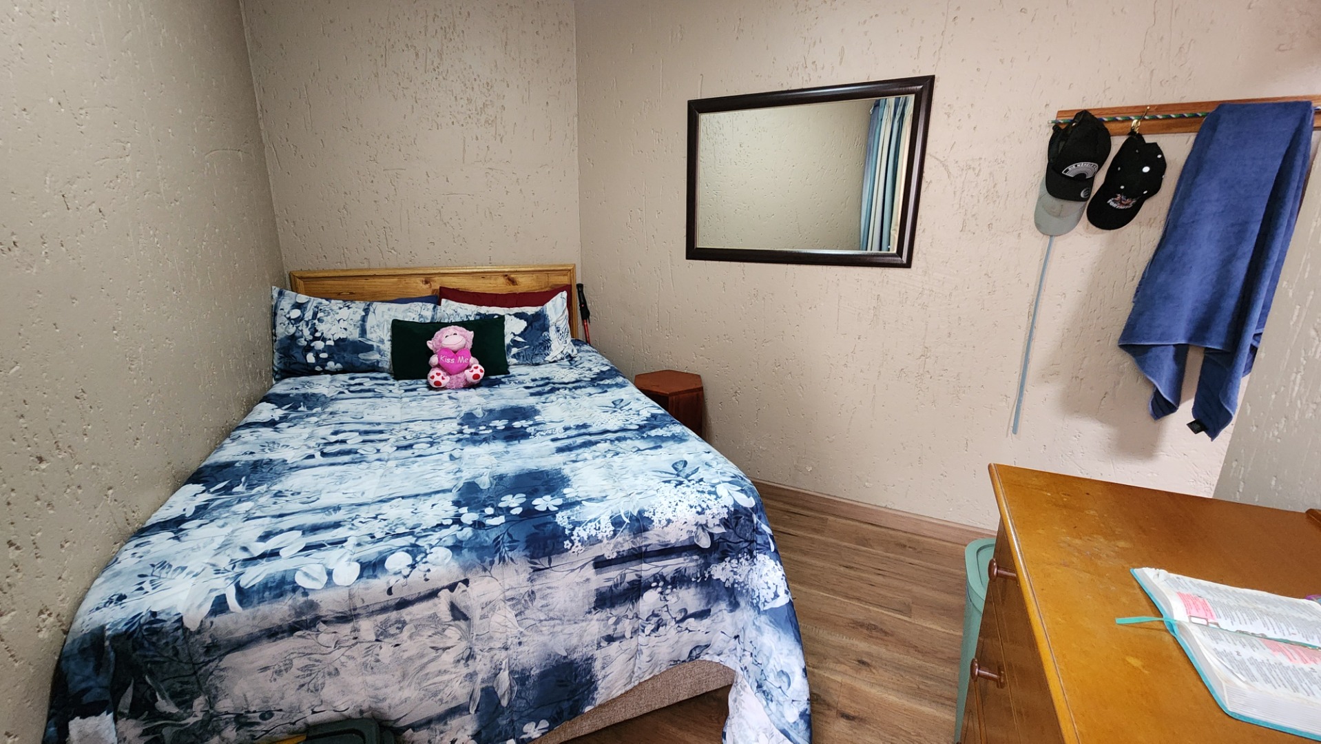 The home includes two comfortable bedrooms, both finished with wood-look laminate flooring. The primary bedroom features ample built-in cupboards and an aircon.