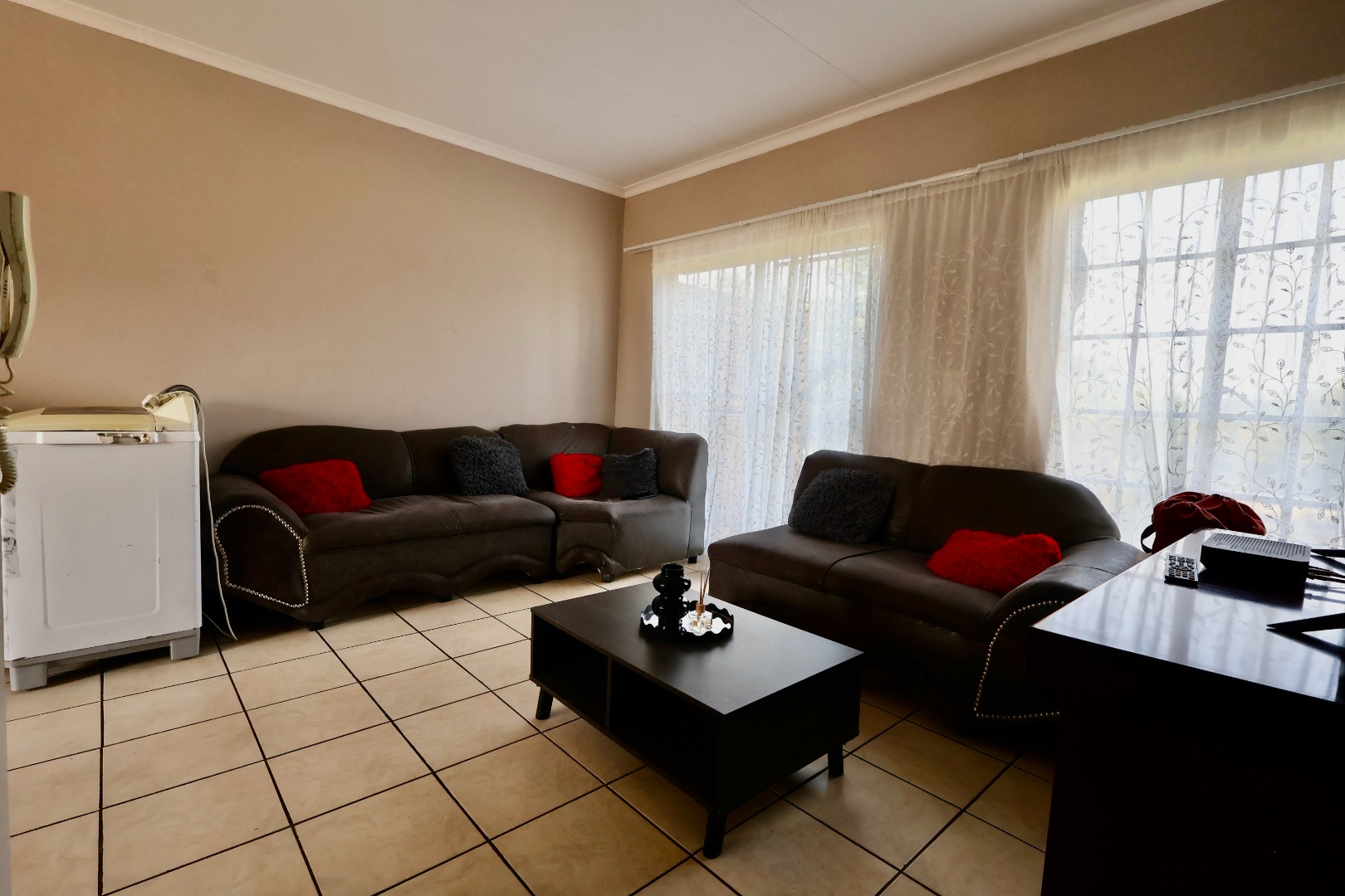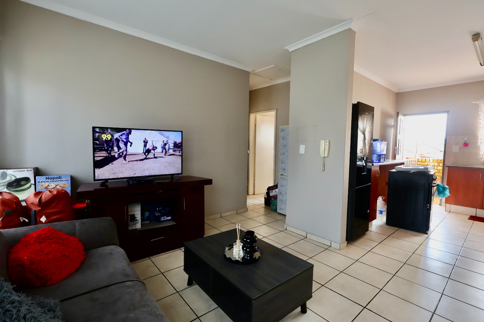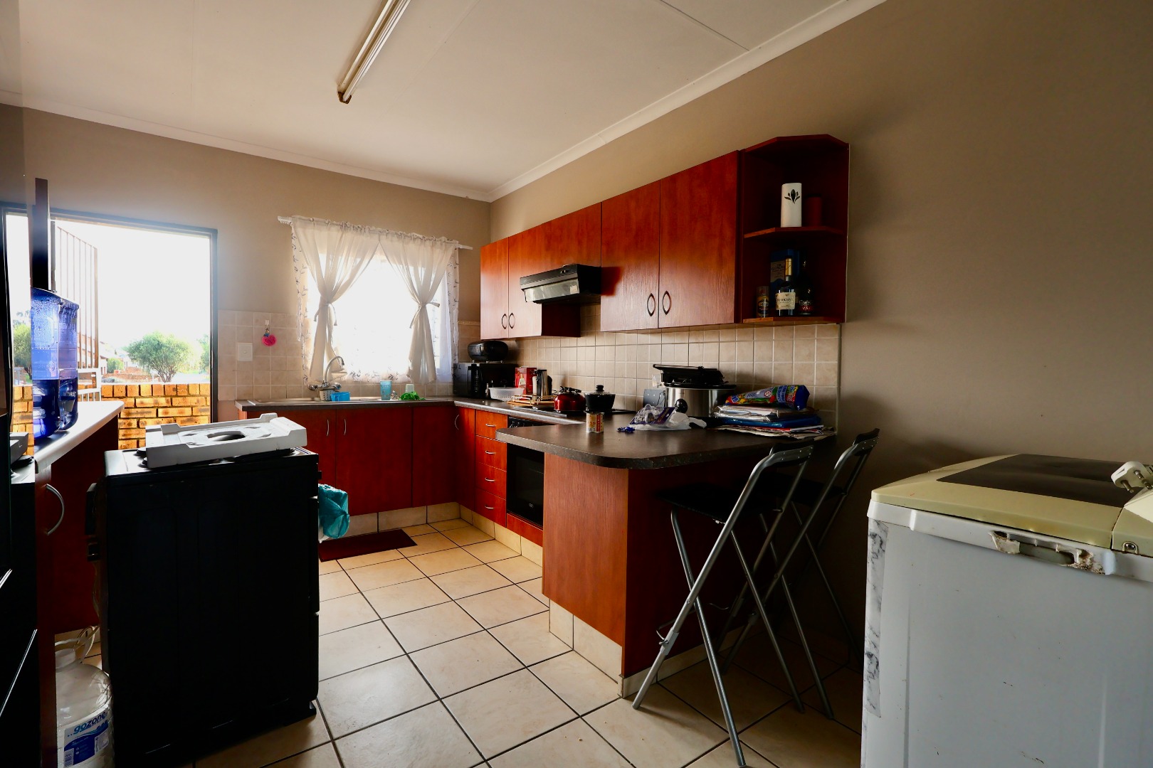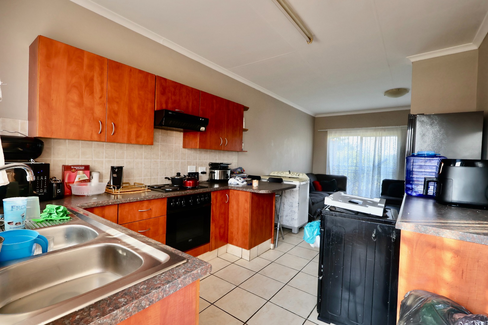 The open-plan living area provides plenty of space for both lounging and dining, creating a warm and inviting atmosphere. The kitchen is practical and well laid out, offering sufficient cupboard space for everyday living.