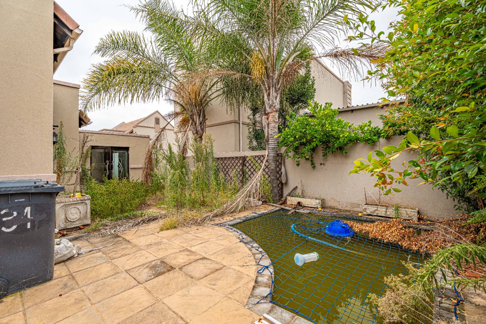Outdoor living is facilitated by a private patio and a swimming pool, offering a refreshing escape once revitalised. The property includes a garden area, enclosed by high walls for privacy, presenting an ideal space for landscaping to create a serene retreat. Parking is well-catered for with a double garage and an additional parking bay, ensuring convenience for residents and guests. An air conditioning unit is also present, adding to the comfort.
