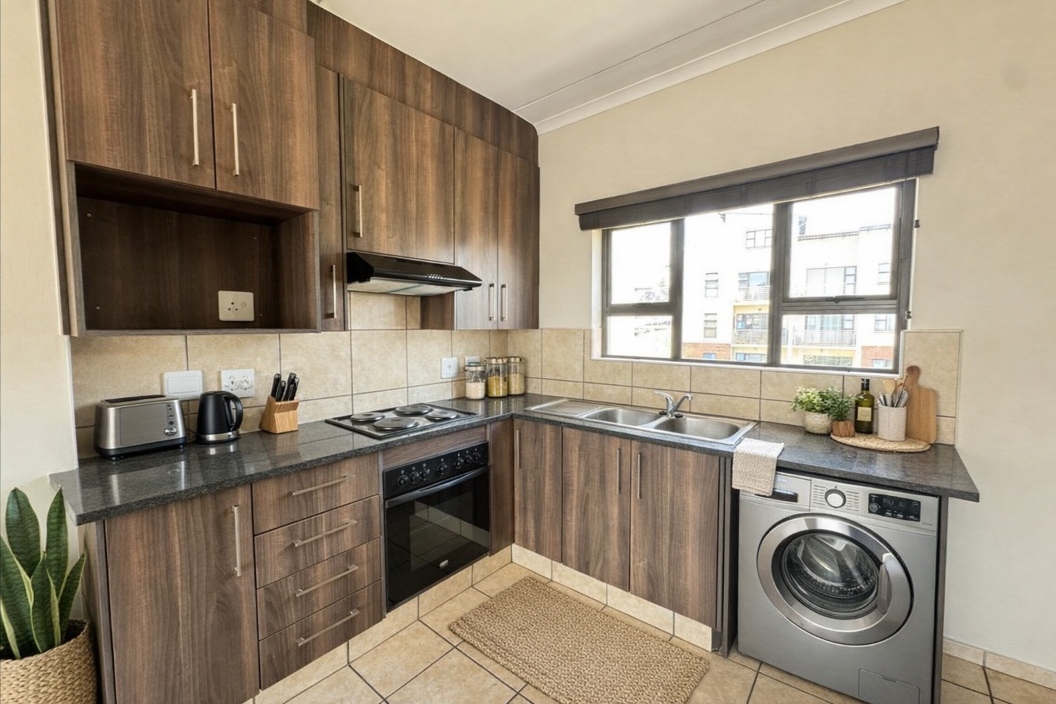 The home welcomes you with a bright open-plan living space that connects the lounge, dining area and kitchen, creating a practical flow for everyday living and entertaining. The contemporary kitchen features dark wood-grain cabinetry, granite-look countertops, an undercounter oven with hob and extractor, a double sink and ample cupboard space.