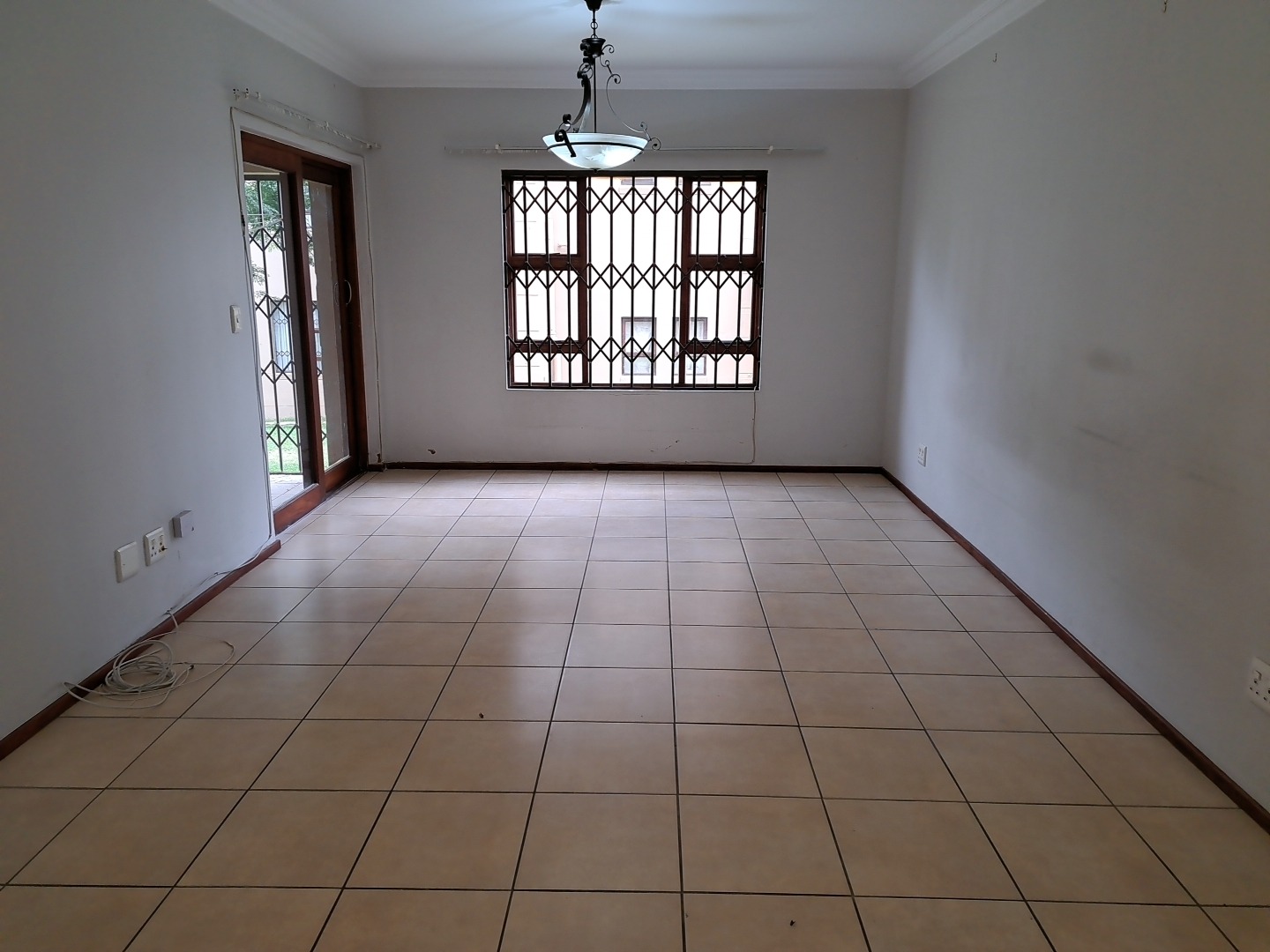 Step inside to an entrance hall that leads into a comfortable lounge and a dedicated dining room, providing ample space for relaxation and entertaining. The functional kitchen is equipped with warm-toned wooden cabinets, dark countertops, a double sink, and stove and oven. A tiled backsplash and security bars on the window add practicality and peace of mind, with space for a washing machine and dishwasher. There is a well size dining room and lounge with tiled floors and a door leading to an enclose patio.