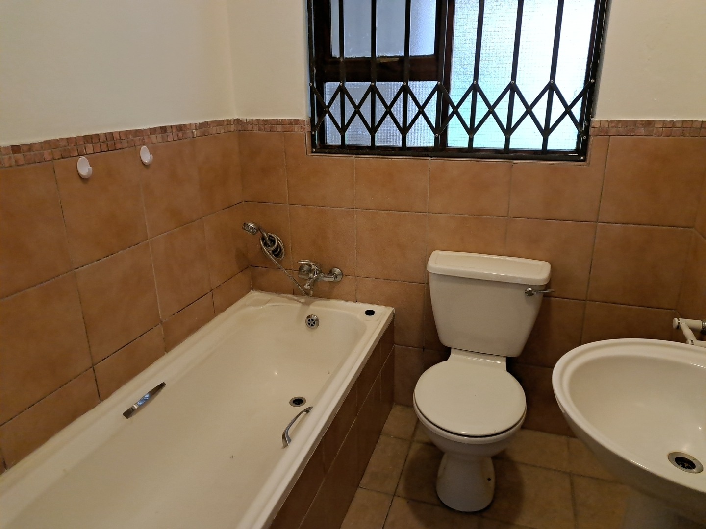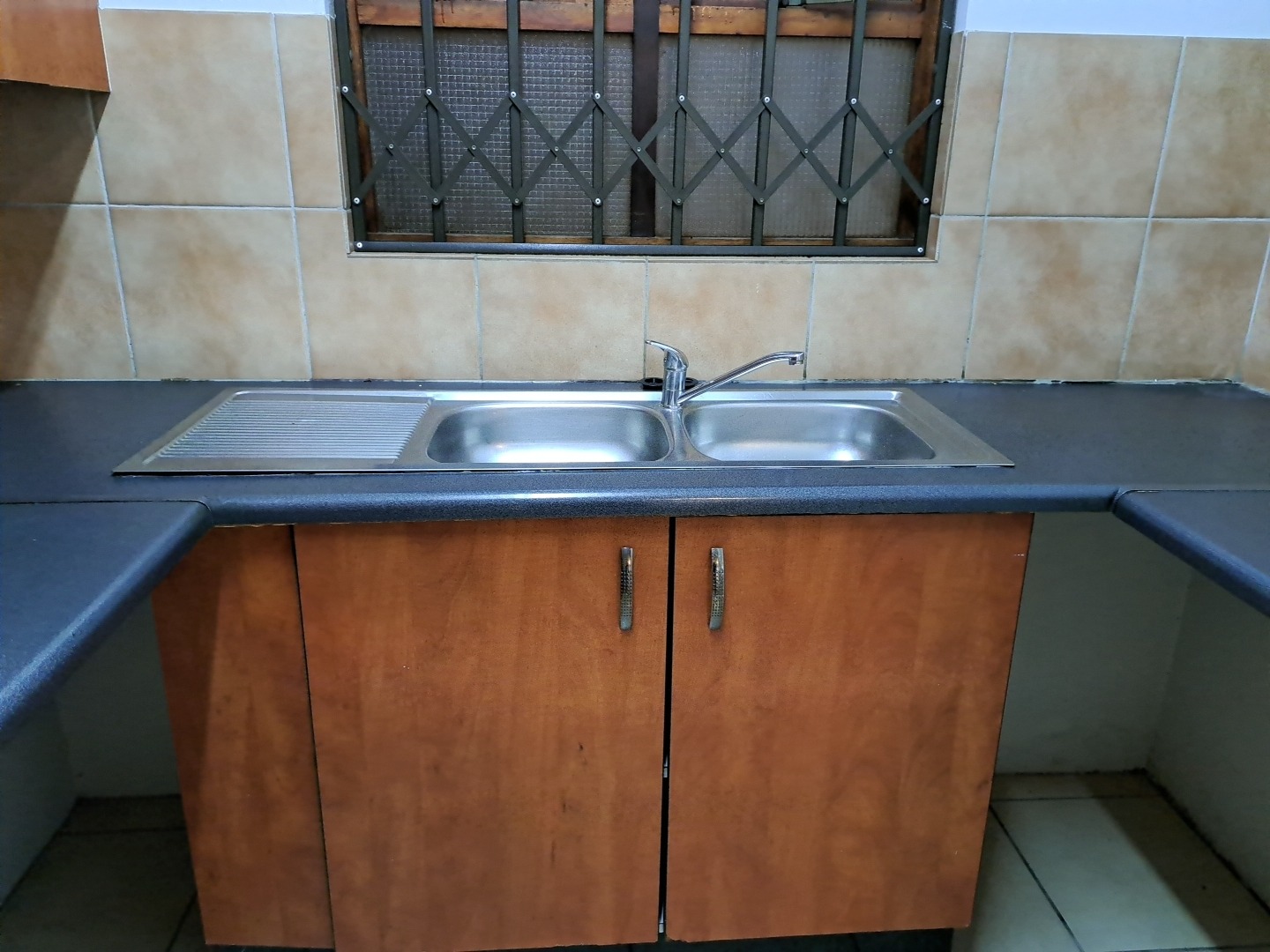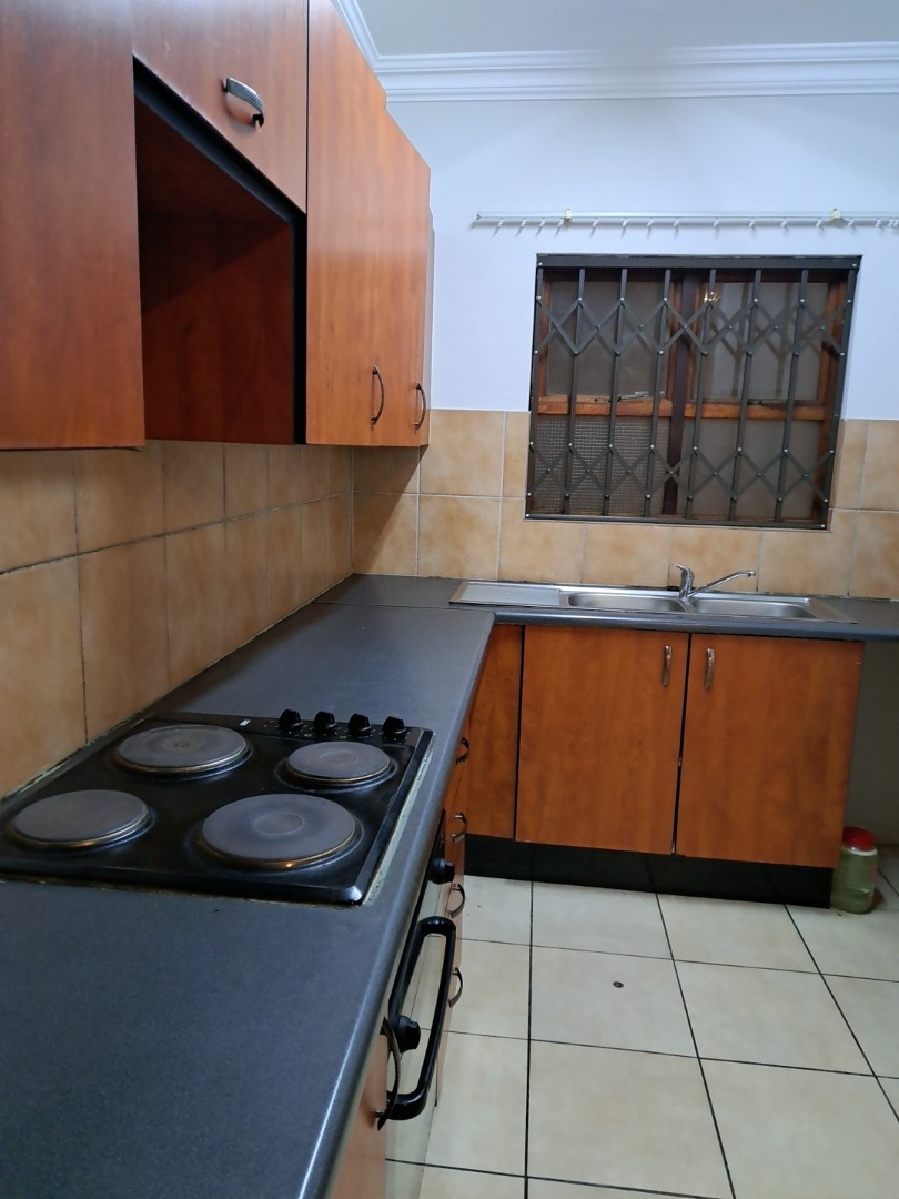 Step inside to an entrance hall that leads into a comfortable lounge and a dedicated dining room, providing ample space for relaxation and entertaining. The functional kitchen is equipped with warm-toned wooden cabinets, dark countertops, a double sink, and stove and oven. A tiled backsplash and security bars on the window add practicality and peace of mind, with space for a washing machine and dishwasher. There is a well size dining room and lounge with tiled floors and a door leading to an enclose patio.