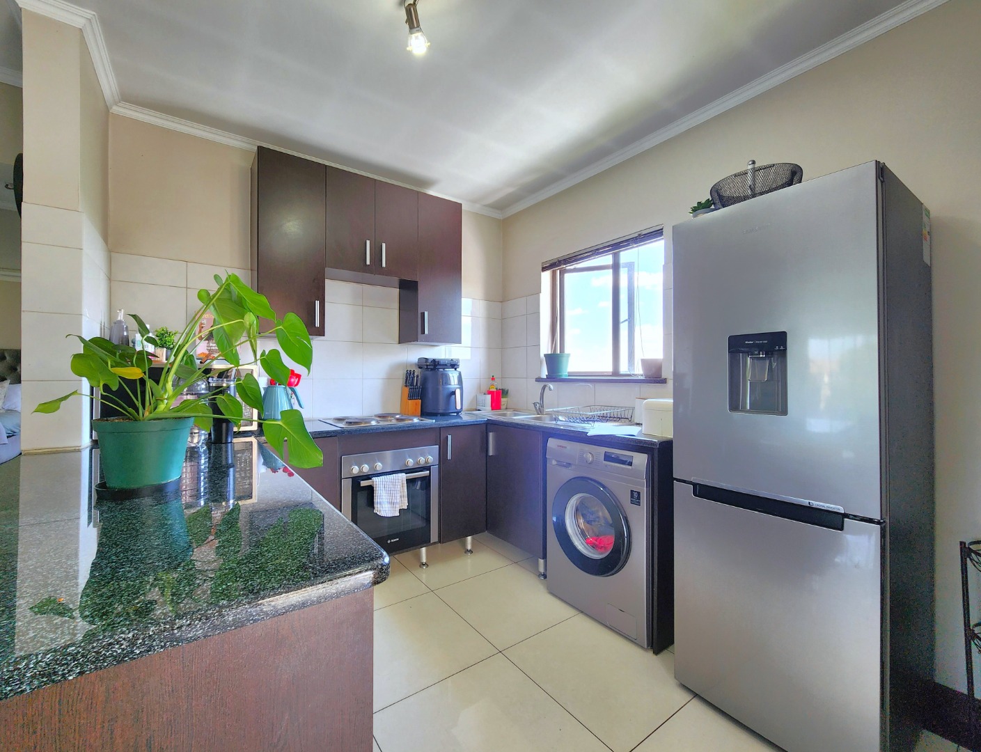 The contemporary kitchen is fitted with granite countertops, ample built-in cupboards, and is filled with natural light throughout the day, making it both practical and inviting.