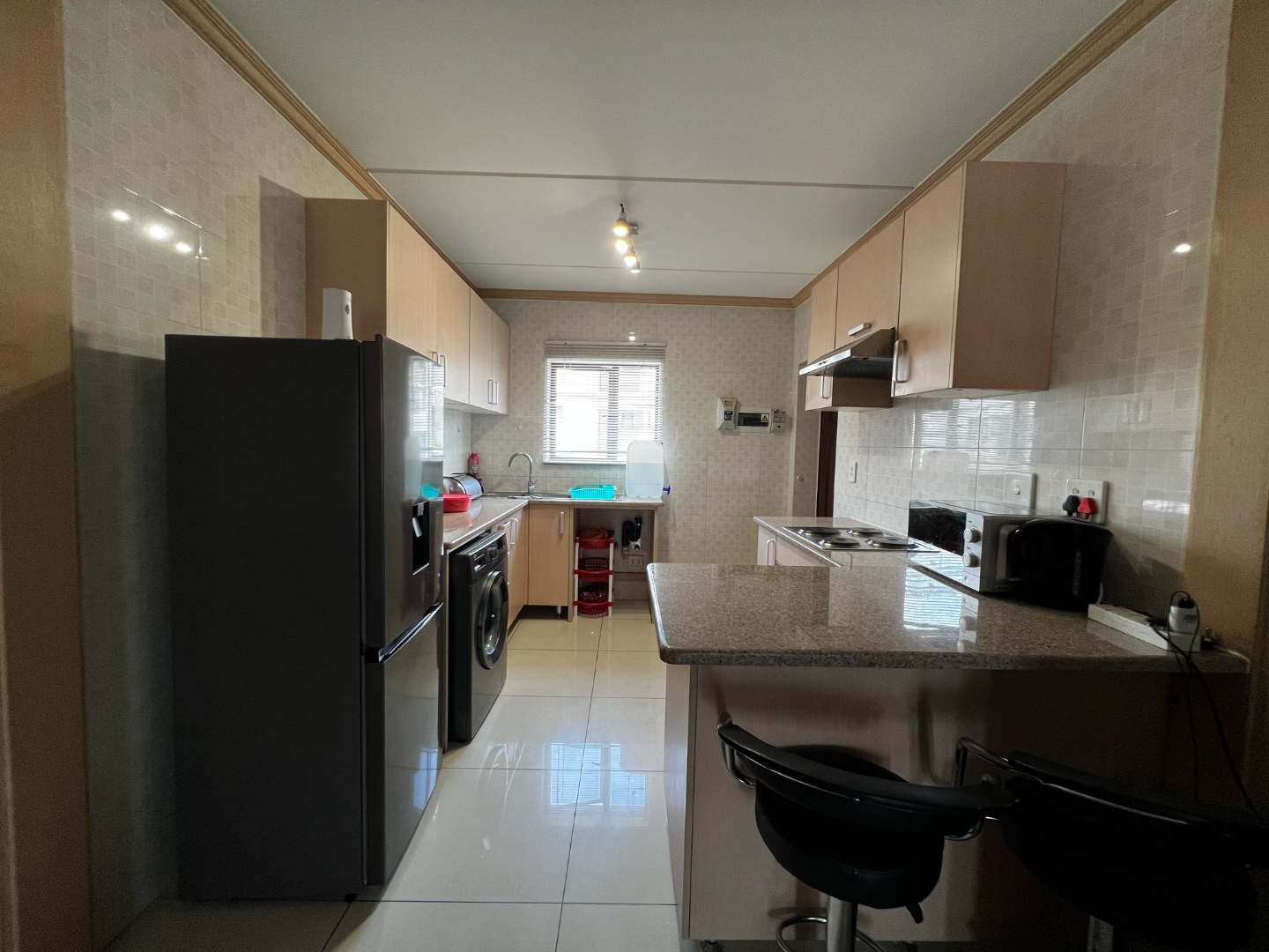 Designed with functionality in mind, the unit offers an open-plan kitchen with ample cupboard space, sleek countertops, and room for appliances, seamlessly connecting to a bright and airy living area. Large windows and a private patio/balcony create a welcoming atmosphere and allow natural light to flow throughout the space.