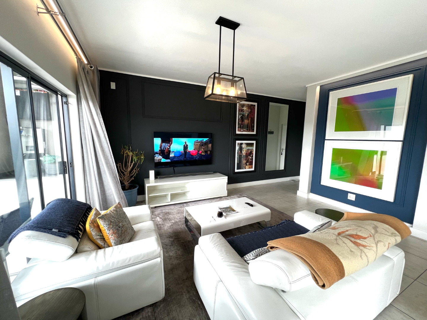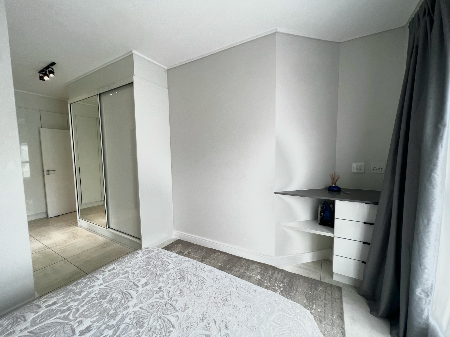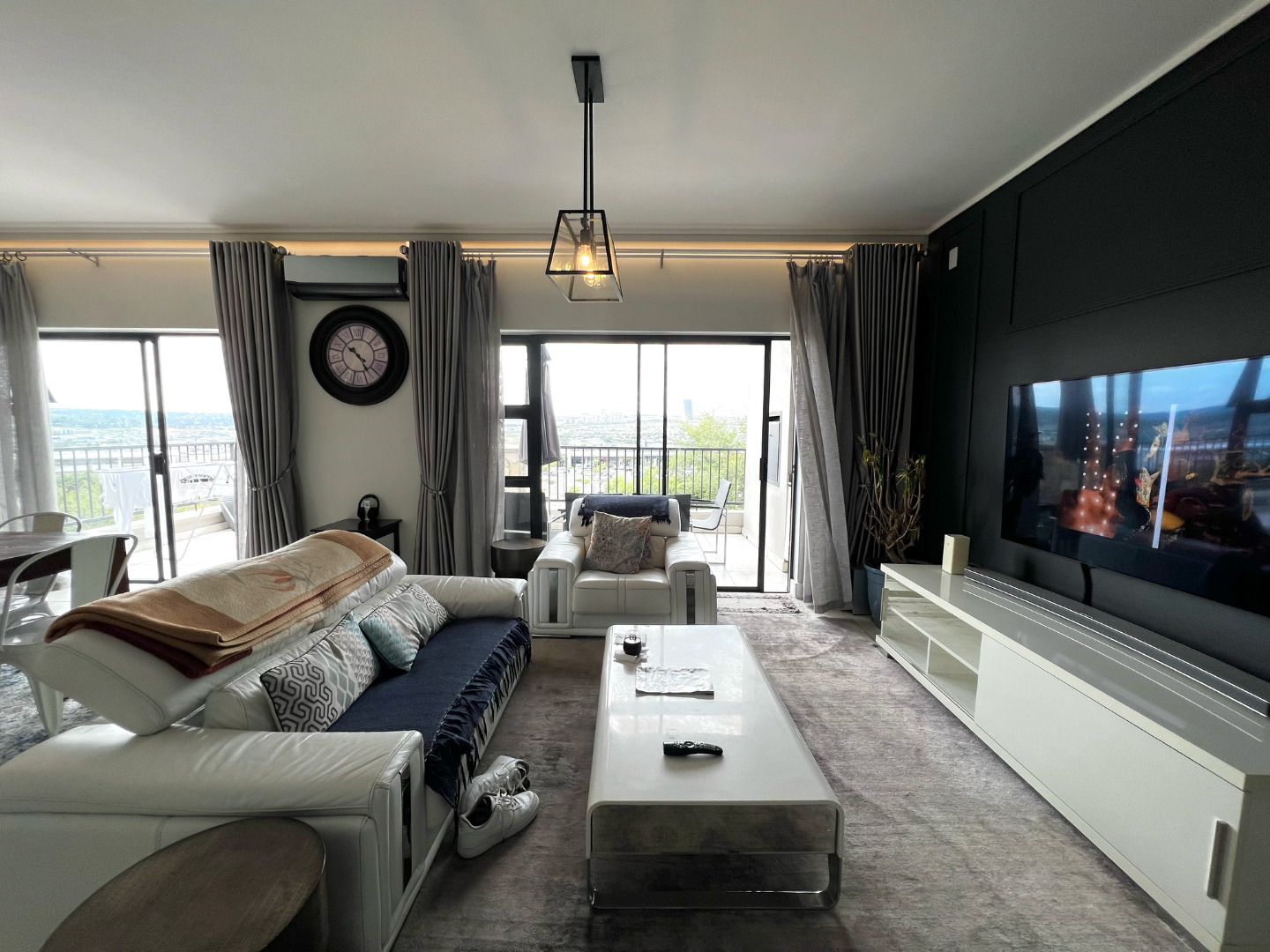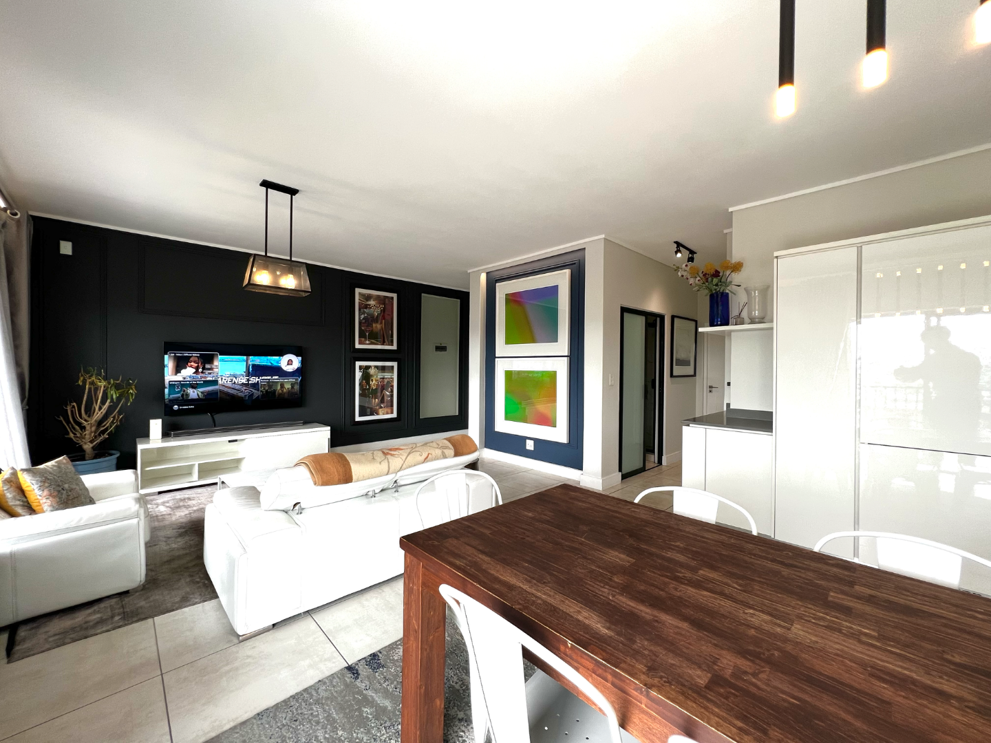 The interior showcases a bright, open-plan lounge with air-conditioning and refined modern finishes, seamlessly flowing into a sleek designer kitchen fitted with high-gloss cabinetry and premium SMEG appliances. The main bedroom is generously proportioned with built-in cupboards and a stylish en-suite bathroom, while the second bedroom is well-sized and serviced by a separate contemporary bathroom, offering flexibility for guests, professionals, or shared living. The private entertainment patio, complete with a built-in braai, creates the perfect space for hosting or simply unwinding while enjoying the elevated panoramic outlook that sets this penthouse apart.