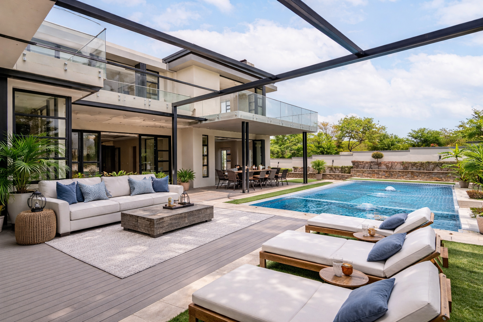- Private Resort Outdoors: A sparkling swimming pool and expansive deck area, further enhanced by a dedicated braai room and lapa for outdoor leisure.