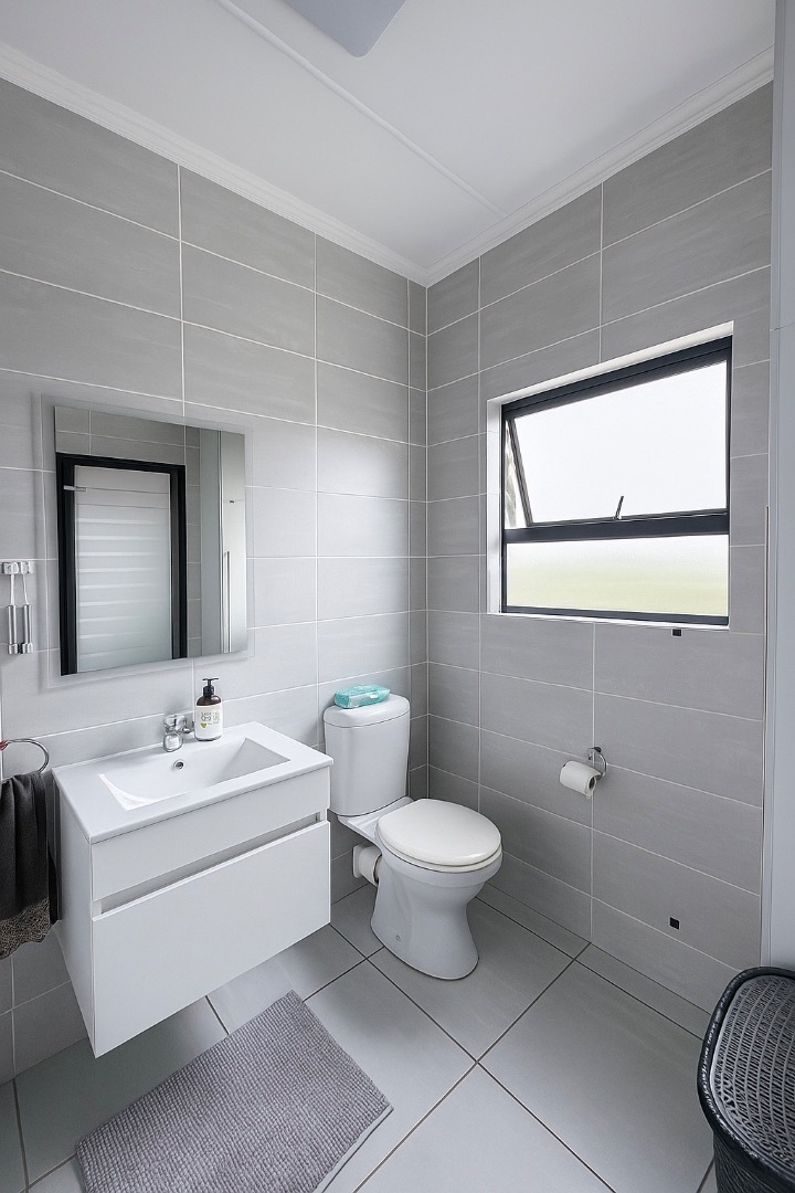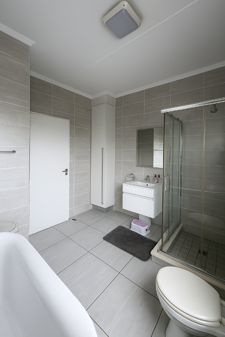 • Guest bathroom is a full bathroom with a bath, shower, toilet, and basin