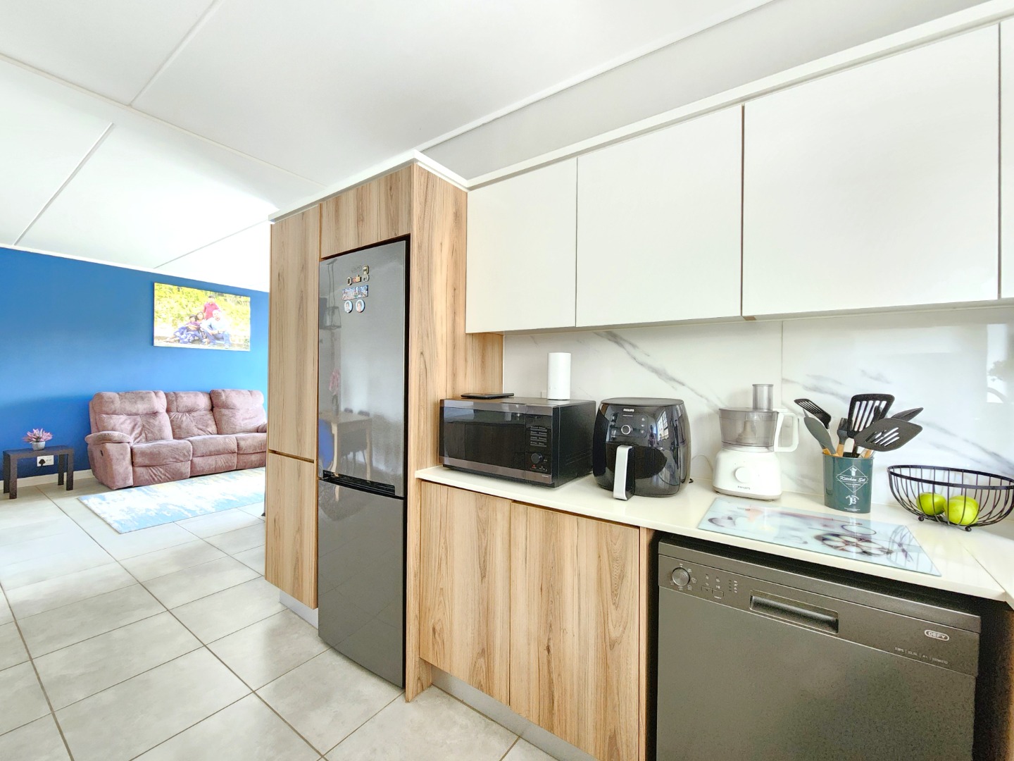 This home offers a seamless open-plan layout, combining a modern kitchen, dining area, and spacious TV lounge that flows effortlessly onto a covered patio, overlooking a generous private garden, ideal for entertaining or relaxing in comfort.