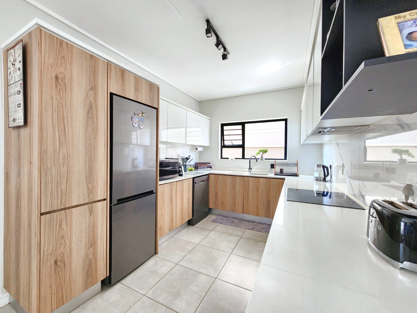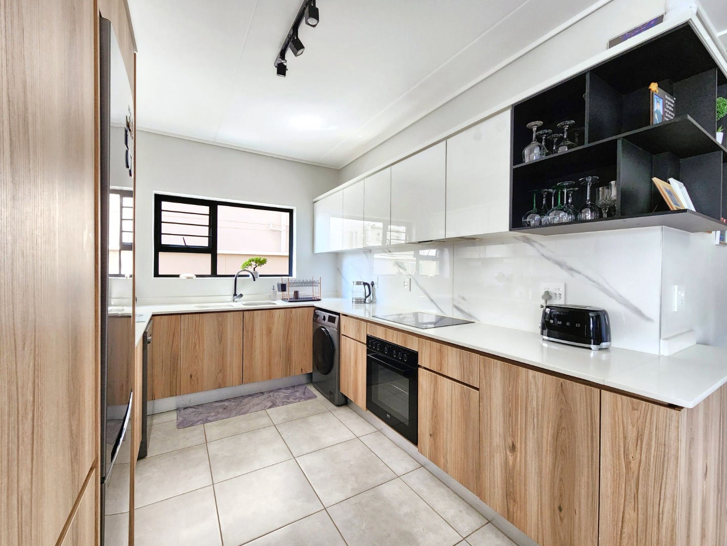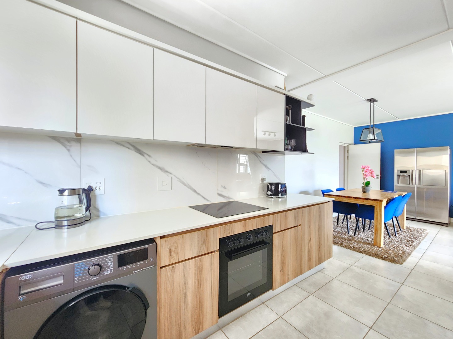 The contemporary kitchen is fully equipped with high-end appliances, ample countertop space, and sleek built-in cupboards, making it both stylish and functional.