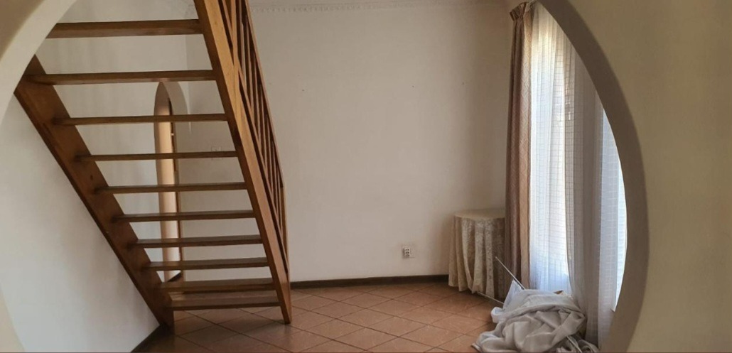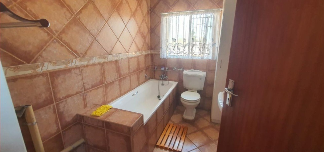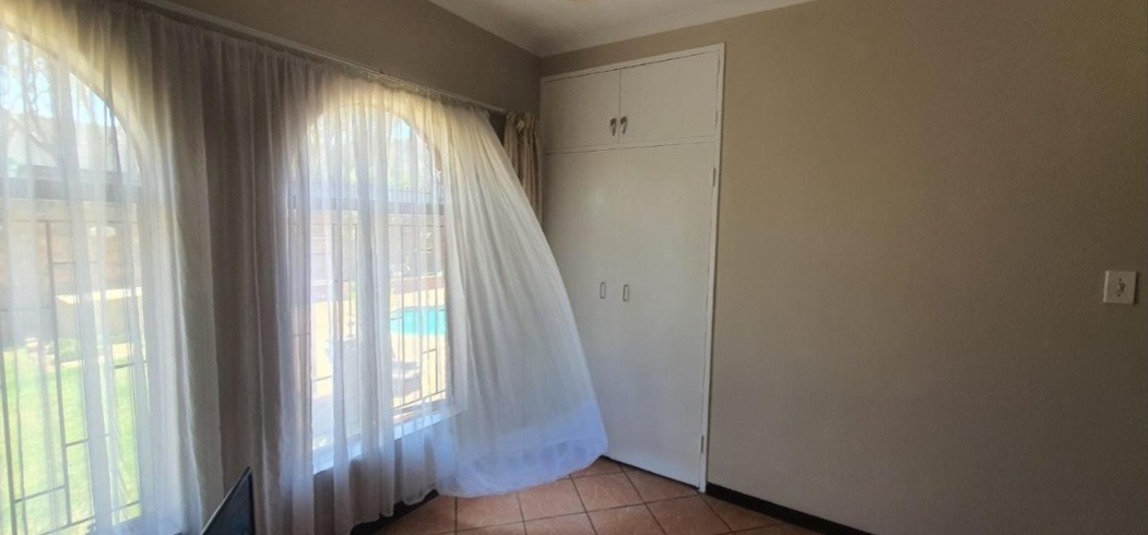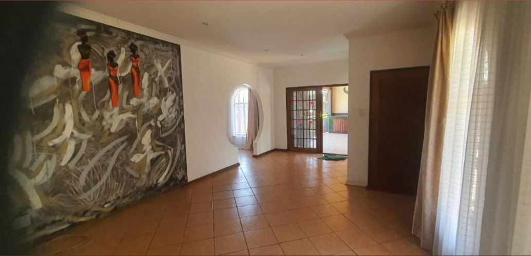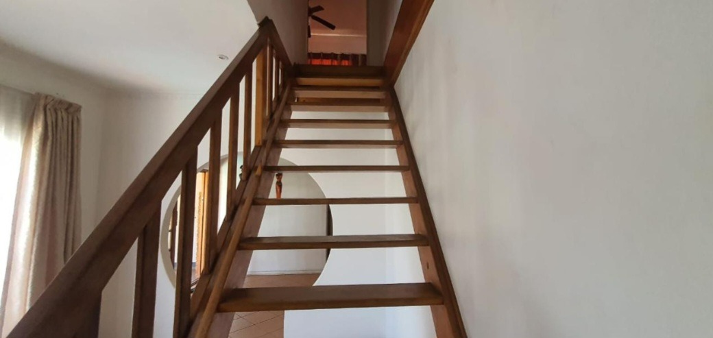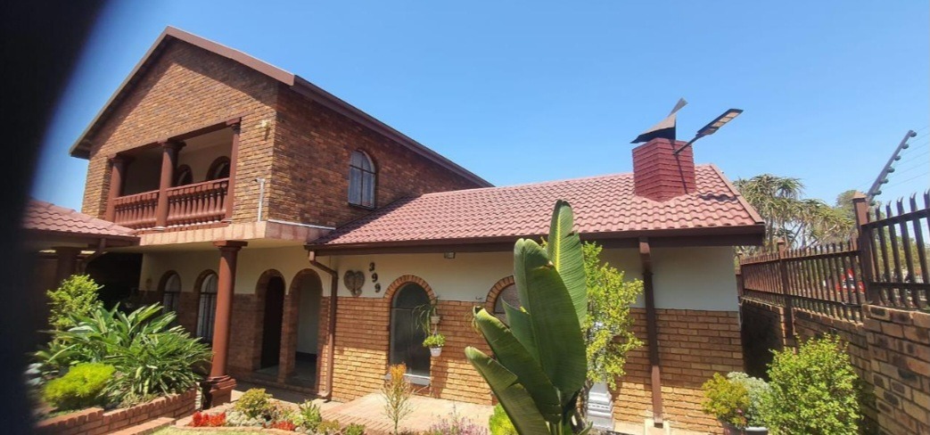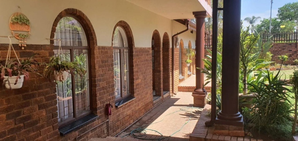 The home presents an attractive kerb appeal with its two-story brick facade, traditional red tiled roof, and charming arched windows, further enhanced by decorative columns. Security is a priority, with features including high brick walls, metal fencing, an electric fence, an access gate, security bars on windows, a security gate, an alarm system, and CCTV surveillance, ensuring peace of mind. Located in Mountain View, this property benefits from a tranquil mountain setting and offers modern fibre connectivity.