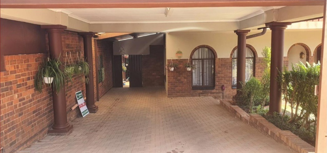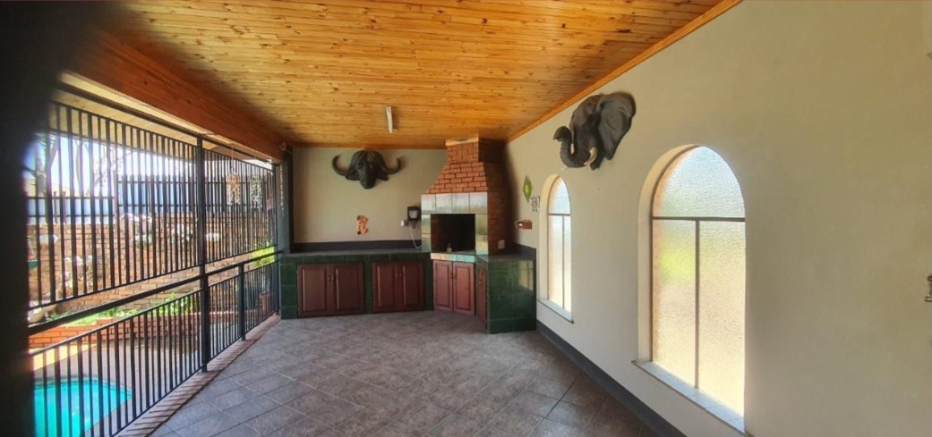 Step outside to discover a private oasis, perfect for outdoor enjoyment. The property features a swimming pool, ideal for cooling off on warm South African days. A spacious covered patio, complete with a built-in braai and a charming wooden paneled ceiling, overlooks the pool area, creating an excellent space for entertaining. The meticulously landscaped garden, featuring a central lawn and diverse plants, adds to the home's appeal, alongside a lapa for additional outdoor living. Ample parking is available, including a covered carport, providing convenience for residents and guests.