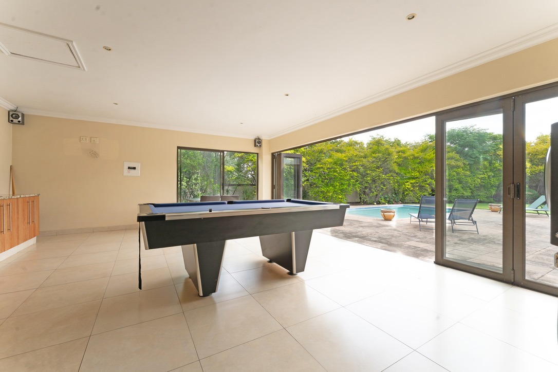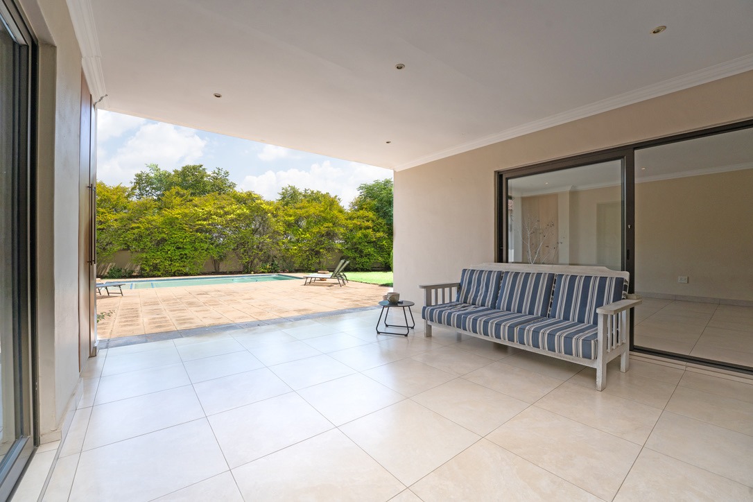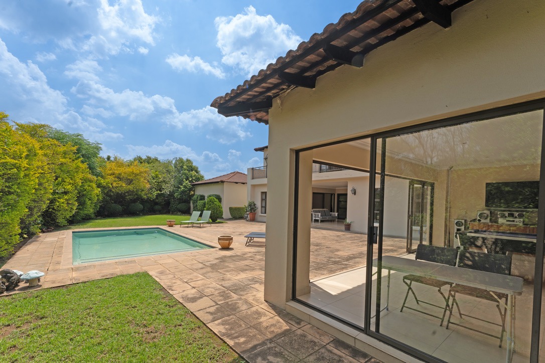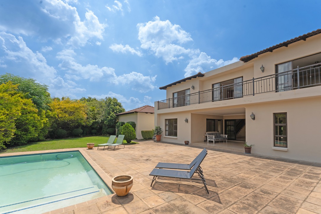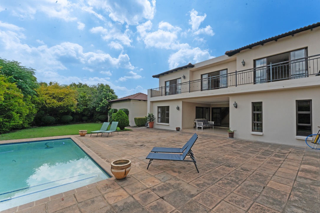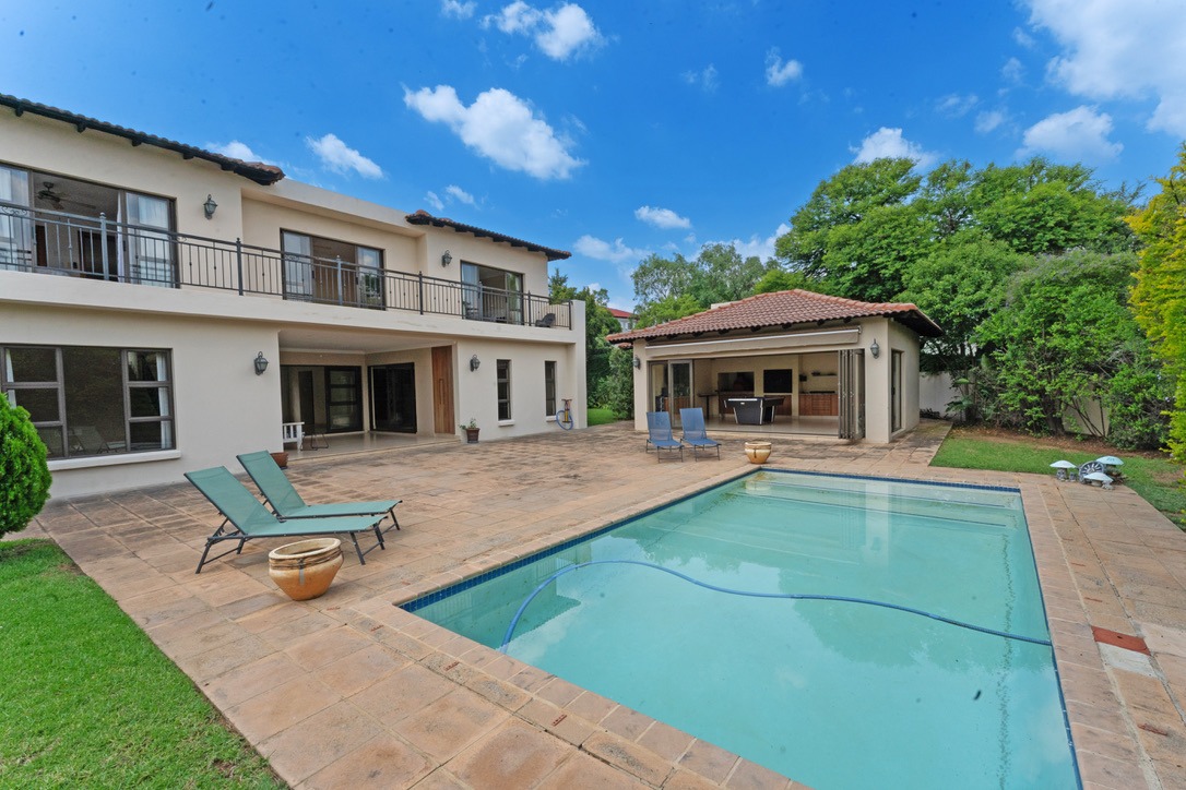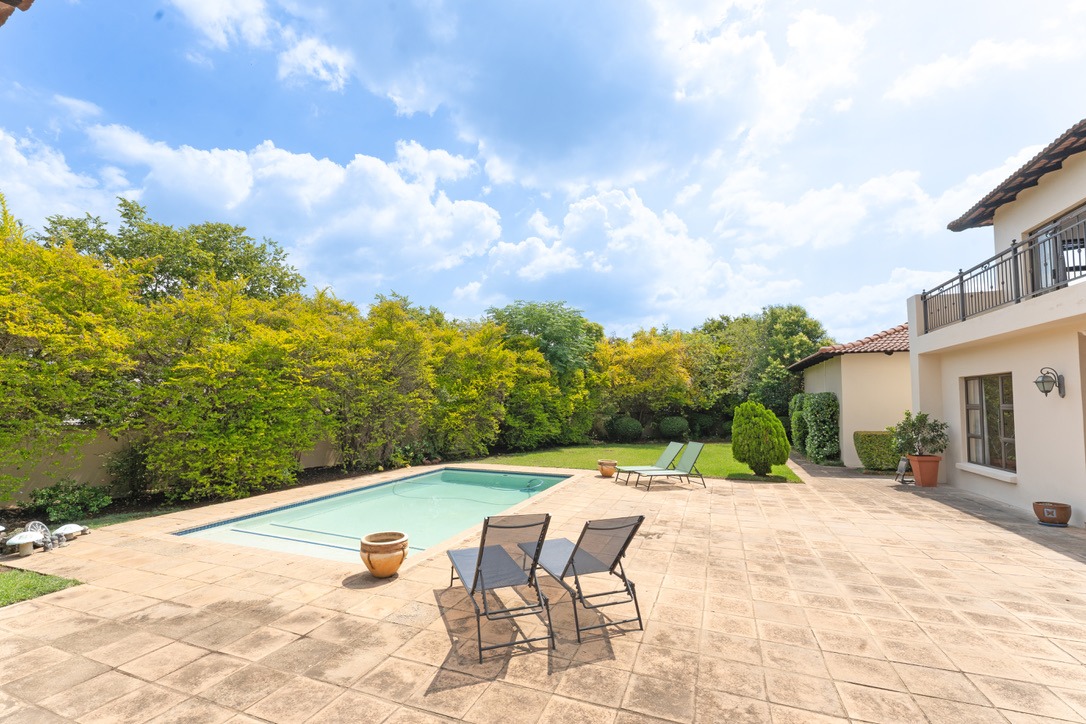 The beautifully landscaped garden features a large swimming pool, outdoor storeroom, and a full domestic suite with kitchenette and bathroom — ideal for staff or extended family.