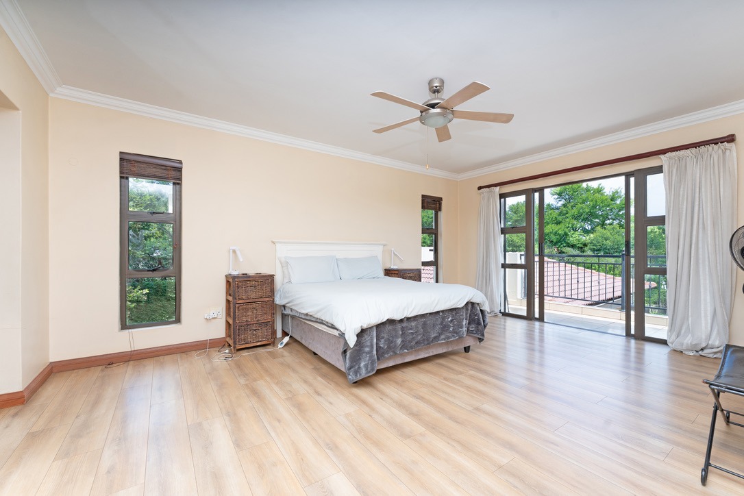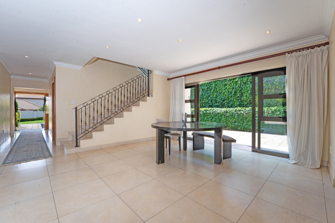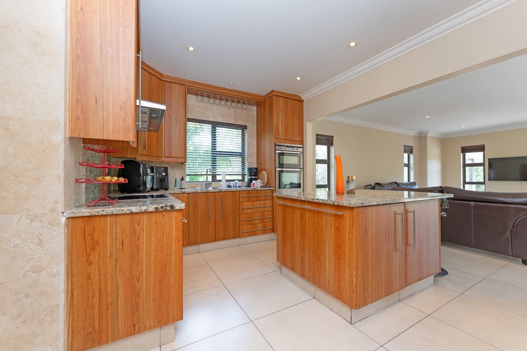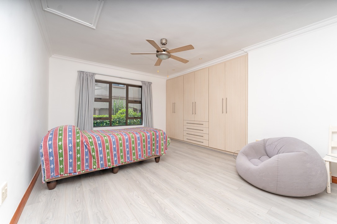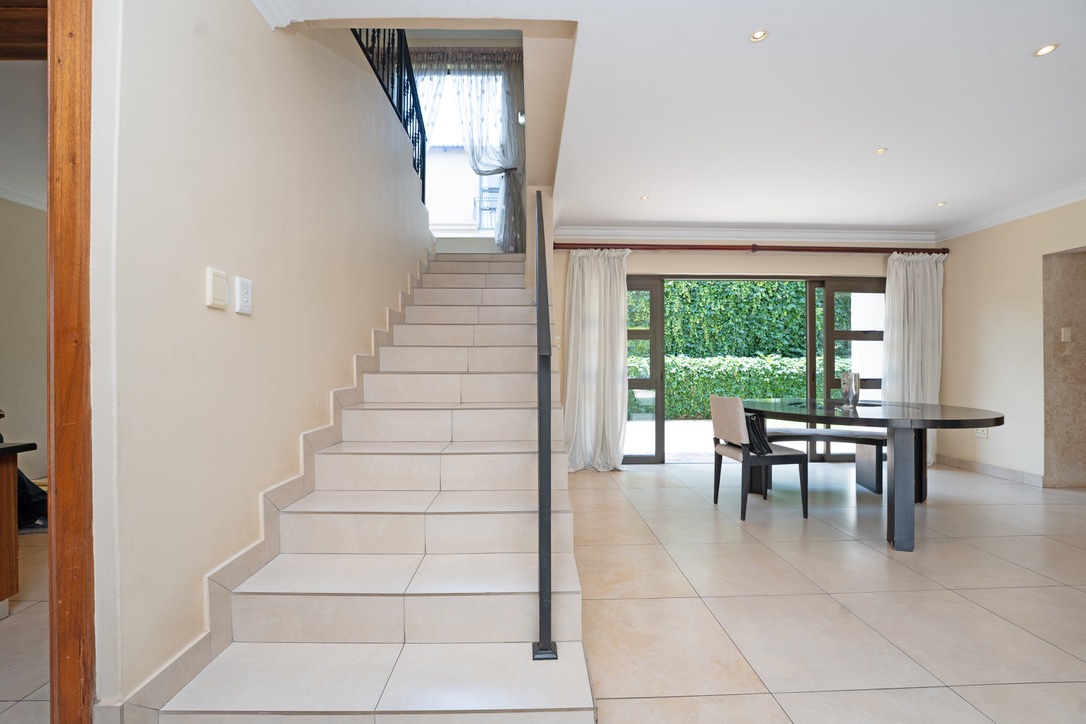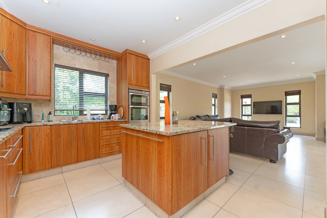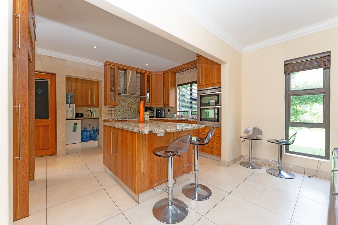The beautifully landscaped garden features a large swimming pool, outdoor storeroom, and a full domestic suite with kitchenette and bathroom — ideal for staff or extended family.
