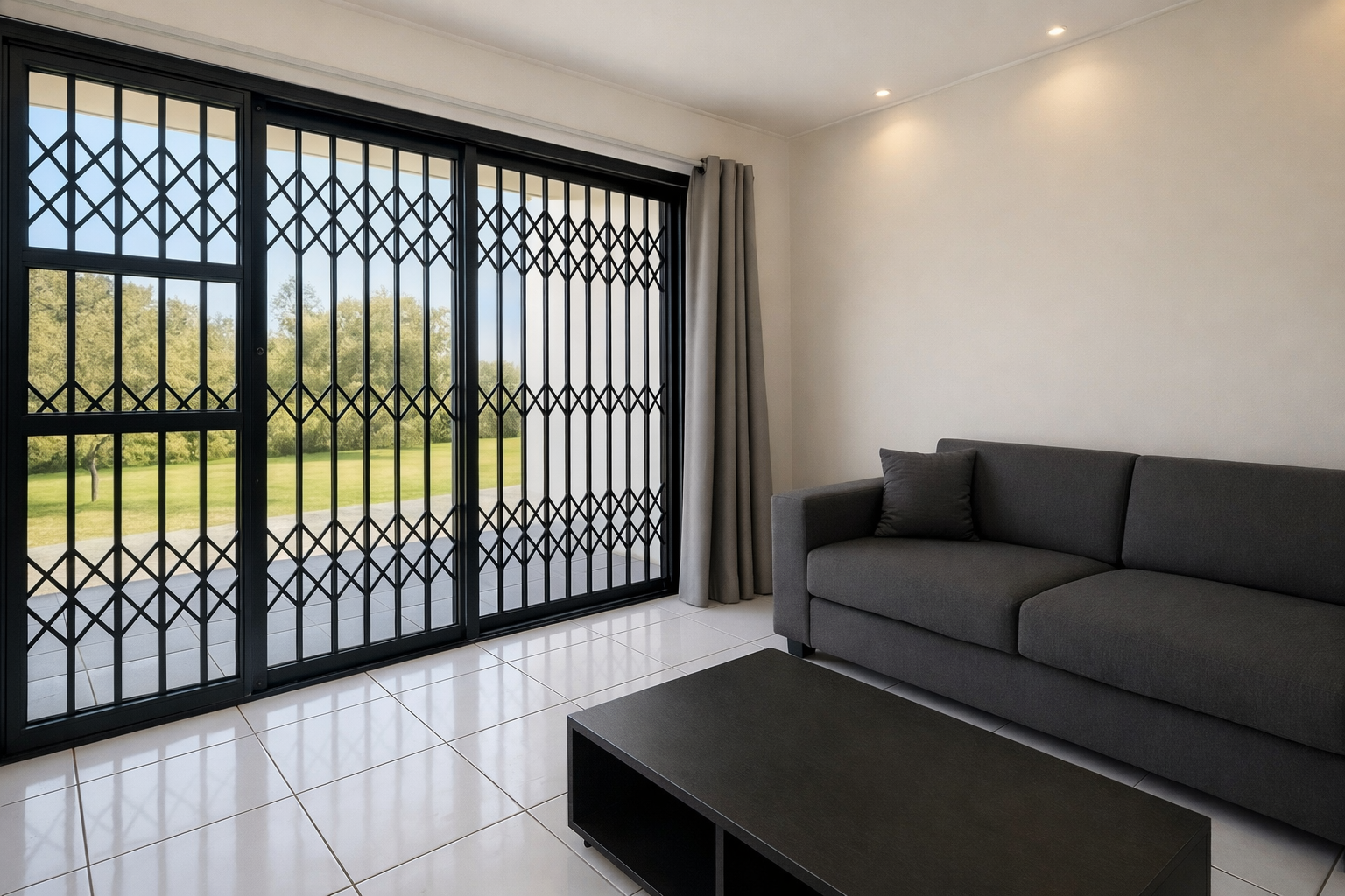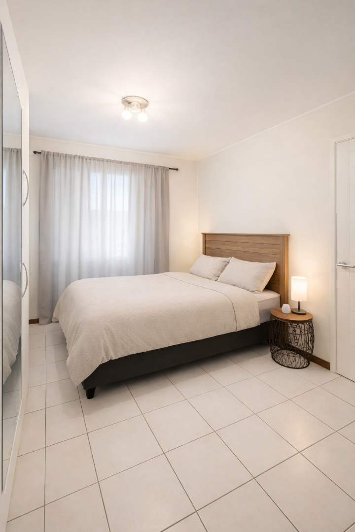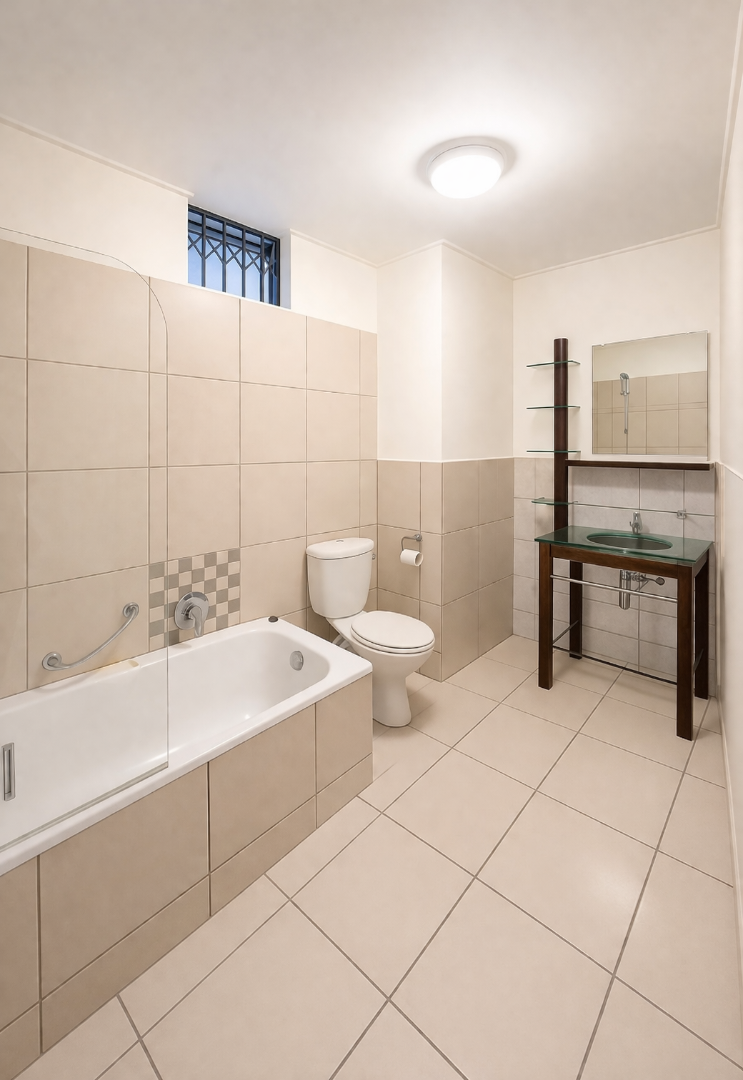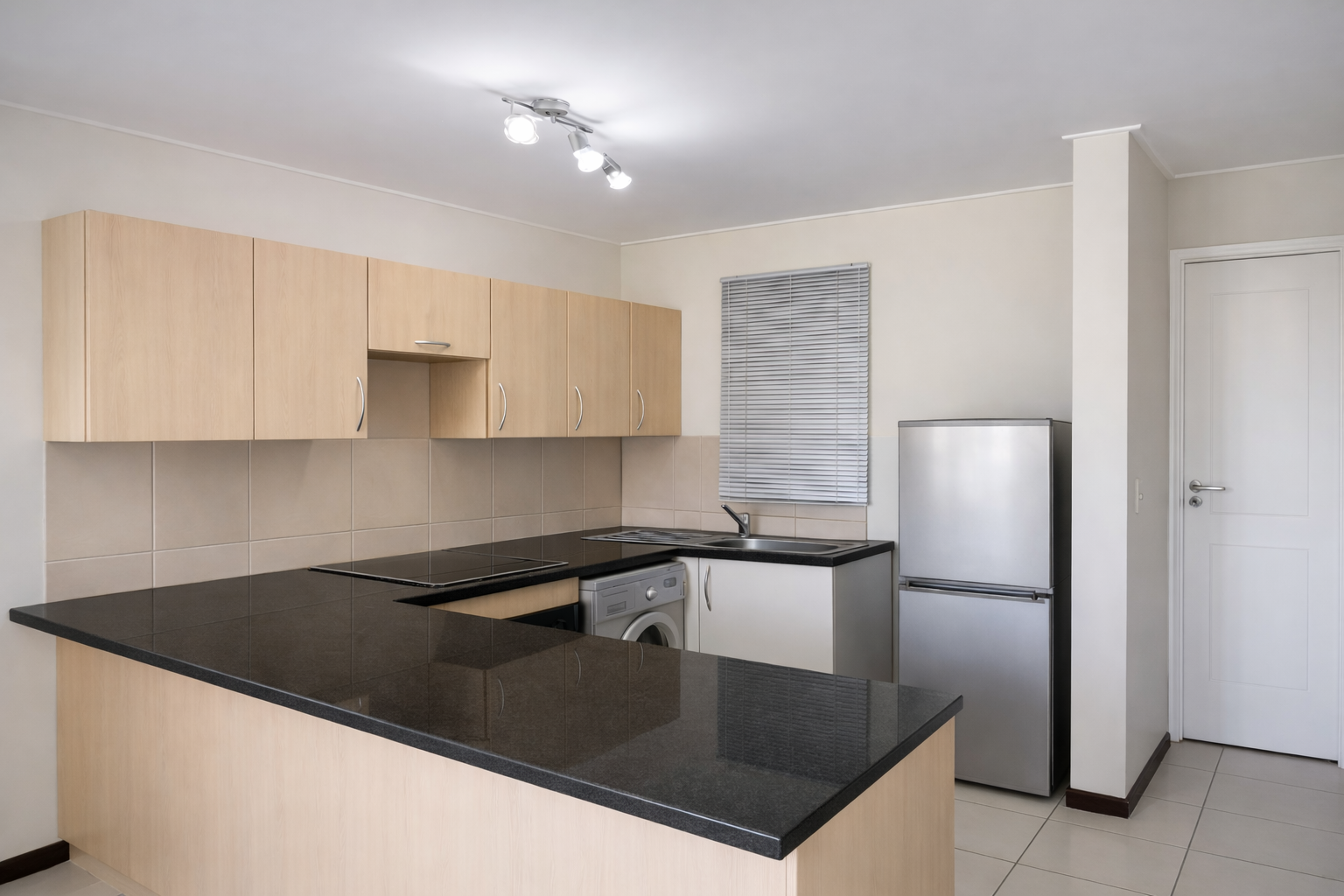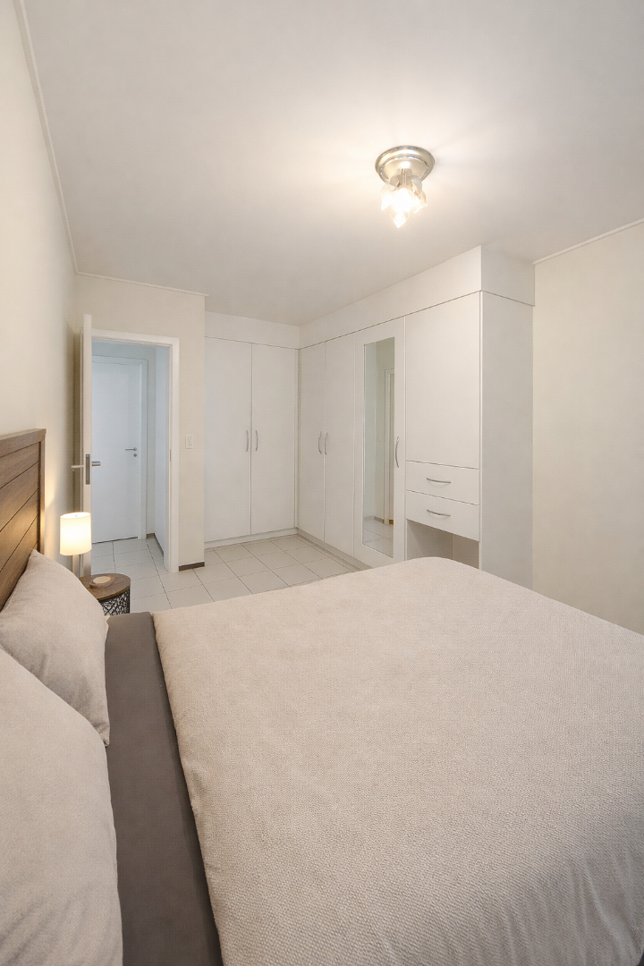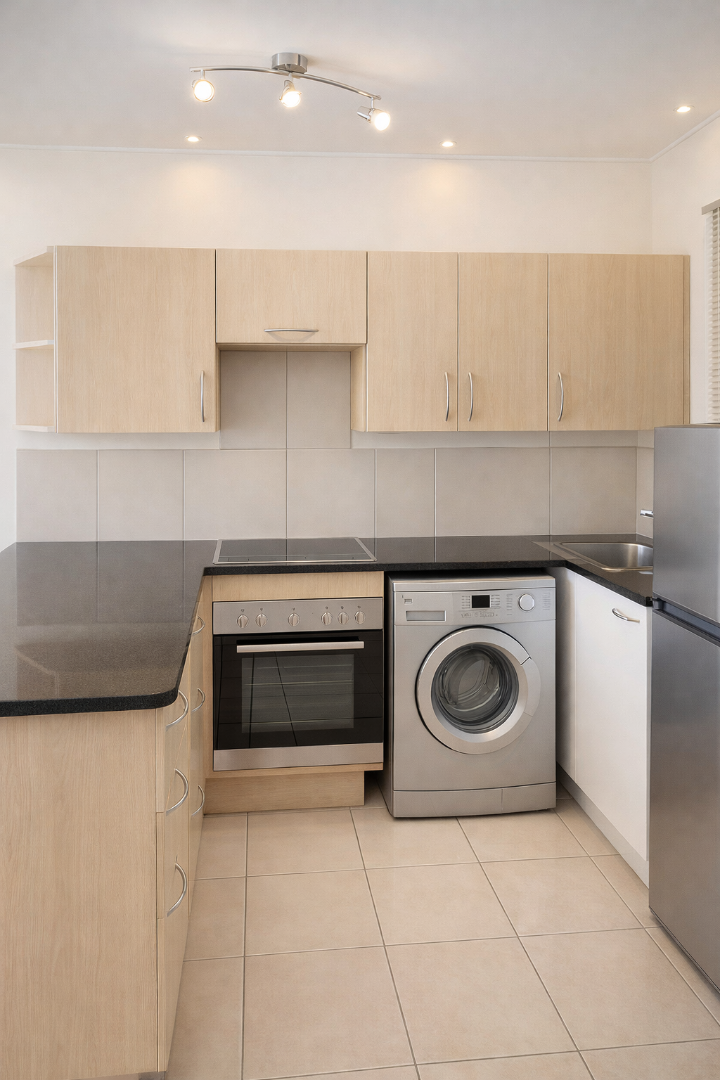 This one-bedroom apartment is a ground floor unit offering a practical open-plan layout with direct access to outdoor space. The kitchen is fitted with an under-counter oven and hob, space for a single-door fridge, and includes a washing machine connection. It is equipped with ample built-in cupboards and flows directly into the dining and lounge area. The living area is spacious, receives strong natural light, and opens onto a large patio.