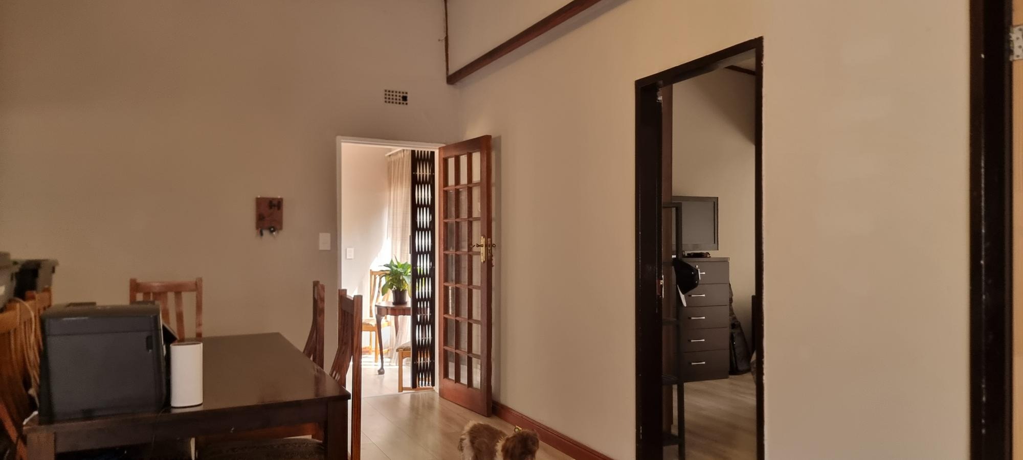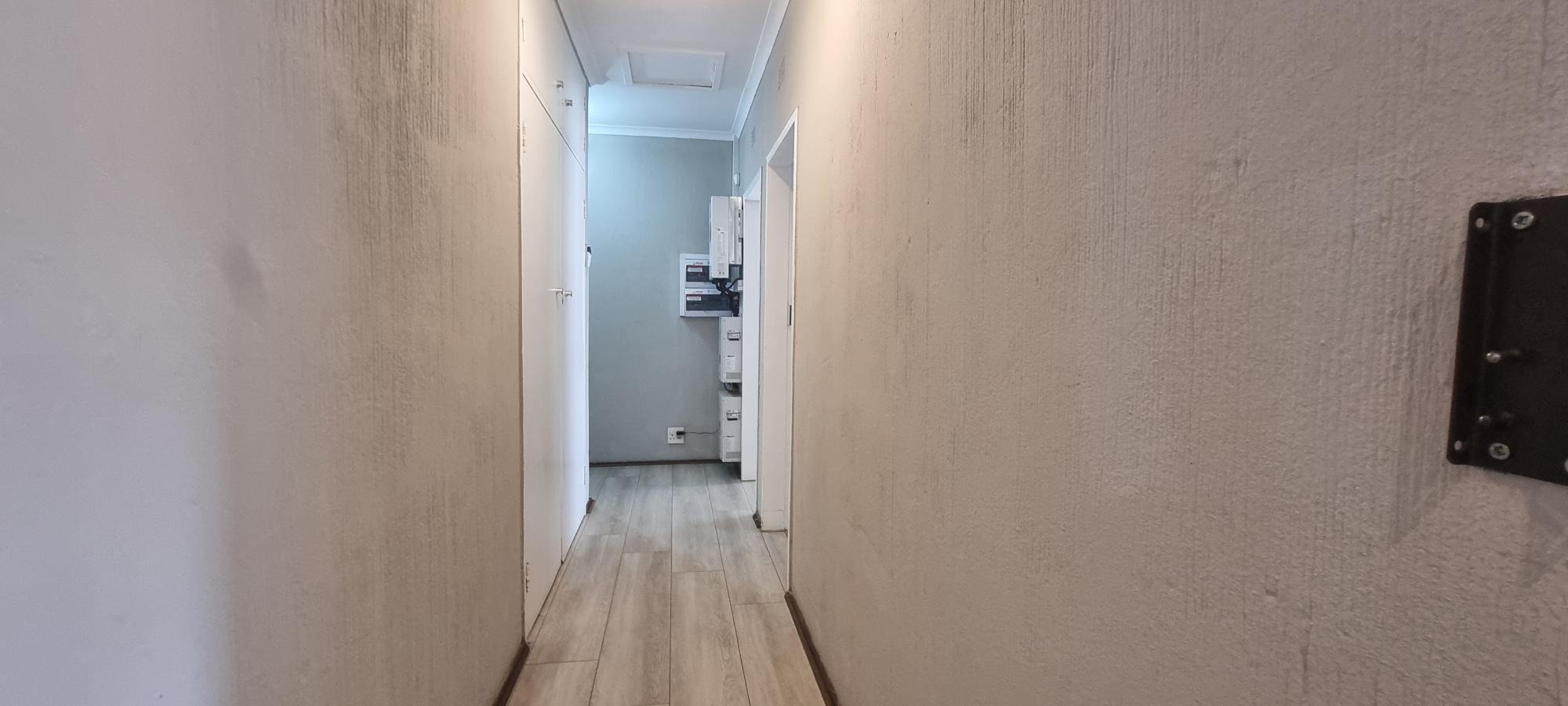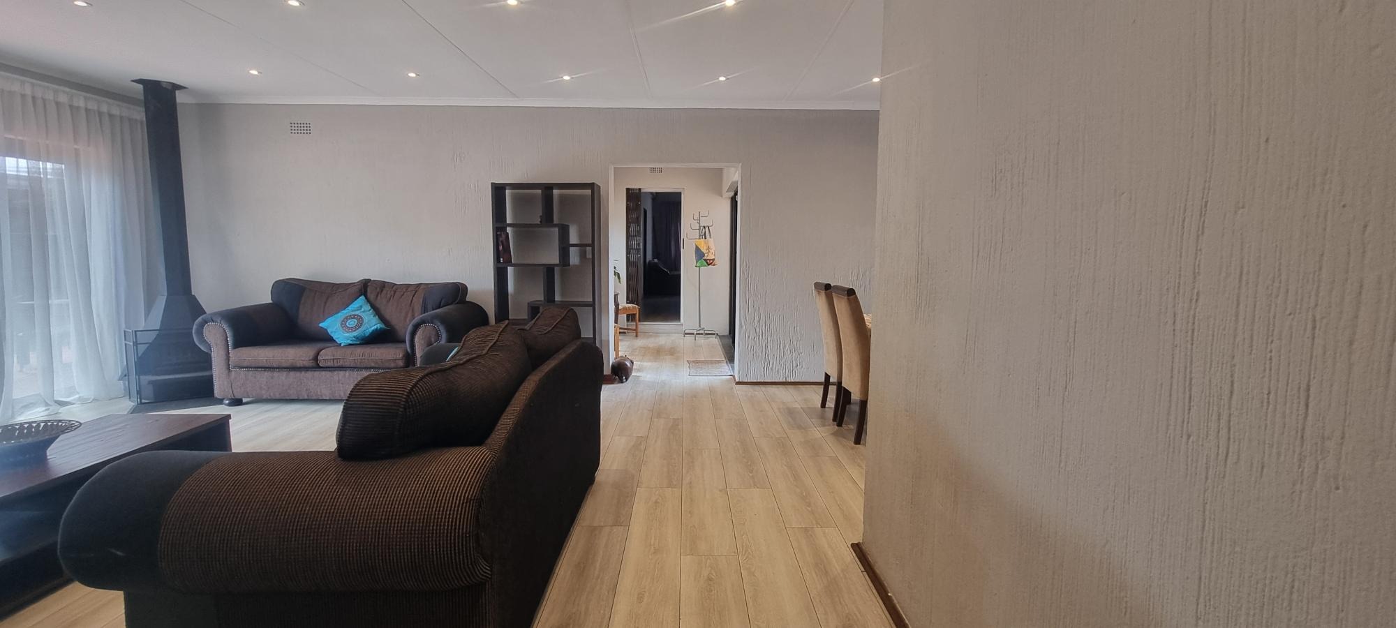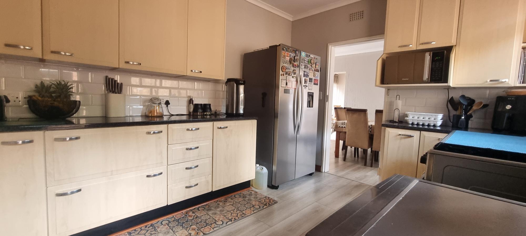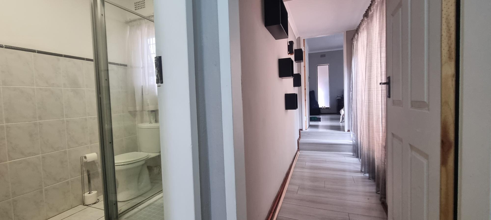 The property also offers covered parking for four vehicles, with plenty of additional parking space available. A rented solar system powers most of the home, and both the cottage and the second wing are fitted with gas geysers. Additional features include a gas stove and a conveniently located linen cupboard.