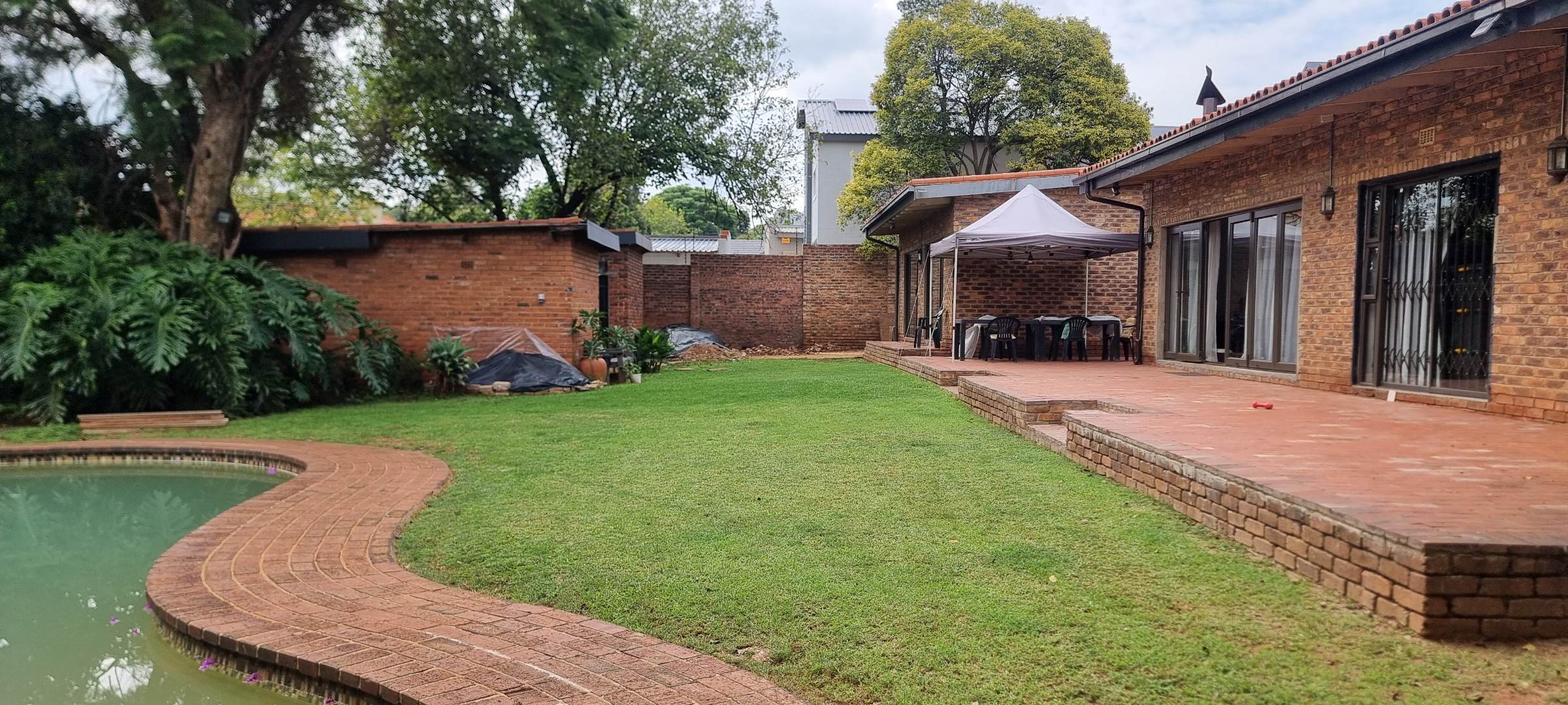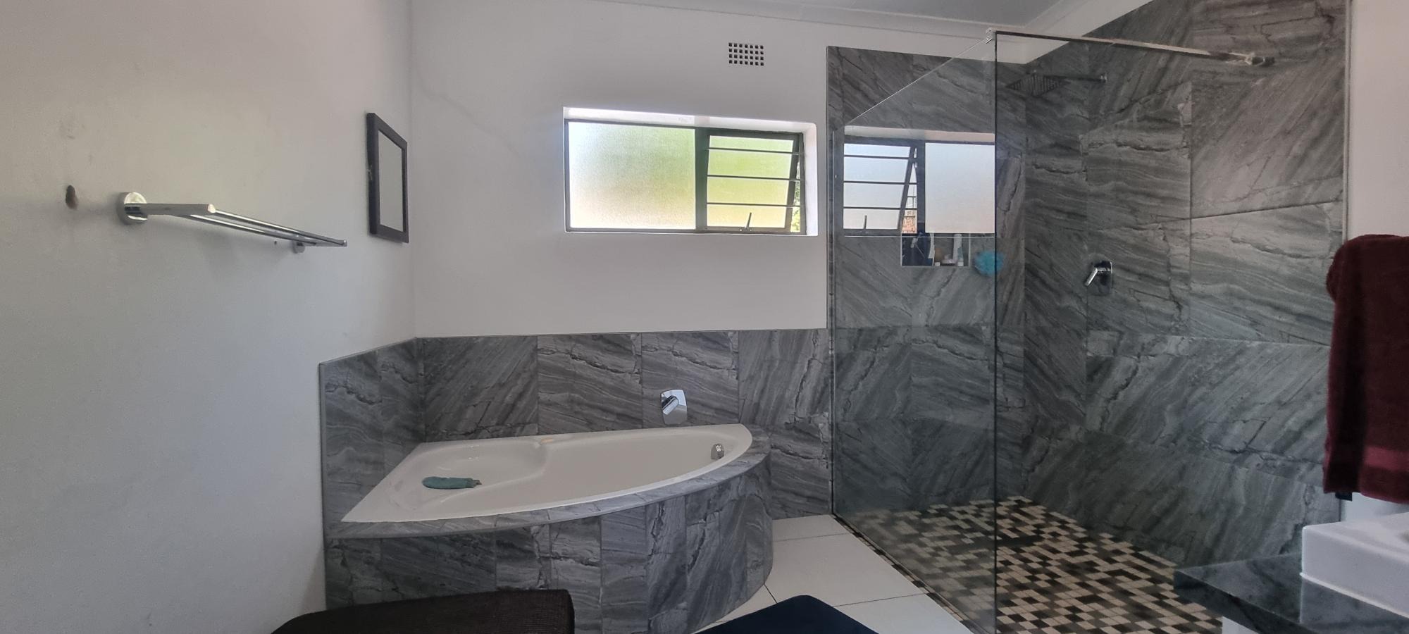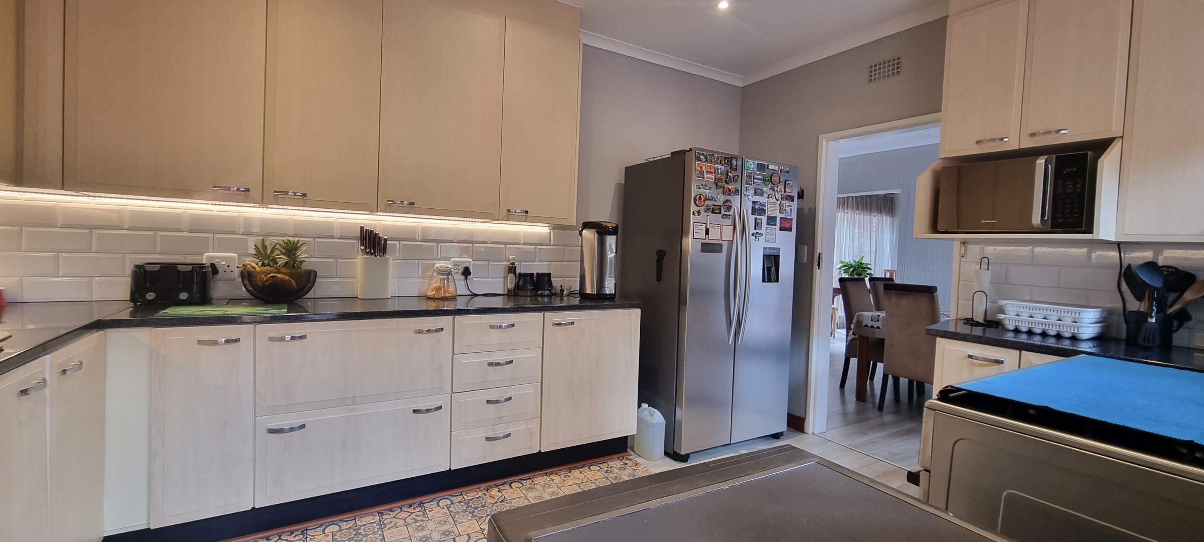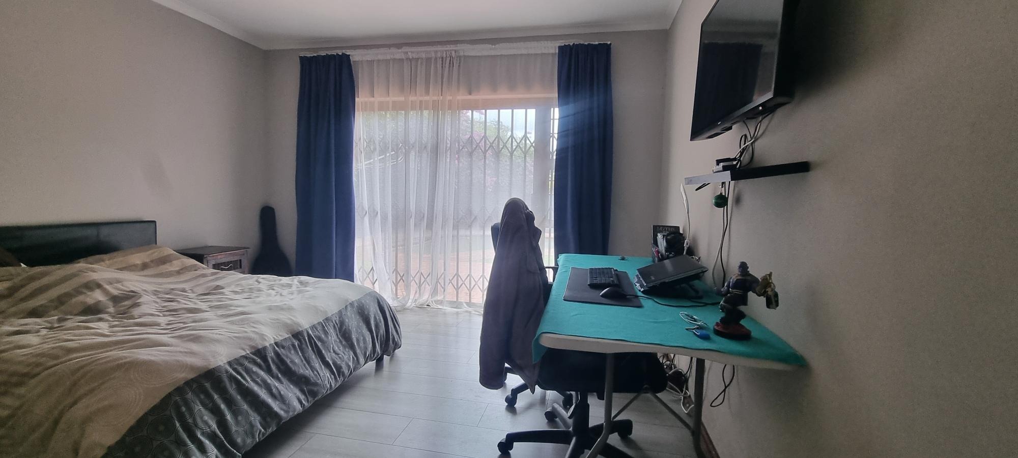 The property also offers covered parking for four vehicles, with plenty of additional parking space available. A rented solar system powers most of the home, and both the cottage and the second wing are fitted with gas geysers. Additional features include a gas stove and a conveniently located linen cupboard.