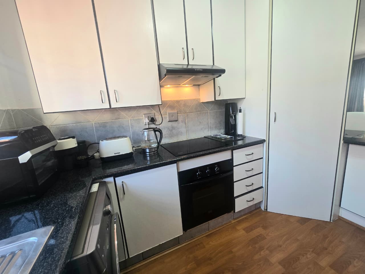 The residence features a modern, open-plan living area that seamlessly connects to a well-appointed kitchen, creating a spacious and cohesive environment. The living space benefits from excellent natural light and includes access to a private balcony, ideal for relaxation. The kitchen is equipped with an integrated oven and hob, an extractor fan, ample white cabinetry, dark granite-look countertops, a double sink, and a dedicated space for a washing machine, complemented by a convenient pantry. Air conditioning ensures comfort throughout the year.