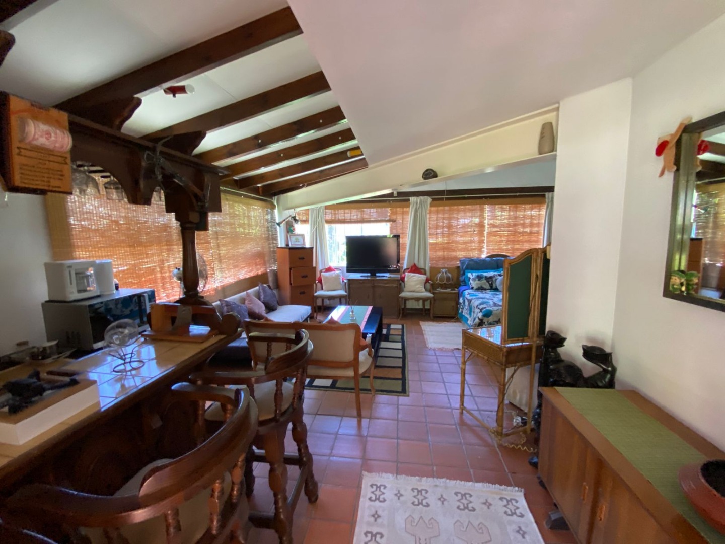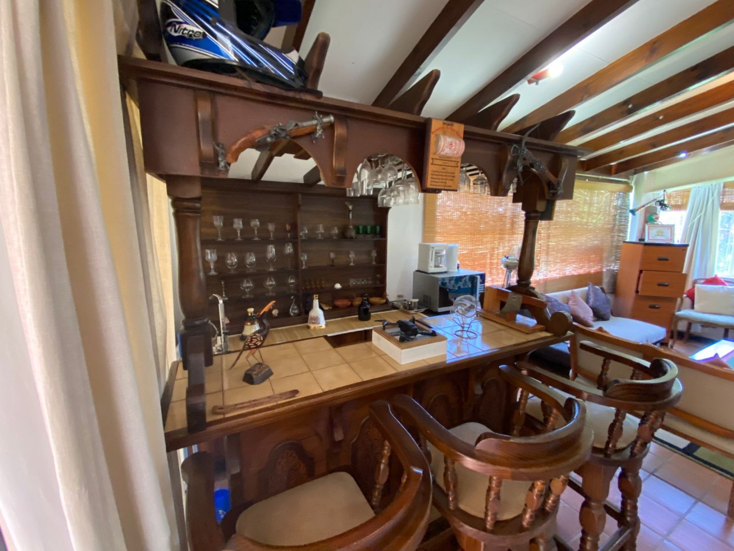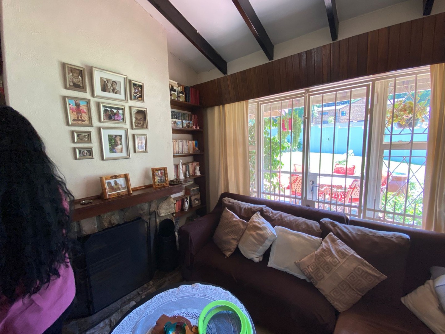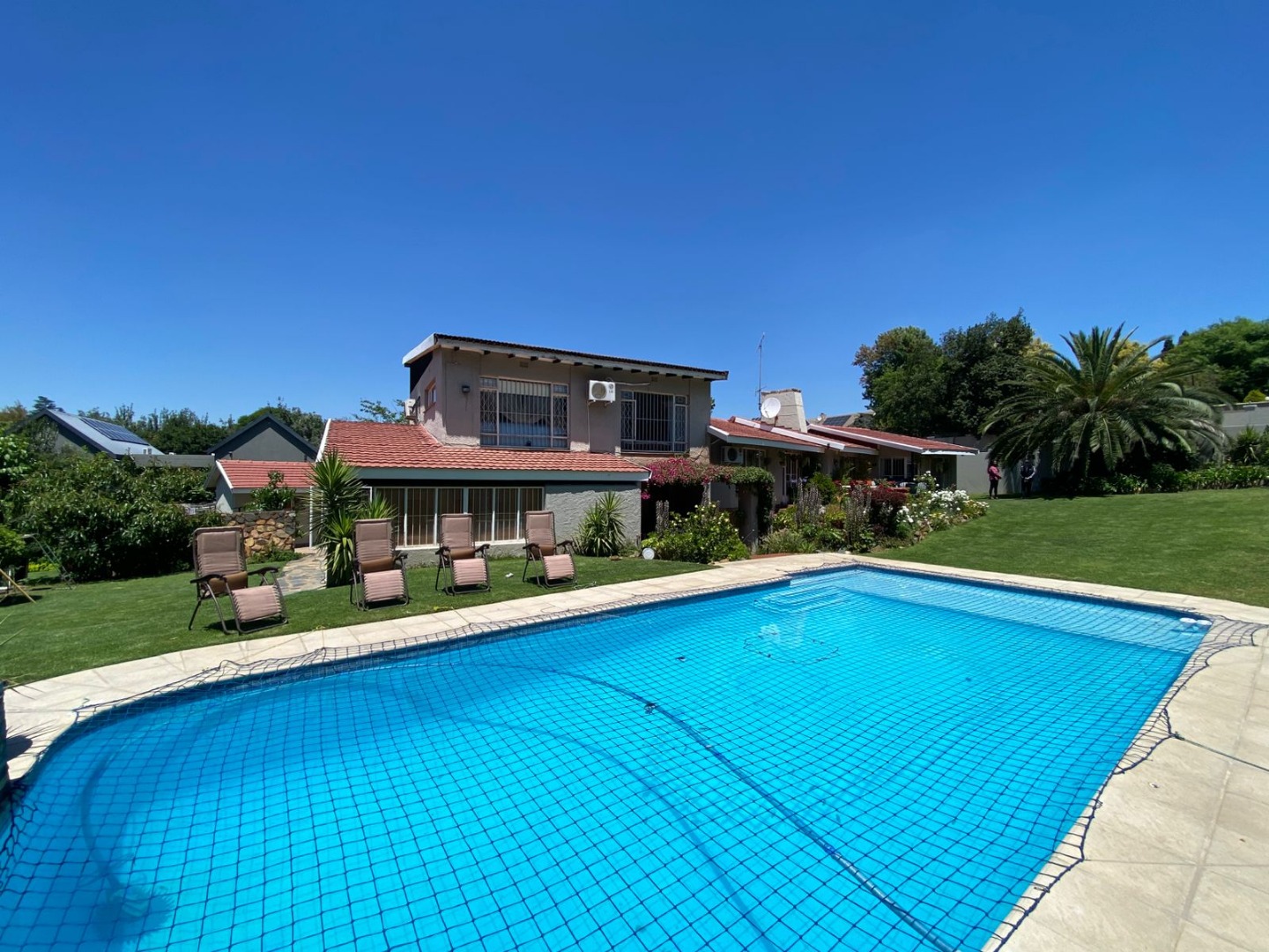 The property features four spacious bedrooms, two bathrooms, and a 50m² guest suite with its own en-suite bathroom – ideal for visitors or extended family. A series of interconnected living spaces include a formal dining room, a bar, and a welcoming lounge with a cosy fireplace that opens onto a covered patio overlooking the lush gardens and refurbished swimming pool. A comfortable study with its own fireplace provides the perfect retreat or work-from-home area.