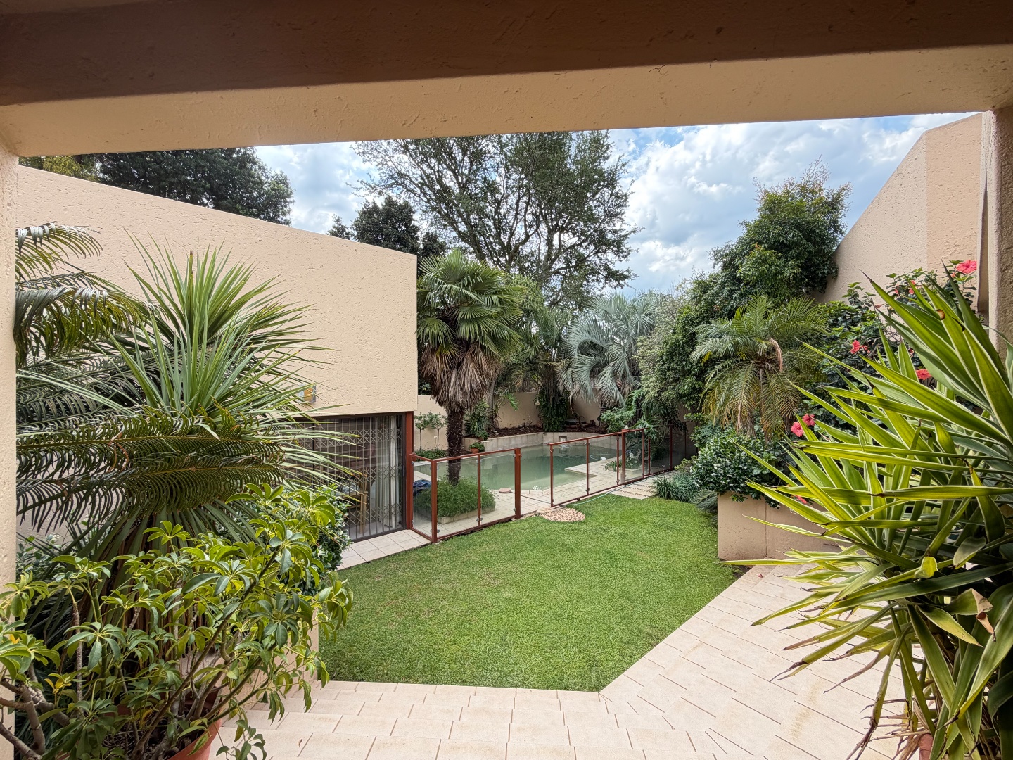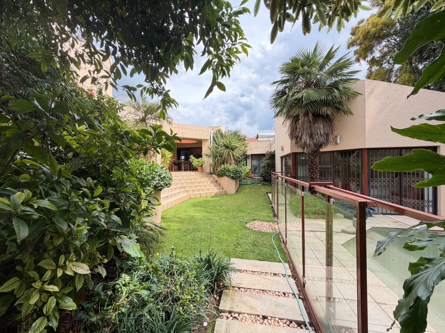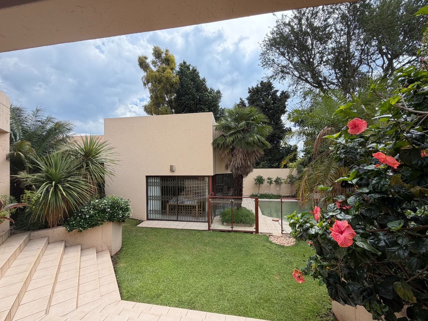 Discover this spacious family residence, perfectly situated on a generous 1032 sqm erf with an expansive 480 sqm floor size, in the sought-after Benmore Gardens, Sandton, South Africa. This multi-level home immediately impresses with its lush, well-maintained tropical garden and manicured lawn, creating a serene and private atmosphere from the moment you arrive. The interior boasts an intelligent layout designed for comfortable living and entertaining. Featuring an inviting entrance hall, two spacious lounges, a dedicated dining room, and a family TV room, there is ample space for every occasion. Abundant natural light floods the living areas, enhancing the open-plan feel. The modern kitchen is a culinary delight, equipped with extensive cream cabinetry, a gas hob, a stainless steel double oven, and a large central island, complemented by a convenient pantry. A dedicated study and a guest toilet add to the home's functionality. This residence offers four comfortable bedrooms, with 2.5 bathrooms, including a private en-suite, ensuring personal space and convenience for all occupants. Outdoor living is a highlight, with a spacious covered patio featuring a built-in braai, perfect for alfresco dining and entertaining. Beyond the patio, a private, fenced swimming pool area awaits, surrounded by the vibrant tropical garden. The property also includes two garages and two additional parking spaces, along with staff quarters, and is pet-friendly. Security is paramount, with comprehensive features including an alarm system, electric fencing, an access gate, intercom, burglar bars, security gates on doors, and a totally walled perimeter. The home also embraces sustainability with solar panels and a battery inverter, providing energy efficiency and peace of mind. Key Features: * 4 Bedrooms, 2.5 Bathrooms (1 en-suite) * Modern Kitchen with Gas Hob & Double Oven * Multiple Spacious Living Areas & Study * Covered Patio with Built-in Braai * Private Swimming Pool & Lush Garden * Double Garage & Additional Parking * Staff Quarters & Guest Toilet * Solar Panels & Battery Inverter * Advanced Security Features
