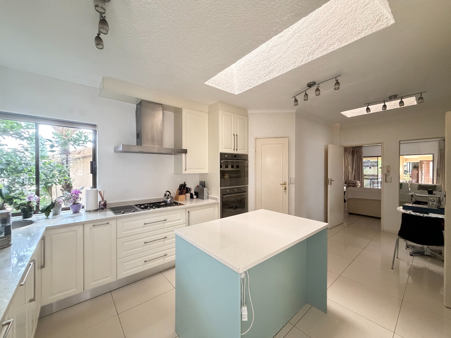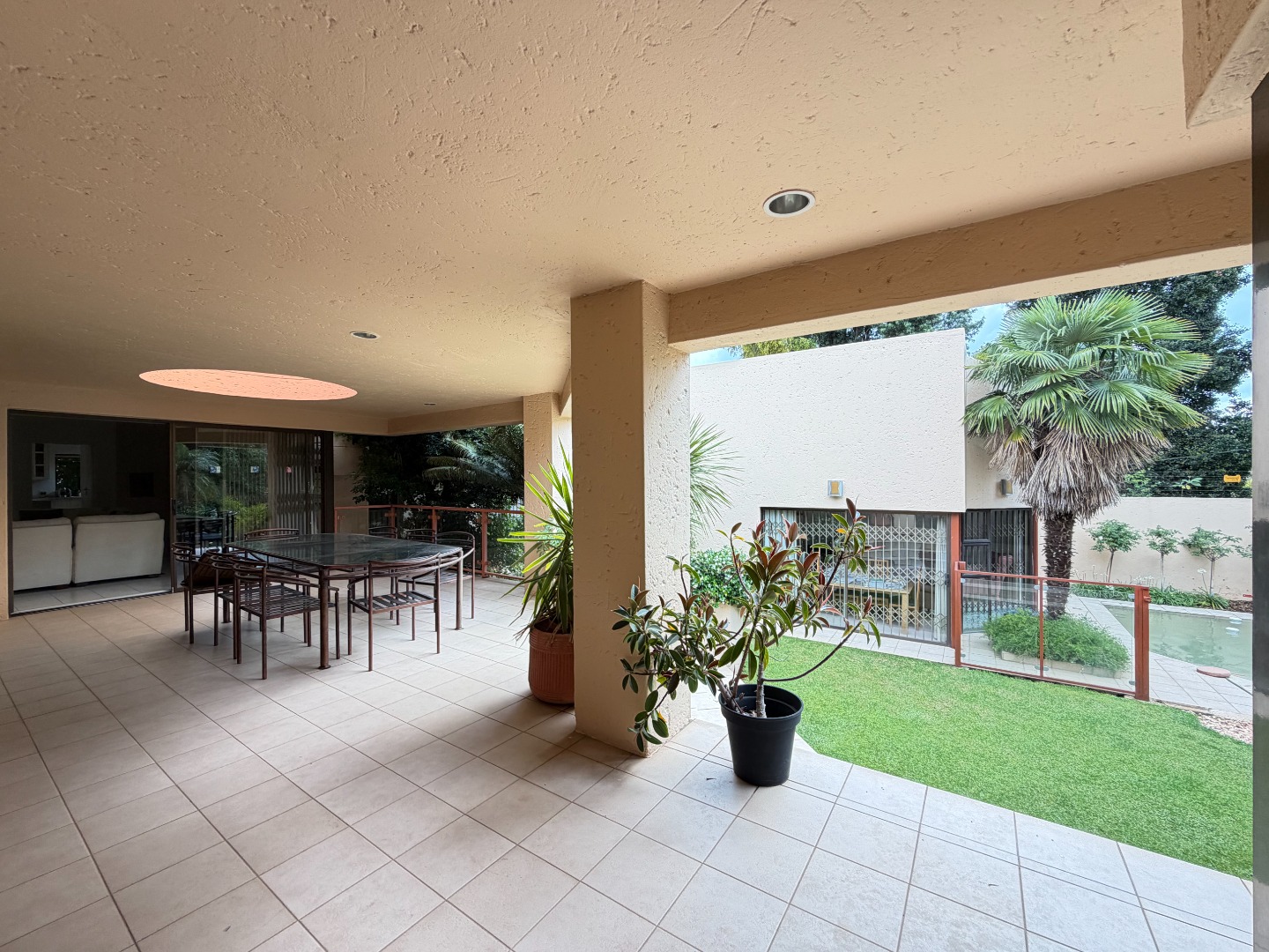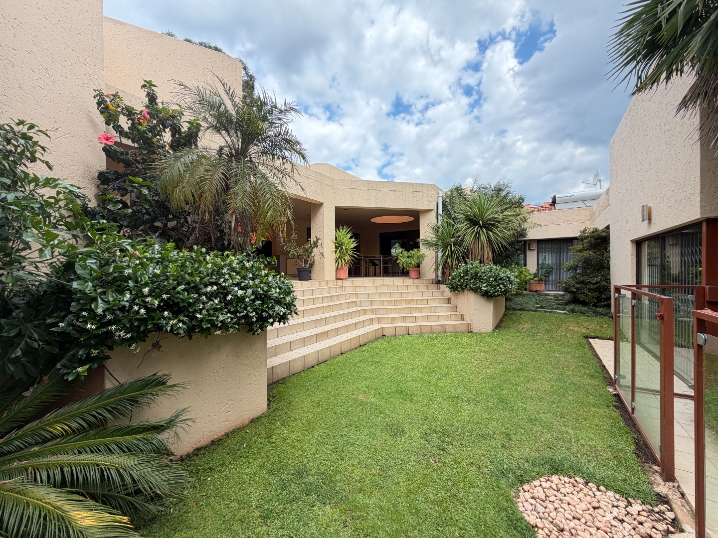 Discover this spacious family residence, perfectly situated on a generous 1032 sqm erf with an expansive 480 sqm floor size, in the sought-after Benmore Gardens, Sandton, South Africa. This multi-level home immediately impresses with its lush, well-maintained tropical garden and manicured lawn, creating a serene and private atmosphere from the moment you arrive. The interior boasts an intelligent layout designed for comfortable living and entertaining. Featuring an inviting entrance hall, two spacious lounges, a dedicated dining room, and a family TV room, there is ample space for every occasion. Abundant natural light floods the living areas, enhancing the open-plan feel. The modern kitchen is a culinary delight, equipped with extensive cream cabinetry, a gas hob, a stainless steel double oven, and a large central island, complemented by a convenient pantry. A dedicated study and a guest toilet add to the home's functionality. This residence offers four comfortable bedrooms, with 2.5 bathrooms, including a private en-suite, ensuring personal space and convenience for all occupants. Outdoor living is a highlight, with a spacious covered patio featuring a built-in braai, perfect for alfresco dining and entertaining. Beyond the patio, a private, fenced swimming pool area awaits, surrounded by the vibrant tropical garden. The property also includes two garages and two additional parking spaces, along with staff quarters, and is pet-friendly. Security is paramount, with comprehensive features including an alarm system, electric fencing, an access gate, intercom, burglar bars, security gates on doors, and a totally walled perimeter. The home also embraces sustainability with solar panels and a battery inverter, providing energy efficiency and peace of mind. Key Features: * 4 Bedrooms, 2.5 Bathrooms (1 en-suite) * Modern Kitchen with Gas Hob & Double Oven * Multiple Spacious Living Areas & Study * Covered Patio with Built-in Braai * Private Swimming Pool & Lush Garden * Double Garage & Additional Parking * Staff Quarters & Guest Toilet * Solar Panels & Battery Inverter * Advanced Security Features